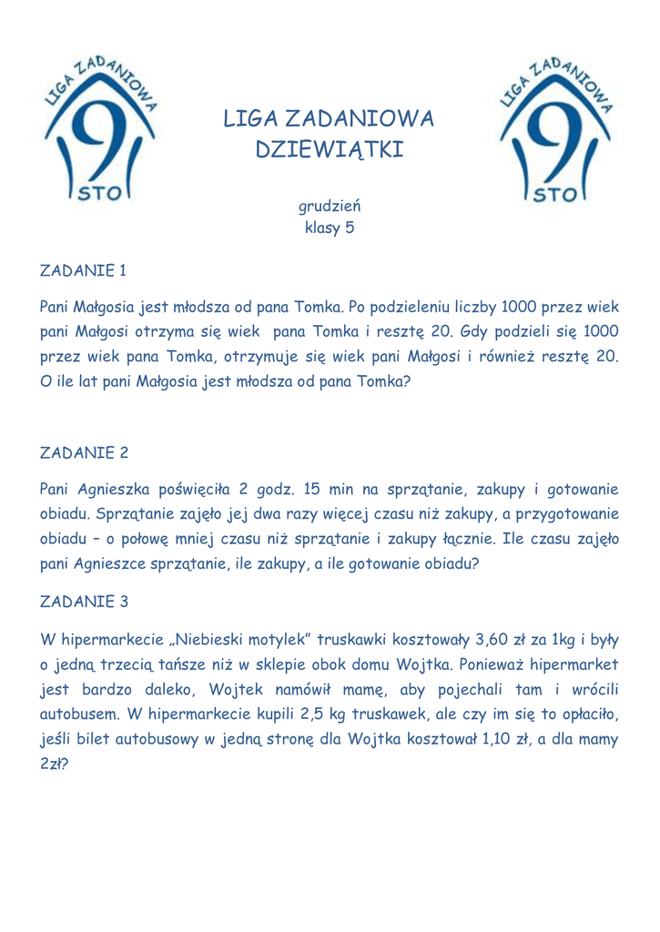 LIGA ZADANIOWA DZIEWIĄTKI grudzień klasy 5 ZADANIE 1 Pani Małgosia jest młodsza od pana Tomka. Po podzieleniu liczby 1000 przez wiek pani Małgosi otrzyma się wiek pana Tomka i resztę 20. Gdy podzieli się 1000 przez wiek pana Tomka, otrzymuje się wiek pani Małgosi i również resztę 20. O ile lat pani Małgosia jest młodsza od pana Tomka? ZADANIE 2 Pani Agnieszka poświęciła 2 godz. 15 min na sprzątanie, zakupy i gotowanie obiadu. Sprzątanie zajęło jej dwa razy więcej czasu niż zakupy, a przygotowanie obiadu – o połowę mniej czasu niż sprzątanie i zakupy łącznie. Ile czasu zajęło pani Agnieszce sprzątanie, ile zakupy, a ile gotowanie obiadu? ZADANIE 3 W hipermarkecie „Niebieski motylek” truskawki kosztowały 3,60 zł za 1kg i były o jedną trzecią tańsze niż w sklepie obok domu Wojtka. Ponieważ hipermarket jest bardzo daleko, Wojtek namówił mamę, aby pojechali tam i wrócili autobusem. W hipermarkecie kupili 2,5 kg truskawek, ale czy im się to opłaciło, jeśli bilet autobusowy w jedną stronę dla Wojtka kosztował 1,10 zł, a dla mamy 2zł?