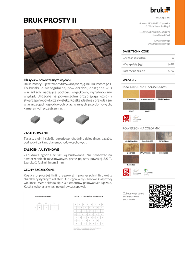 BRUK PROSTY II BRUK Sp. z o.o. ul. Nowa 28G, 44-352 Czyzowice (k. Wodzislawia Slaskiego) tel. 32 456 09 70 / 32 456 09 71 [email protected] www.bruk.info.pl www.modernline.info.pl DANE TECHNICZNE Grubość kostki (cm) Klasyka w nowoczesnym wydaniu. Bruk Prosty II jest zmodyfikowaną wersją Bruku Prostego I. To kostki o nieregularnej powierzchni, dostępne w 3 wariantach, nadające podłożu wyjątkowy, wyrafinowany wygląd. Ułożone na powierzchni przyciągają wzrok i stwarzają niepowtarzalny efekt. Kostka idealnie sprawdza się w aranżacjach ogrodowych oraz w innych przydomowych, kameralnych przestrzeniach. 6 Waga palety [kg] 1440 Ilość m2 na palecie 10,66 WZORNIK POWIERZCHNIA STANDARDOWA ŻÓŁTY BCQ CZERWONY BCQ SZARY GRAFIT BRĄZOWY BCQ POWIERZCHNIA COLORMIX ZASTOSOWANIE Tarasy, alejki i ścieżki ogrodowe, chodniki, dziedzińce, pasaże, podjazdy i parkingi dla samochodów osobowych. MUSZLOWY BCQ DIAMOND BCQ GOTHIC BCQ LIGHT BCQ BARWY JESIENI BCQ COLOR BCQ ZALECENIA UŻYTKOWE Zabudowa zgodna ze sztuką budowlaną. Nie stosować na nawierzchniach użytkowanych przez pojazdy powyżej 3,5 T. Szerokość fugi minimum 3 mm. DARK BCQ CECHY SZCZEGÓLNE Kostka o prostej linii brzegowej i powierzchni licowej z charakterystycznym reliefem. Odstępniki dystansowe klasycznej wielkości. Wzór składa się z 3 elementów pakowanych łącznie. Kostka wykonana w technologii dwuzasypowej. Zobacz ten produkt online w swoim smartfonie