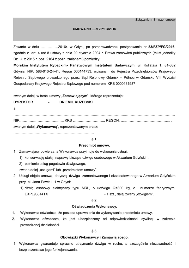Załącznik nr 3 - wzór umowy UMOWA NR …./FZP/FG/2016 Zawarta w dniu ……………2016r. w Gdyni, po przeprowadzeniu postępowania nr 83/FZP/FG/2016, zgodnie z art. 4 ust 8 ustawy z dnia 29 stycznia 2004 r. Prawo zamówień publicznych (tekst jednolity Dz. U. z 2015 r. poz. 2164 z późn. zmianami) pomiędzy: Morskim Instytutem Rybackim- Państwowym Instytutem Badawczym, ul. Kołłątaja 1, 81-332 Gdynia, NIP: 586-010-24-41, Regon 000144733, wpisanym do Rejestru Przedsiębiorców Krajowego Rejestru Sądowego prowadzonego przez Sąd Rejonowy Gdańsk – Północ w Gdańsku VIII Wydział Gospodarczy Krajowego Rejestru Sądowego pod numerem KRS 0000131987 zwanym dalej w treści umowy „Zamawiającym”, którego reprezentuje: DYREKTOR - DR EMIL KUZEBSKI a ……………………………………………………………..……………………..…………………………………… NIP:………….………………..…., KRS …….……………….., REGON: …..……………………………….. , zwanym dalej „Wykonawcą”, reprezentowanym przez: …………………………………………………………… § 1. Przedmiot umowy. 1. Zamawiający powierza, a Wykonawca przyjmuje do wykonania usługi: 1) konserwację stałą i naprawy bieżące dźwigu osobowego w Akwarium Gdyńskim, 2) pełnienie usług pogotowia dźwigowego, zwane dalej „usługami” lub „przedmiotem umowy”. 2. Usługi objęte umową dotyczą dźwigu zamontowanego i eksploatowanego w Akwarium Gdyńskim przy al. Jana Pawła II 1 w Gdyni: 1) dźwig osobowy elektryczny typu MRL, o udźwigu Q=800 kg, o numerze fabrycznym: - 1 szt., dalej zwany „dźwigiem”. EXPL93314TX § 2. Oświadczenia Wykonawcy. 1. Wykonawca oświadcza, że posiada uprawnienia do wykonywania przedmiotu umowy. 2. Wykonawca oświadcza, że jest ubezpieczony od odpowiedzialności cywilnej w zakresie prowadzonej działalności. § 3. Obowiązki Wykonawcy i Zamawiającego. 1. Wykonawca gwarantuje sprawne utrzymanie dźwigu w ruchu, a szczególnie niezawodność i bezpieczeństwo jego funkcjonowania. 2. Konserwacja i naprawy bieżące prowadzone będą przez personel Wykonawcy i pod jego nadzorem. 3. Do zadań Wykonawcy w ramach umowy należy: 1) bieżące wykonywanie konserwacji w celu zapewnienia pełnej sprawności technicznej i bezpieczeństwa eksploatacji dźwigu - zgodnie z obowiązującymi w tym zakresie przepisami, w tym m.in. przepisami Urzędu Dozoru Technicznego (UDT), Dokumentacją Techniczno – Ruchową, Instrukcją Obsługi i Konserwacji Dźwigów. Zestawienie podstawowych czynności konserwacyjnych zawiera załącznik nr 1 do umowy. 2) utrzymanie w ruchu wymienionego w § 1 ust. 2 dźwigu w okresie pomiędzy naprawami, 3) wykonywanie napraw bieżących wymienionych w załączniku nr 2 do umowy z zastrzeżeniem pkt 11 i 12, 4) podjęcie czynności naprawczych w ciągu 4 godz. od chwili zgłoszenia, 5) przygotowywanie dźwigu do badania okresowego przez Urząd Dozoru Technicznego, a także czynny udział w tym badaniu, 6) wykonywanie pomiarów instalacji i obwodów elektrycznych dźwigu w zakresie wymaganym przepisami UDT, 7) prowadzenie dokumentacji przeglądów i konserwacji dźwigu w zakresie wymaganym przepisami UDT, 8) uwalnianie pasażerów dźwigu osobowego unieruchomionych awaryjnie w terminie nie dłuższym niż 45 minut od chwili zgłoszenia, 9) wyłączenie dźwigu z eksploatacji w przypadkach zagrożenia bezpieczeństwa użytkowników oraz niezwłoczne zgłaszanie takich przypadków Zamawiającemu, 10) pisemne zgłaszanie Zamawiającemu konieczności wykonania remontów dźwigu i napraw nieobjętych niniejszą umową z podaniem zakresu niezbędnych robót oraz oferowanej ceny ich wykonania przez Wykonawcę, 11) przeprowadzanie na zlecenie Zamawiającego remontów innych niż wymienione w pkt 1 i 3 w oparciu o kosztorys zatwierdzony przez Zamawiającego przy czym zastosowana zostanie stawka robocizny R ……… zł/rg brutto, narzut kosztów pośrednich Kp …… %, zysk Z/od R, Kp, S/ …… %, 12) niniejszą umową nie są objęte prace, których wykonanie należy do Zamawiającego tj.: a) remonty kapitalne i modernizacje, b) konserwacja, naprawa lub wymiana pionu zasilającego, obwód siłowy i oświetleniowy dźwigu do rozdzielnicy dźwigowej w maszynowni oraz pionu oświetlenia szybu i maszynowni, c) prace murarskie i malarskie związane z konserwacją, naprawami szybu i maszynowni, 13) świadczenie usług pogotowia dźwigowego przez całą dobę we wszystkie dni w roku, przy czym w godzinach 6.00 - 18.00 usługi pogotowia będą ograniczone wyłącznie do uwalniania pasażerów uwięzionych w kabinie dźwigu. 4. Zgłoszenia o awariach będzie następowało telefonicznie, pod numer telefonu wskazany przez Wykonawcę tj. …………………………………………, czynny 24 godziny na dobę, 7 dni w tygodniu. 2 § 4. Sposób realizacji przedmiotu umowy. 1. Wszelkie prace konserwacyjne wymagające unieruchomienia dźwigu Wykonawca będzie wykonywał w godzinach 20.00 - 6.00. Zamawiający dopuszcza możliwość wyłączenia dźwigu z eksploatacji w innych godzinach, po uprzednim ich uzgodnieniu z Zamawiającym. 2. Strony wskazują następujące osoby upoważnione do wzajemnych kontaktów roboczych związanych z realizacją niniejszej umowy: 1) z ramienia Zamawiającego - …………….., tel. …………………………………, fax nr ………………. e-mail: ……………………………… 2) z ramienia Wykonawcy – .........................................................., tel. …………………………., fax nr ………………., e-mail ………………………… § 5. Wynagrodzenie. 1. Za świadczenie usług określonych w § 3 ust. 3 pkt.1,2,3 i 6 Wykonawca będzie otrzymywał zryczałtowane wynagrodzenie miesięczne brutto, określone w ofercie Wykonawcy z dnia .........................2016 r. w wysokości brutto.................... zł. 2. Należno