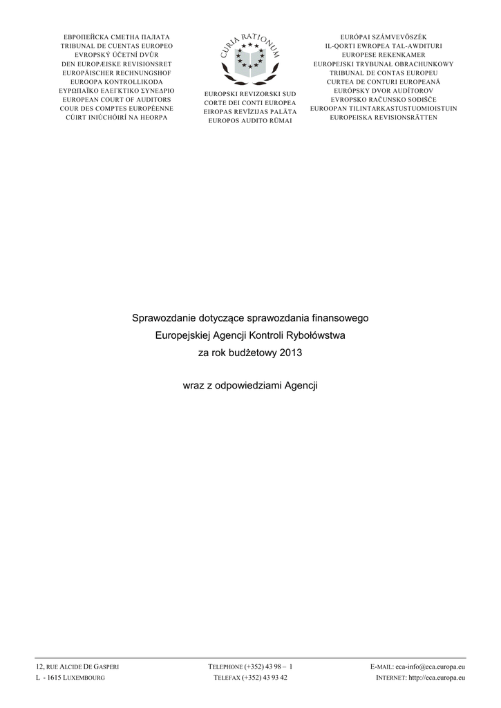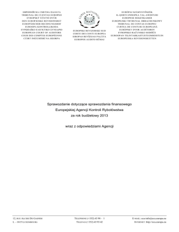 ЕВРОПЕЙСКА СМЕТНА ПАЛАТА TRIBUNAL DE CUENTAS EUROPEO EVROPSKÝ ÚČETNÍ DVŮR DEN EUROPÆISKE REVISIONSRET EUROPÄISCHER RECHNUNGSHOF EUROOPA KONTROLLIKODA ΕΥΡΩΠΑΪΚΟ ΕΛΕΓΚΤΙΚΟ ΣΥΝΕΔΡΙO EUROPEAN COURT OF AUDITORS COUR DES COMPTES EUROPÉENNE CÚIRT INIÚCHÓIRÍ NA HEORPA EUROPSKI REVIZORSKI SUD CORTE DEI CONTI EUROPEA EIROPAS REVĪZIJAS PALĀTA EUROPOS AUDITO RŪMAI EURÓPAI SZÁMVEVŐSZÉK IL-QORTI EWROPEA TAL-AWDITURI EUROPESE REKENKAMER EUROPEJSKI TRYBUNAŁ OBRACHUNKOWY TRIBUNAL DE CONTAS EUROPEU CURTEA DE CONTURI EUROPEANĂ EURÓPSKY DVOR AUDÍTOROV EVROPSKO RAČUNSKO SODIŠČE EUROOPAN TILINTARKASTUSTUOMIOISTUIN EUROPEISKA REVISIONSRÄTTEN Sprawozdanie dotyczące sprawozdania finansowego Europejskiej Agencji Kontroli Rybołówstwa za rok budżetowy 2013 wraz z odpowiedziami Agencji 12, RUE ALCIDE DE GASPERI L - 1615 LUXEMBOURG TELEPHONE (+352) 43 98 – 1 TELEFAX (+352) 43 93 42 E-MAIL: [email protected] INTERNET: http://eca.europa.eu 2 WPROWADZENIE 1. Europejska Agencja Kontroli Rybołówstwa (zwana dalej „Agencją”, inaczej „EFCA”) z siedzibą w Vigo została ustanowiona rozporządzeniem Rady (WE) nr 768/2005 1. Głównym zadaniem Agencji jest organizowanie operacyjnej koordynacji działań w zakresie kontroli i inspekcji połowów, prowadzonych przez państwa członkowskie w celu zapewnienia skutecznego i jednolitego stosowania wspólnej polityki rybołówstwa 2. INFORMACJE LEŻĄCE U PODSTAW POŚWIADCZENIA WIARYGODNOŚCI 2. Przyjęte przez Trybunał podejście kontrolne obejmuje analityczne procedury kontrolne, bezpośrednie badanie transakcji oraz ocenę kluczowych mechanizmów kontrolnych w stosowanych przez Agencję systemach nadzoru i kontroli. Elementami uzupełniającymi to podejście są dowody uzyskane na podstawie prac innych kontrolerów (w stosownych przypadkach) oraz analiza oświadczeń kierownictwa. POŚWIADCZENIE WIARYGODNOŚCI 3. Na mocy postanowień art. 287 Traktatu o funkcjonowaniu Unii Europejskiej (TFUE) Trybunał zbadał: a) roczne sprawozdanie finansowe Agencji obejmujące sprawozdanie finansowe 3 oraz sprawozdanie z wykonania budżetu 4 za rok budżetowy zakończony 31 grudnia 2013 r., jak również 1 Dz.U. L 128 z 21.5.2005, s. 1. 2 Do celów informacyjnych w załączniku II skrótowo przedstawiono kompetencje i działania Agencji. 3 Sprawozdanie finansowe składa się z bilansu oraz rachunku wyniku ekonomicznego, rachunku przepływów pieniężnych, zestawienia zmian w aktywach netto oraz opisu znaczących zasad (polityki) rachunkowości i informacji dodatkowej. ADB001953PL04-14PP-CH084-14APCFIN-RAS-2013_EFCA-TR.DOC 1.7.2014 3 b) legalność i prawidłowość transakcji leżących u podstaw tego sprawozdania. Zadania kierownictwa 4. Kierownictwo odpowiada za sporządzenie i rzetelną prezentację rocznego sprawozdania finansowego Agencji oraz za legalność i prawidłowość transakcji leżących u jego podstaw 5: a) Zadania kierownictwa w zakresie rocznego sprawozdania finansowego Agencji obejmują: zaprojektowanie, wdrożenie i utrzymywanie systemu kontroli wewnętrznej umożliwiającego sporządzenie i rzetelną prezentację sprawozdania finansowego, które nie zawiera istotnych zniekształceń spowodowanych nadużyciem lub błędem, a także wybór i stosowanie właściwych zasad (polityki) rachunkowości na podstawie zasad rachunkowości przyjętych przez księgowego Komisji 6 oraz sporządzanie szacunków księgowych, które są racjonalne w danych okolicznościach. Dyrektor zatwierdza roczne sprawozdanie finansowe Agencji po tym, jak zostanie ono sporządzone przez księgowego Agencji na podstawie wszystkich dostępnych informacji. Do sprawozdania finansowego księgowy dołącza oświadczenie, w którym stwierdza między innymi, czy uzyskał wystarczającą pewność, że daje ono prawdziwy i rzetelny obraz sytuacji finansowej Agencji we wszystkich istotnych aspektach. 4 Sprawozdanie z wykonania budżetu obejmuje rachunek wyniku budżetowego wraz z załącznikiem. 5 Art. 39 i 50 rozporządzenia delegowanego Komisji (UE) nr 1271/2013 (Dz.U. L 328 z 7.12.2013, s. 42). 6 Zasady rachunkowości przyjęte przez księgowego Komisji opierają się na Międzynarodowych Standardach Rachunkowości Sektora Publicznego (IPSAS) wydanych przez Międzynarodową Federację Księgowych, a w kwestiach nimi nieobjętych – na Międzynarodowych Standardach Rachunkowości (MSR) / Międzynarodowych Standardach Sprawozdawczości Finansowej (MSSF) wydanych przez Radę Międzynarodowych Standardów Rachunkowości. ADB001953PL04-14PP-CH084-14APCFIN-RAS-2013_EFCA-TR.DOC 1.7.2014 4 b) Zadania kierownictwa w zakresie legalności i prawidłowości transakcji leżących u podstaw rozliczeń i zgodności z zasadą należytego zarządzania finansami obejmują zaprojektowanie, wdrożenie i utrzymywanie skutecznego i wydajnego systemu kontroli wewnętrznej, w tym właściwego nadzoru, jak również podejmowanie odpowiednich działań w celu zapobiegania nieprawidłowościom i nadużyciom finansowym oraz – w razie konieczności – wszczynanie postępowań sądowych w celu odzyskania nienależnie wypłaconych lub niewłaściwie wykorzystanych środków finansowych. Zadania Trybunału 5. Zadaniem Trybunału jest przedstawienie Parlamentowi Europejskiemu i Radzie 7, na podstawie przeprowadzonej przez siebie kontroli, poświadczenia wiarygodności dotyczącego rocznego sprawozdania finansowego Agencji oraz legalności i prawidłowości transakcji leżących u podstaw tego sprawozdania. Trybunał przeprowadza kontrolę zgodnie z wydanymi przez IFAC Międzynarodowymi Standardami Rewizji Finansowej i kodeksem etyki oraz z Międzynarodowymi Standardami Najwyższych Organów Kontroli wydanymi przez INTOSAI (ISSAI). Zgodnie z tymi standardami Trybunał zobowiązany jest zaplanować i przeprowadzić kontrolę w taki sposób, aby uzyskać wystarczającą pewność, że roczne sprawozdanie finansowe Agencji nie zawiera istotnych znieksz