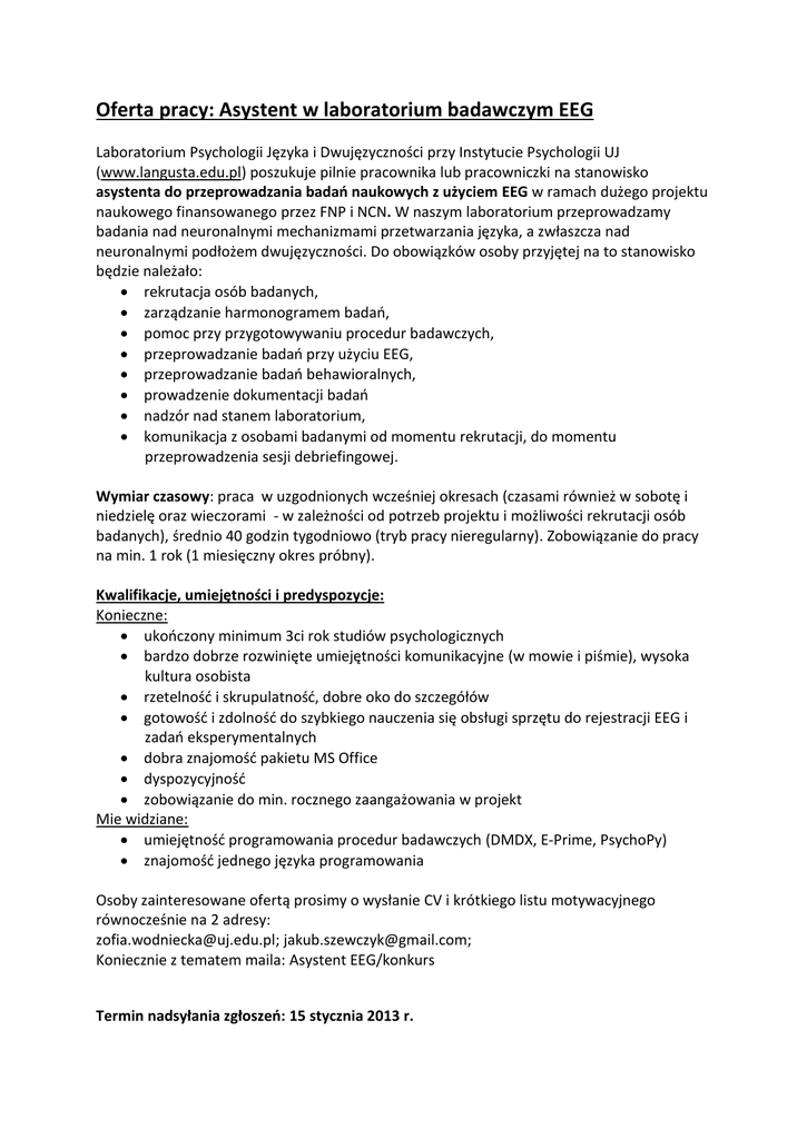 Oferta pracy: Asystent w laboratorium badawczym EEG Laboratorium Psychologii Języka i Dwujęzyczności przy Instytucie Psychologii UJ (www.langusta.edu.pl) poszukuje pilnie pracownika lub pracowniczki na stanowisko asystenta do przeprowadzania badań naukowych z użyciem EEG w ramach dużego projektu naukowego finansowanego przez FNP i NCN. W naszym laboratorium przeprowadzamy badania nad neuronalnymi mechanizmami przetwarzania języka, a zwłaszcza nad neuronalnymi podłożem dwujęzyczności. Do obowiązków osoby przyjętej na to stanowisko będzie należało: rekrutacja osób badanych, zarządzanie harmonogramem badań, pomoc przy przygotowywaniu procedur badawczych, przeprowadzanie badań przy użyciu EEG, przeprowadzanie badań behawioralnych, prowadzenie dokumentacji badań nadzór nad stanem laboratorium, komunikacja z osobami badanymi od momentu rekrutacji, do momentu przeprowadzenia sesji debriefingowej. Wymiar czasowy: praca w uzgodnionych wcześniej okresach (czasami również w sobotę i niedzielę oraz wieczorami - w zależności od potrzeb projektu i możliwości rekrutacji osób badanych), średnio 40 godzin tygodniowo (tryb pracy nieregularny). Zobowiązanie do pracy na min. 1 rok (1 miesięczny okres próbny). Kwalifikacje, umiejętności i predyspozycje: Konieczne: ukończony minimum 3ci rok studiów psychologicznych bardzo dobrze rozwinięte umiejętności komunikacyjne (w mowie i piśmie), wysoka kultura osobista rzetelność i skrupulatność, dobre oko do szczegółów gotowość i zdolność do szybkiego nauczenia się obsługi sprzętu do rejestracji EEG i zadań eksperymentalnych dobra znajomość pakietu MS Office dyspozycyjność zobowiązanie do min. rocznego zaangażowania w projekt Mie widziane: umiejętność programowania procedur badawczych (DMDX, E-Prime, PsychoPy) znajomość jednego języka programowania Osoby zainteresowane ofertą prosimy o wysłanie CV i krótkiego listu motywacyjnego równocześnie na 2 adresy: [email protected]; [email protected]; Koniecznie z tematem maila: Asystent EEG/konkurs Termin nadsyłania zgłoszeń: 15 stycznia 2013 r.