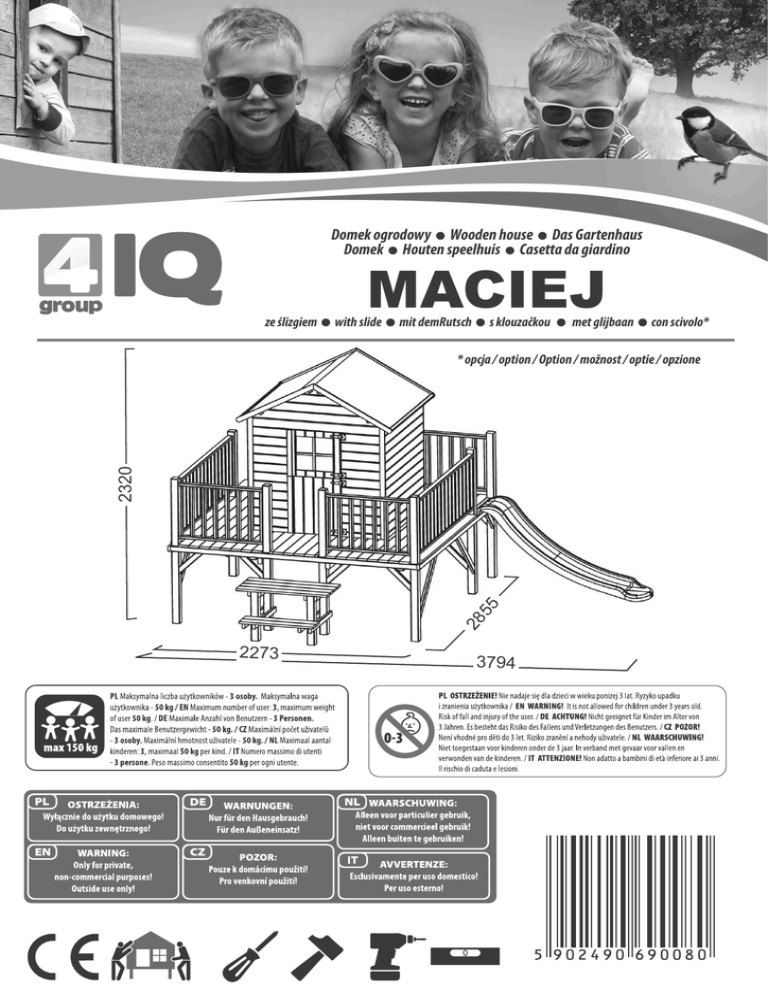 Domek ogrodowy l Wooden house l Das Gartenhaus Domek l Houten speelhuis l Casetta da giardino MACIEJ ze ślizgiem l with slide l mit demRutsch l s klouzačkou l met glijbaan l con scivolo* 28 55 2320 * opcja / option / Option / možnost / optie / opzione 2273 3794 * opcja / option / Option / možnost / optie / opzione Spis elementów / List of parts / Elementeliste / Seznam þásti / Onderdelen lijst / Elenco degli elementi Numer / Number / Anzahl / þíslo / Nummer / Numero Opis / Description / Beschreibung / Popis / Omschrijving / Descrizione PLATFORMA / PLATFORM / PLATFORM / ZÁKLADOVÁ ýÁST / PLATTFORM / PIATTAFORMA 5 Sáup przedni / Front pole / der Vordermast / PĜední sloupek / Paal voorkant / Palo anteriore Belka podáuĪna / Side bar / Längsbalken / Nosník / Zij dragers / Trave longitudinale Belka podáuĪna Ğrodkowa / Middle bar / Mittellängsbalken / PĜíþný hranol stĜedový / Zij dragers midden / Trave longitudinale (mezzo) Belka poprzeczna / Board / der Querbalken / PĜíþný nosník / Ligger / Pannello trasversale Zastrzaá / Corner / der Nagelgeschwür / PĜíþník / Schoor / Puntone 6 Zastrzaá / Corner / der Nagelgeschwür / PĜíþník / Schoor / Puntone 7 Zastrzaá / Corner / der Nagelgeschwür / PĜíþník / Schoor / Puntone Listwa pomostowa (wewnĊtrzna) / Board - inside / Verbindungsstück (innen) / PĜeklenovací deska vnitĜní / Vloerdeel binnen / Listello da ponte (interno) Listwa pomostowa (wewnĊtrzna) / Board - inside / Verbindungsstück (innen) / PĜeklenovací deska vnitĜní / Vloerdeel binnen / Listello da ponte (interno) Listwa pomostowa (zewnĊtrzna) / Board - outside / Verbindungsstück (äußer) / PĜeklenovací deska vnČjší / Vloerdeel / Listello da ponte (esterno) Listwa pomostowa (zewnĊtrzna) / Board - outside / Verbindungsstück (äußer) / PĜeklenovací deska vnČjší / Vloerdeel / Listello da ponte (esterno) Barierka boczna / Side barrier / Absperrung / Boþní zábradlí / Hekwerk zijkant / Barriera Barierka przednia / Front barrier / Absperrung / PĜední zábradlí / Hekwerk voorkant / Barriera Barierka przednia / Front barrier / Absperrung / PĜední zábradlí / Hekwerk voorkant / Barriera Barierka boczna / Side barrier / Absperrung / Boþní zábradlí / Hekwerk zijkant / Barriera Stopnie / Steps / Treppen / Nášlapy / Traptreden / Gradini 1 2 3 4 8 8bis 9 10 11 12 13 13bis 14 Czċğci / Parts / Element / Konstrukÿní prvky / Onderdeel / Elemento Wymiar w cm / Iloğý / Quantity / Size in cm / Anzahl / Größe in cm / Poÿet kusĥ / Rozmčr v cm / Hoeveelheid / Maat in cm / Quantità Dimensione cm Zmontowana czĊĞü / Assemble part / montierten Teil / Smontovaná þást / Voorgemonteerd / Parte montata 68x68x1450 10 26x52x2325 2 40x58x2325 2 26x52x223 8 26x52x400 7 26x52x810 6 26x52x385 2 Zmontowana czĊĞü / Assemble part / montierten Teil / Smontovaná þást / Voorgemonteerd / Parte montata 20x94x2325 20 Voorgemonteerd / Assemble part / Zmontowana czĊĞü / Smontovaná þást 20x94x2325 2 Voorgemonteerd / Assemble part / Zmontowana czĊĞü / Smontovaná þást 20x94x500 2 Zmontowana czĊĞü / Assemble part / montierten Teil / Smontovaná þást / Voorgemonteerd / Parte montata 20x94x1569 2 554x1569 2 554x776 4 554x449 1 554x500 1 26x52x636 2 26x52x433 4 26x52x604 4 17 DRABINKA / LADDER / LEITER / ŽEBěÍK / TRAP / SCALETTA Belka boczna / Side bar / Seitenleiste / Boþní deska / Zijligger / Trave laterale Belka boczna / Side bar / Seitenleiste / Boþní deska / Zijligger / Trave laterale Sáup / Pole / Mast / Sloup / Staanders / Palo 68x68x498 2 18 Sáup / Pole / Mast / Sloup / Staanders / Palo 20x94x840 4 19 20x94x680 2 20* Stopnie / Steps / Treppen / Nášlapy / Traptreden / Gradini ZjeĪdĪalnia / Playground slide / Rutsche / Skluzavka / Glijbaan / Scivolo DOMEK / HOUSE / HÜTTE / DOMEK / HUIS / CASETTA 21 ĝciana przednia / Front wall / Die Vorderwand / PĜední stČna / Voorwand / Piastra frontale 22 ĝciana tylna / Rear wall / Rückenplatte / Zadní stČna / Achterwand / Piastra posteriore 23 ĝciana boczna z otworem okiennym / Side wall with window hole / Seitenplatte des Fensteröffnung / Boþní stČna s oknem / Zijwand met raam gat / Pannello laterale (con il foro per Þnestra) 24 ĝciana boczna / Side wall / Seitenplatte / Boþní stČna / Zijwand / Pannello laterale 25 ĝciana szczytowa / Front wall / Giebelwand / Štít / Gevel / Pannello di chiusura 26 Páyta drzwiowa górna / Top door plate / obere Türplatte / DveĜe hor. þást / Halve deur boven / Pannello per porta superiore 15 16 1 Zmontowana czĊĞü / Assemble part / montierten Teil / Smontovaná þást / Voorgemonteerd / Parte montata Zmontowana czĊĞü / Assemble part / montierten Teil / Smontovaná þást / Voorgemonteerd / Parte montata Zmontowana czĊĞü / Assemble part / montierten Teil / Smontovaná þást / Voorgemonteerd / Parte montata Zmontowana czĊĞü / Assemble part / montierten Teil / Smontovaná þást / Voorgemonteerd / Parte montata Zmontowana czĊĞü / Assemble part / montierten Teil / Smontovaná þást / Voorgemonteerd / Parte montata Zmontowana czĊĞü / Assemble part / montierten Teil / Smontovaná þást / Voorgemonteerd / Parte montata 1170x1140 1 1170x1140 1 1100x1140 1 1100x1140 1 1264x360 2 460x460 1 27 Páyta drzwiowa dolna / Bottom door plate / untere Türplatte / DveĜe dol.þást / Halve deur onder / Pannello per porta inferiore 28 Páyta dachowa / Roof panel / Dachplatte / StĜešní desky / Dakpaneel / Pannello da tetto 29 Deska krawĊdziowa / Edge board / Kratenrand / Ukonþovací stĜešní lišty / Boeiboord / Trave da bordo 30 31 32 33 34 A B C D E F G H I J K L Zmontowana czĊĞü / Assemble part / montierten Teil / Smontovaná þást / Voorgemonteerd / Parte montata Zmontowana czĊĞü / Assemble part / montierten Teil / Smontovaná þást / Voorgemonteerd / Parte montata Zmontowana czĊĞü / Assemble part / montierten Teil / Smontovaná þást / Voorgemonteerd / Parte montata Listwa wykoĔcze