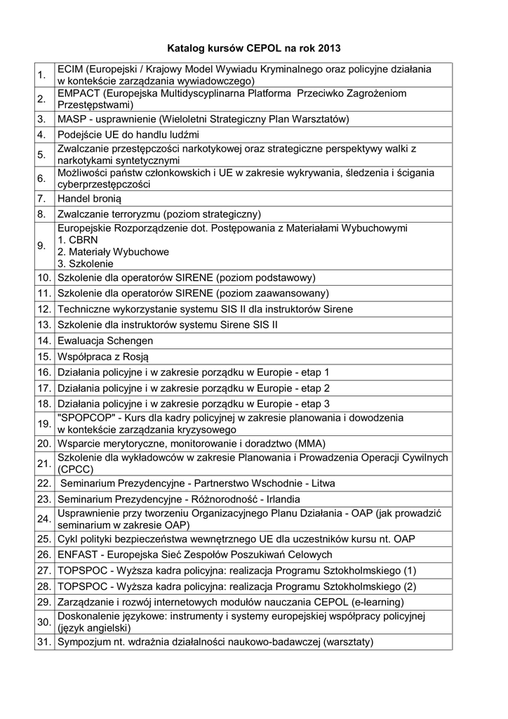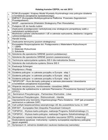 Katalog kursów CEPOL na rok 2013 1. 2. 3. 4. 5. 6. 7. ECIM (Europejski / Krajowy Model Wywiadu Kryminalnego oraz policyjne działania w kontekście zarządzania wywiadowczego) EMPACT (Europejska Multidyscyplinarna Platforma Przeciwko Zagrożeniom Przestępstwami) MASP - usprawnienie (Wieloletni Strategiczny Plan Warsztatów) Podejście UE do handlu ludźmi Zwalczanie przestępczości narkotykowej oraz strategiczne perspektywy walki z narkotykami syntetycznymi Możliwości państw członkowskich i UE w zakresie wykrywania, śledzenia i ścigania cyberprzestępczości Handel bronią 8. Zwalczanie terroryzmu (poziom strategiczny) Europejskie Rozporządzenie dot. Postępowania z Materiałami Wybuchowymi 1. CBRN 9. 2. Materiały Wybuchowe 3. Szkolenie 10. Szkolenie dla operatorów SIRENE (poziom podstawowy) 11. Szkolenie dla operatorów SIRENE (poziom zaawansowany) 12. Techniczne wykorzystanie systemu SIS II dla instruktorów Sirene 13. Szkolenie dla instruktorów systemu Sirene SIS II 14. Ewaluacja Schengen 15. Współpraca z Rosją 16. Działania policyjne i w zakresie porządku w Europie - etap 1 17. Działania policyjne i w zakresie porządku w Europie - etap 2 18. Działania policyjne i w zakresie porządku w Europie - etap 3 "SPOPCOP" - Kurs dla kadry policyjnej w zakresie planowania i dowodzenia 19. w kontekście zarządzania kryzysowego 20. Wsparcie merytoryczne, monitorowanie i doradztwo (MMA) Szkolenie dla wykładowców w zakresie Planowania i Prowadzenia Operacji Cywilnych 21. (CPCC) 22. Seminarium Prezydencyjne - Partnerstwo Wschodnie - Litwa 23. Seminarium Prezydencyjne - Różnorodność - Irlandia Usprawnienie przy tworzeniu Organizacyjnego Planu Działania - OAP (jak prowadzić 24. seminarium w zakresie OAP) 25. Cykl polityki bezpieczeństwa wewnętrznego UE dla uczestników kursu nt. OAP 26. ENFAST - Europejska Sieć Zespołów Poszukiwań Celowych 27. TOPSPOC - Wyższa kadra policyjna: realizacja Programu Sztokholmskiego (1) 28. TOPSPOC - Wyższa kadra policyjna: realizacja Programu Sztokholmskiego (2) 29. Zarządzanie i rozwój internetowych modułów nauczania CEPOL (e-learning) Doskonalenie językowe: instrumenty i systemy europejskiej współpracy policyjnej 30. (język angielski) 31. Sympozjum nt. wdrażnia działalności naukowo-badawczej (warsztaty) Seminarium z zakresu powiązań UE - Bałkany Zachodnie w ramach przestępczości zorganizowanej (warsztaty) 33. TOPSPOC - Wyższa kadra policyjna: realizacja Programu Sztokholmskiego (3) 32. 34. TOPSPOC - Wyższa kadra policyjna: realizacja Programu Sztokholmskiego (4) Europejska policyjna konferencja naukowo-badawcza CEPOL: Policing 2.0 - Działania 35. policyjne w środowisku nowych mediów i nowoczesnych technologii informatycznych 36. Zwalczanie terroryzmu (wzrost świadomości) 37. Cykl polityki bezpieczeństwa wewnętrznego UE dla uczestników kursu nt. OAP 38. Seminarium szkoleniowe w zakresie budowania potencjału w Afryce Zachodniej Europejskie Rozporządzenie dot. Postępowania z Materiałami Wybuchowymi 1. CBRN 39. 2. Materiały Wybuchowe 3. Szkolenie 40. Europejska Strategia Bezpieczeństwa Wewnętrznego 41. Katastrofy o dużej skali - wytyczne UE (EU guidelines) 42. Ewaluacja Schengen 43. Wykorzystywanie dzieci w cyberprzestrzeni 44. Przestępczość internetowa a bezpieczeństwo w cyberprzestrzeni Kurs z zakresu rynków związanych z nielegalną imigracją - wykrywanie / zwalczanie / 45. repatriacja 46. Pranie pieniędzy 47. Postępowanie śledcze w przypadkach korupcji i jej zapobieganie 48. Ochrona świadka - poziom zaawansowany 49. Postępowanie z informatorami - poziom zaawansowany Kryminalistyka z uwzględnieniem DNA a wyzwania działań policyjnych w tym zakresie 50. (we współpracy z ENFSI) 51. Wpływ sieci społecznościowych na organy porządku publicznego 52. Ogólnoeuropejskie szkolenie w zakresie zabezpieczenia meczy piłkarskich 53. Porządek publiczny i zarządznie tłumem - etap 1 Porządek publiczny - Zabezpieczanie dużych imprez masowych/Partnerstwo 54. publiczno-prywatne - etap 2 Szkolenie w zakresie powiązań, struktur oraz instrumentów w ramach reformy sektora 55. bezpieczeństwa (SSR), wspólnej polityki bezpieczeństwa i obrony (CSDP) oraz obszaru wolności, bezpieczeństwa i sprawiedliwości (FSJ) Doskonalenie językowe: instrumenty i systemy europejskiej współpracy policyjnej 56. (język francuski) Doskonalenie językowe: instrumenty i systemy europejskiej współpracy policyjnej 57. (język hiszpański) Doskonalenie językowe: instrumenty i systemy europejskiej współpracy policyjnej 58. (język angielski) Handel ludźmi (THB) - mechanizmy prewencyjne ze szczególnym uwzględnieniem 59. ograniczenia popytu Kurs z zakresu handlu kontenerami transportowanymi drogą morską oraz 60. kryminalistyki 61. Oszustwo i konfiskata mienia 62. Szkolenie dla wykładowców w zakresie operacyjnego zintegrowanego systemu z wykorzystaniem analizy 63. Kierowanie wspólnymi zespołami dochodzeniowo-śledczymi 64. Wspólne zespoły dochodzeniowo-śledcze 65. Prawa człowieka - etyka policyjna 66. Szkolenie dla instruktorów seminariów internetowych (webinars) 67. Szkolenie dla wykładowców - część 1 68. Szkolenie dla wykładowców - część 2 69. Zapewnianie jakości w ramach szkoleń z zakresu ochrony porządku publicznego 70. Kurs w zakresie mobilnych grup przestępczych 71. Szkolenie w zakresie analizy sieci społecznościowych Doskonalenie językowe: instrumenty i systemy europejskiej współpracy policyjnej 72. (język niemiecki) 73. Europejska Sieć Ekspertów w Dziedzinie Medycyny i Psychologii EMPEN 74. Nowoczesne działania Policji w miastach z zastosowaniem inteligentmych technologii Uczestnictwo w Wieloletnim Strategicznym Planie Działania (MASP) - skrót dla 75. uczestników warsztatów 76. Ogólnoeuropejskie szkolenie w zakresie zabezpieczenia meczy piłkarskich Działania w zakresie bezpieczeństwa na międzynarodowych lotniskach i głównych 77. węzłach komunikacyjnych 78.