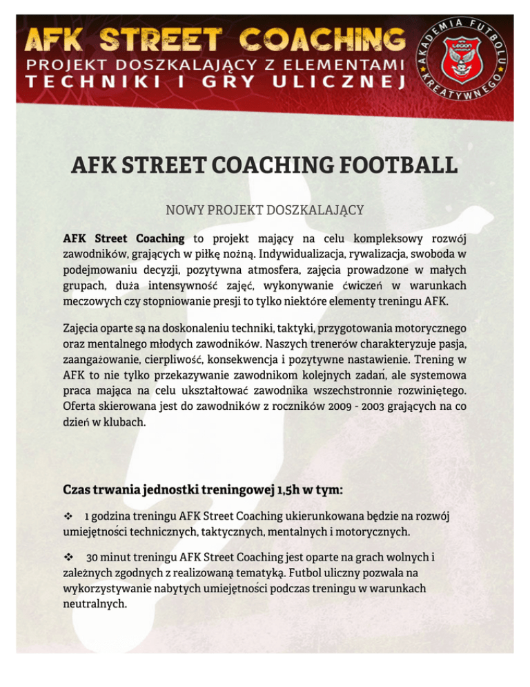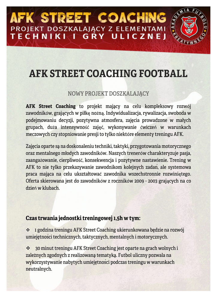 AFK STREET COACHING FOOTBALL NOWY PROJEKT DOSZKALAJĄCY AFK Street Coaching to projekt mający na celu kompleksowy rozwój zawodników, grających w piłkę nożną. Indywidualizacja, rywalizacja, swoboda w podejmowaniu decyzji, pozytywna atmosfera, zajęcia prowadzone w małych grupach, duża intensywność zajęć, wykonywanie ćwiczeń w warunkach meczowych czy stopniowanie presji to tylko niektóre elementy treningu AFK. Zajęcia oparte są na doskonaleniu techniki, taktyki, przygotowania motorycznego oraz mentalnego młodych zawodników. Naszych trenerów charakteryzuje pasja, zaangażowanie, cierpliwość, konsekwencja i pozytywne nastawienie. Trening w AFK to nie tylko przekazywanie zawodnikom kolejnych zadań, ale systemowa praca mająca na celu ukształtować zawodnika wszechstronnie rozwiniętego. Oferta skierowana jest do zawodników z roczników 2009 - 2003 grających na co dzień w klubach. Czas trwania jednostki treningowej 1,5h w tym: 1 godzina treningu AFK Street Coaching ukierunkowana będzie na rozwój umiejętności technicznych, taktycznych, mentalnych i motorycznych. v v 30 minut treningu AFK Street Coaching jest oparte na grach wolnych i zależnych zgodnych z realizowaną tematyką. Futbol uliczny pozwala na wykorzystywanie nabytych umiejętności podczas treningu w warunkach neutralnych. HARMONOGRAMTRENINGÓW(grudzień-marzec) Dzień Godzina Piątek 18.30-20.00 DolnaWarszawianka Sobota 10.00-11.30 DolnaWarszawianka Niedziela 10.00-11.30 DolnaWarszawianka PAKIETYTRENINGOWE Zakres PODSTAWOWY ROZSZERZONY Ilośćgodzinwtygodniu 1,5h 3h Opłatamiesięczna 150PLN 225PLN Wszystkie zajęcia odbywają się w Centrum Futbolu Warszawianka, ul. Dominika Merliniego 2, 02-522 Warszawa W razie jakichkolwiek pytań jesteśmy do Państwa dyspozycji: • Project Coordinator - Artur Cach: tel. 533 757 306, e-mail: [email protected] • Koordynator ds. Administracyjnych - Wioletta Obuchowska: tel. 507 052 901, e-mail: [email protected]