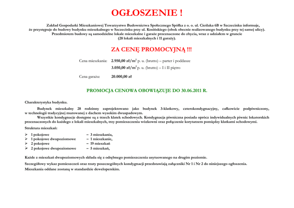 OGŁOSZENIE ! Zakład Gospodarki Mieszkaniowej Towarzystwo Budownictwa Społecznego Spółka z o. o. ul. Cieślaka 6B w Szczecinku informuje, że przystępuje do budowy budynku mieszkalnego w Szczecinku przy ul. Kosińskiego (obok obecnie realizowanego budynku przy tej samej ulicy). Przedmiotem budowy są samodzielne lokale mieszkalne i garaże przeznaczone do zbycia, wraz z udziałem w gruncie (28 lokali mieszkalnych i 11 garaży). ZA CENĘ PROMOCYJNĄ !!! Cena mieszkania: 2.950,00 zł/m2 p. u. (brutto) – parter i poddasze 3.050,00 zł/m2 p. u. (brutto) – I i II piętro Cena garażu: 20.000,00 zł PROMOCJA CENOWA OBOWIĄZUJE DO 30.06.2011 R. Charakterystyka budynku. Budynek mieszkalny 28 rodzinny zaprojektowano jako budynek 3-klatkowy, czterokondygnacyjny, całkowicie podpiwniczony, w technologii tradycyjnej murowanej z dachem wysokim dwuspadowym. Wszystkie kondygnacje dostępne są z trzech klatek schodowych. Kondygnacja piwniczna posiada oprócz indywidualnych piwnic lokatorskich przeznaczonych do każdego z lokali mieszkalnych, trzy pomieszczenia wózkowni oraz połączenie korytarzem pomiędzy klatkami schodowymi. Struktura mieszkań: 1 pokojowe 1 pokojowe dwupoziomowe 2 pokojowe 2 pokojowe dwupoziomowe – – – – 3 mieszkania, 1 mieszkanie, 19 mieszkań 5 mieszkań, Każde z mieszkań dwupoziomowych składa się z odrębnego pomieszczenia usytuowanego na drugim poziomie. Szczegółowy wykaz pomieszczeń oraz rzuty poszczególnych kondygnacji przedstawiają załączniki Nr 1 i Nr 2 do niniejszego ogłoszenia. Mieszkania oddane zostaną w standardzie deweloperskim. Zakres wyposażenia: 1. stolarka okienna pcv, 2. stolarka drzwiowa – tylko drzwi wejściowe, 3. okładziny wewnętrzne – tynk gipsowy / płyty gipsowo – kartonowe, 4. parapety wewnętrzne – postforming, 5. ściany zewnętrzne – dwuwarstwowe + izolacja styropianem , 6. ściany wewnętrzne , 7. posadzki – podłoże betonowe, 8. ściany w łazienkach – otynkowane, 9. instalacje: a) kanalizacyjna, b) wodna, c) ciepłej wody, zimnej wody i centralnego ogrzewania ( wszystkie opomiarowane indywidualnie), d) elektryczna 230 V i 380 V, e) domofonowa, f) TVK, telefoniczna, internetowa ( użytkowana wg umowy z operatorem sieci), g) grzejniki stalowe dwupłytowe, zawory z głowicą termostatyczną, w łazience grzejnik stalowy łazienkowy. Termin realizacji inwestycji od 20 kwietnia 2011 r. do 30 czerwca 2012 r. 1. Z osobami, które do dnia 30.06.2011 r. złożą wniosek o zawarcie przedwstępnej umowy kupna – sprzedaży lokalu mieszkalnego i dokonają pierwszej wpłaty w wysokości 20% wartości lokalu, zawarte zostaną umowy z uwzględnieniem ceny promocyjnej, z zastrzeżeniem zapisów określonych poniżej. 2. Osoby zainteresowane również nabyciem garażu zobowiązane są do złożenia odrębnego wniosku i dokonania min. 20% pierwszej wpłaty wartości garażu w terminie do 30.06.2011 r. 3. Za ważne uznaje się wyłącznie wpłaty dokonane na konto Spółki Nr 60 85661042 0500 5794 2004 0005 Bałtycki Bank Spółdzielczy w Darłowie Oddział w Szczecinku, 78-400 Szczecinek Pl. Sowińskiego 2. 4. Wnioski można pobrać w siedzibie Spółki, Urzędzie Miasta oraz ze stron internetowych: www.szczecinek.pl, www.zgm-tbs.szczecinek.pl. 5. We wniosku o nabycie lokalu mieszkalnego należy wskazać konkretny lokal. 6. W przypadku złożenia kilku wniosków na ten sam lokal o zawarciu umowy kupna – sprzedaży będzie decydować najwcześniej zaksięgowana wpłata na koncie ZGM TBS Sp. z o.o., o którym mowa w pkt 3. 7. Ze względu na ograniczoną liczbę garaży, o ich nabyciu zdecyduje wysokość wpłaty, a w przypadku zbiegu kilku wpłat w tej samej wysokości będzie decydować najwcześniej zaksięgowana wpłata na koncie ZGM TBS Sp. z o.o., o którym mowa w pkt 3. 8. Przedwstępne umowy kupna – sprzedaży garaży zostaną zawarte po upływie okresu promocyjnego. Bliższe informacje można uzyskać w Biurze Obsługi Lokatora lub telefonicznie pod numerem tel. (94) 37461-74. Niniejsze ogłoszenie nie jest ofertą w rozumieniu przepisów prawa cywilnego. Szczecinek, dnia 09.05.2011 r. Do ZGM TBS Sp. z o. o. w Szczecinku WNIOSEK o zawarcie przedwstępnej umowy kupna – sprzedaży lokalu mieszkalnego nr .................. w klatce .................. w budynku przy ul. Kosińskiego w Szczecinku, zgodnie z ogłoszeniem z dnia 09.05.2011 r. I. Dane osobowe : Wnioskowdawca/cy imiona nazwisko imiona rodziców adres meldunkowy (kod pocztowy/ miasto/ ulica/ nr domu/ nr mieszkania) adres zamieszkania (korespondencyjny) seria i nr dowodu osobistego (lub paszportu) data ważności dowodu osobistego (paszportu) numer NIP numer pesel stan cywilny telefon domowy telefon komórkowy adres e-mail inny kontakt II. Zgłaszam/my wolę zawarcia przedwstępnej umowy kupna – sprzedaży lokalu mieszkalnego nr .................., w klatce ................., o pow..................m2, kondygnacja ................................ w realizowanej inwestycji przy ul. Kosińskiego. III. Zobowiązuję/my się dokonać wpłaty w wysokości 20% wartości lokalu, tj. .................................................. zł na konto Spółki Nr 60 85661042 0500 5794 2004 0005 Bałtycki Bank Spółdzielczy w Darłowie Oddział w Szczecinku, 78-400 Szczecinek Pl. Sowińskiego 2, przed podpisaniem umowy przedwstępnej, tj. najpóźniej do dnia ................................... r. IV. Wnioskuję/my o zawarcie umowy przeniesienia własności lokalu w Kancelarii Notarialnej (wybraną Kancelarię Notarialną należy zaznaczyć znakiem X): Mariusz Ryndak ul. Boh. Warszawy 51 Barbara Nintza ul. A. Krajowej 2-8/8 V. Oświadczenie : 1. Oświadczam/my, że biorę/bierzemy odpowiedzialność za prawidłowość podanych wyżej danych osobowych i zgodnie z przepisami ustawy z dnia 29 sierpnia 1997 r. o ochronie danych osobowych, wyrażam/my zgodę na ich przetwarzanie przez Zakład Gospodarki Mieszkaniowej Towarzystwo Budownictwa Społecznego Sp. z o. o. w