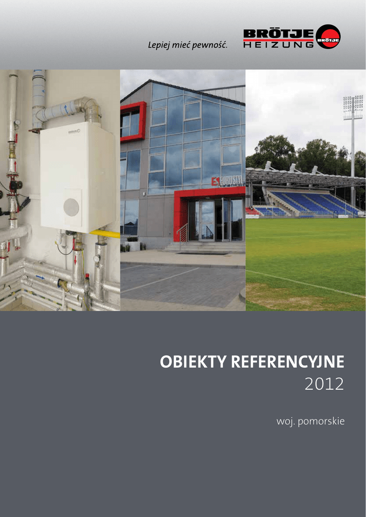 OBIEKTY REFERENCYJNE 2012 woj. pomorskie Eurostyl Gdańsk Zamontowano gazowy kocioł kondensacyjny EuroCondens SGB125E (20-125 kW). Biedronka Gdynia Zamontowano wiszący kocioł kondensacyjny EcoTherm Plus WGB90E. Biedronka Gdańsk Zamontowano kaskadę wiszących kotłów kondensacyjnych 2 x EcoTherm Plus WGB90E. CASIZ Gdańsk Zamontowano wiszący kocioł kondensacyjny EcoTherm Plus WGB90E. Kamienica Kętrzyń Zamontowano wiszący kocioł kondensacyjny EcoTherm Plus WGB50E. Kino „Gwiazda” Kętrzyń Zamontowano gazowy kocioł kondensacyjny EcoTherm Plus SGB215E (35-215 kW). Stadion Ostróda Zamontowano gazowy kocioł kondensacyjny EcoTherm Plus SGB260E (42-260 kW). Liceum Ogólnokształące Tczew Zamontowano kaskadę gazowych kotłów kondensacyjnych 2 x EcoTherm Plus SGB170E (28-170 kW). Bałtyckie Centrum Biznesu Gdańsk Zamontowano kaskadę gazowych kotłów kondensacyjnych 2 x EcoTherm Plus SGB260E (42-260 kW). Hotel „Winiarnia” Kwidzyń Zamontowano wiszący kocioł kondensacyjny EcoTherm Plus WGB90E. Możliwość wprowadzania zmian technicznych i występowania błędów zastrzeżona. Wersja 01.09 August Brötje GmbH · Postfach 1354 · 26171 Rastede Telefon 04402 80-0 · Telefax 04402 80-583 · www.broetje.pl