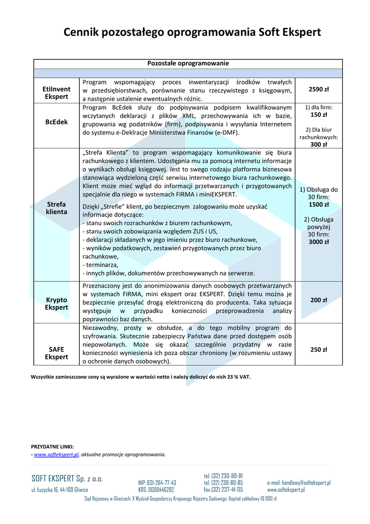 Cennik pozostałego oprogramowania Soft Ekspert Pozostałe oprogramowanie EtiInvent Ekspert BcEdek Program wspomagający proces inwentaryzacji środków trwałych w przedsiębiorstwach, porównanie stanu rzeczywistego z księgowym, a następnie ustalenie ewentualnych różnic. Program BcEdek służy do podpisywania podpisem kwalifikowanym wczytanych deklaracji z plików XML, przechowywania ich w bazie, grupowania wg podatników (firm), podpisywania i wysyłania Internetem do systemu e-Deklracje Ministerstwa Finansów (e-DMF). 2590 zł 1) dla firm: 150 zł 2) Dla biur rachunkowych: 300 zł „Strefa Klienta” to program wspomagający komunikowanie się biura rachunkowego z klientem. Udostępnia mu za pomocą internetu informacje o wynikach obsługi księgowej. Jest to swego rodzaju platforma biznesowa stanowiąca wydzieloną część serwisu internetowego biura rachunkowego. Klient może mieć wgląd do informacji przetwarzanych i przygotowanych specjalnie dla niego w systemach FIRMA i miniEKSPERT. Strefa klienta Krypto Ekspert SAFE Ekspert Dzięki „Strefie” klient, po bezpiecznym zalogowaniu może uzyskać informacje dotyczące: - stanu swoich rozrachunków z biurem rachunkowym, - stanu swoich zobowiązania względem ZUS i US, - deklaracji składanych w jego imieniu przez biuro rachunkowe, - wyników podatkowych, zestawień przygotowanych przez biuro rachunkowe, - terminarza, - innych plików, dokumentów przechowywanych na serwerze. Przeznaczony jest do anonimizowania danych osobowych przetwarzanych w systemach FIRMA, mini ekspert oraz EKSPERT. Dzięki temu można je bezpiecznie przesyłać drogą elektroniczną do producenta. Taka sytuacja występuje w przypadku konieczności przeprowadzenia analizy poprawności baz danych. Niezawodny, prosty w obsłudze, a do tego mobilny program do szyfrowania. Skutecznie zabezpieczy Państwa dane przed dostępem osób niepowołanych. Może się okazać szczególnie przydatny w razie konieczności wyniesienia ich poza obszar chroniony (w rozumieniu ustawy o ochronie danych osobowych). Wszystkie zamieszczone ceny są wyrażone w wartości netto i należy doliczyć do nich 23 % VAT. PRZYDATNE LINKI: - www.softekspert.pl, aktualne promocje oprogramowania. 1) Obsługa do 30 firm: 1500 zł 2) Obsługa powyżej 30 firm: 3000 zł 200 zł 250 zł