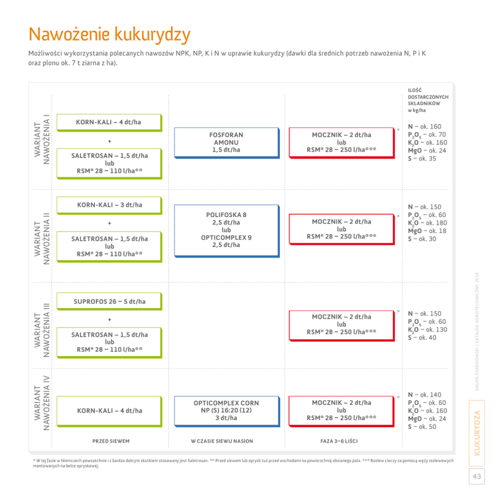 Nawożenie kukurydzy Możliwości wykorzystania polecanych nawozów NPK, NP, K i N w uprawie kukurydzy (dawki dla średnich potrzeb nawożenia N, P i K oraz plonu ok. 7 t ziarna z ha). + SALETROSAN – 1,5 dt/ha lub RSM® 28 – 110 l/ha** FOSFORAN AMONU 1,5 dt/ha MOCZNIK – 2 dt/ha lub RSM® 28 – 250 l/ha*** * WARIANT NAWOŻENIA IV WARIANT NAWOŻENIA III WARIANT NAWOŻENIA II KORN-KALI – 3 dt/ha + SALETROSAN – 1,5 dt/ha lub RSM® 28 – 110 l/ha** POLIFOSKA 8 2,5 dt/ha lub OPTICOMPLEX 9 2,5 dt/ha MOCZNIK – 2 dt/ha lub RSM® 28 – 250 l/ha*** * N – ok. 160 P 2O5 – ok. 70 K2O – ok. 160 MgO – ok. 24 S – ok. 35 N – ok. 150 P 2O5 – ok. 60 K2O – ok. 180 MgO – ok. 18 S – ok. 30 SUPROFOS 26 – 5 dt/ha MOCZNIK – 2 dt/ha lub RSM® 28 – 250 l/ha*** + SALETROSAN – 1,5 dt/ha lub RSM® 28 – 110 l/ha** KORN-KALI – 4 dt/ha PRZED SIEWEM OPTICOMPLEX CORN NP (S) 16:20 (12) 3 dt/ha W czasie siewu nasion MOCZNIK – 2 dt/ha lub RSM® 28 – 250 l/ha*** * * N – ok. 150 P 2O5 – ok. 60 K2O – ok. 130 S – ok. 40 N – ok. 140 P 2O5 – ok. 60 K2O – ok. 160 MgO – ok. 24 S – ok. 50 FAZA 3–6 Liści Grupa Osadkowski | Katalog agrotechniczny 2014 KORN-KALI – 4 dt/ha KUKURYDZA WARIANT NAWOŻENIA I iLOŚĆ DOSTARCZONYCH SKŁADNIKÓW w kg/ha * W tej fazie w Niemczech powszechnie i z bardzo dobrym skutkiem stosowany jest Saletrosan. ** Przed siewem lub oprysk tuż przed wschodami na powierzchnię obsianego pola. *** Rozlew cieczy za pomocą węży rozlewowych montowanych na belce opryskowej. 43