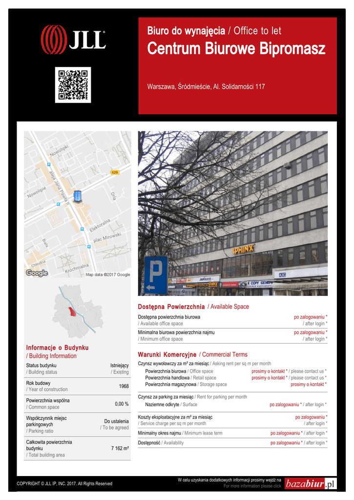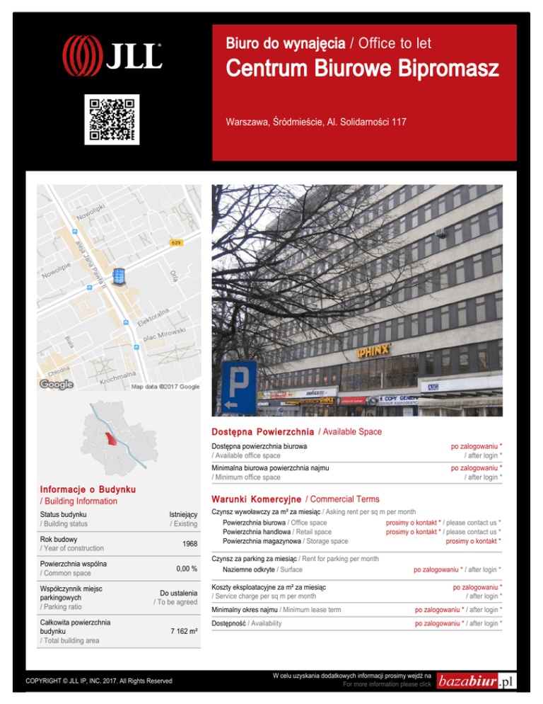 Biuro do wynajęcia / Office to let Centrum Biurowe Bipromasz Warszawa, Śródmieście, Al. Solidarności 117 Dostępna Powierzchnia / Available Space Informacje o Budynku / Building Information Status budynku / Building status Istniejący / Existing 1968 Powierzchnia wspólna / Common space Całkowita powierzchnia budynku / Total building area po zalogowaniu * / after login * Minimalna biurowa powierzchnia najmu / Minimum office space po zalogowaniu * / after login * Warunki Komercyjne / Commercial Terms Rok budowy / Year of construction Współczynnik miejsc parkingowych / Parking ratio Dostępna powierzchnia biurowa / Available office space 0,00 % Do ustalenia / To be agreed 7 162 m² COPYRIGHT © JLL IP, INC. 2017. All Rights Reserved Czynsz wywoławczy za m² za miesiąc / Asking rent per sq m per month Powierzchnia biurowa / Office space prosimy o kontakt * / please contact us * Powierzchnia handlowa / Retail space prosimy o kontakt * / please contact us * Powierzchnia magazynowa / Storage space prosimy o kontakt * Czynsz za parking za miesiąc / Rent for parking per month Naziemne odkryte / Surface po zalogowaniu * / after login * Koszty eksploatacyjne za m² za miesiąc / Service charge per sq m per month po zalogowaniu * / after login * Minimalny okres najmu / Minimum lease term po zalogowaniu * / after login * Dostępność / Availability po zalogowaniu * / after login * W celu uzyskania dodatkowych informacji prosimy wejdź na For more information please click Dostępna Powierzchnia / Available Space Piętro / Floor Powierzchnia wolna / Vacant space Dostępność / Availability -1 *** (! ) prosimy o kontakt * / please contact us * prosimy o kontakt * / please contact us * 0 * (!1) prosimy o kontakt * / please contact us * prosimy o kontakt * / please contact us * 3 prosimy o kontakt * / please contact us * prosimy o kontakt * / please contact us * 6 prosimy o kontakt * / please contact us * prosimy o kontakt * / please contact us * 7 prosimy o kontakt * / please contact us * prosimy o kontakt * / please contact us * 8 prosimy o kontakt * / please contact us * prosimy o kontakt * / please contact us * 1 Razem / Total po zalogowaniu * / after login * 1 1 (!) Powierzchnia do wynajęcia łącznie (! ) / Space for rent jointly (! ) (*) Powierzchnia handlowa / Retail space (***) Powierzchnia magazynowa / Storage space Standardowe Wykończenie / Standard Fit-Out Typowy Plan Piętra / Typical Floor Plan Klimatyzacja / Air conditioning Podnoszone podłogi / Raised floor Podwieszany sufit / Suspended ceiling Okablowanie telefoniczne / Telephone cabling Okablowanie komputerowe / Computer cabling Okablowanie elektryczne / Power cabling Tryskacze / Sprinklers Czujniki dymu / Smoke detectors Wykładzina / Carpeting Podział powierzchni ściankami (opcja) / Wall partitioning (option) Recepcja / Reception Ochrona budynku / Security Kable światłowodowe (opcja) / Fiber optics (option) Kontrola dostępu do budynku (opcja) / Access control (option) Uchylne okna / Openable windows BMS / BMS W celu uzyskania dodatkowych informacji lub zorganizowania spotkania prosimy o kontakt: / For more information or to arrange a viewing please contact: +48 22 167 00 00 Niniejsze warunki mają charakter wyłącznie informacyjny i nie stanowią części wiążącej oferty lub umowy. / The Property Particulars are for information purposes only and do not form any part of binding offer or contract. COPYRIGHT © JLL IP, INC. 2017. All Rights Reserved W celu uzyskania dodatkowych informacji prosimy wejdź na For more information please click