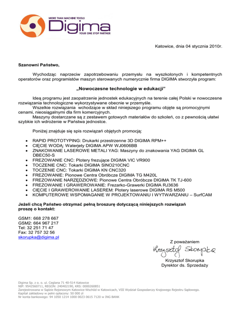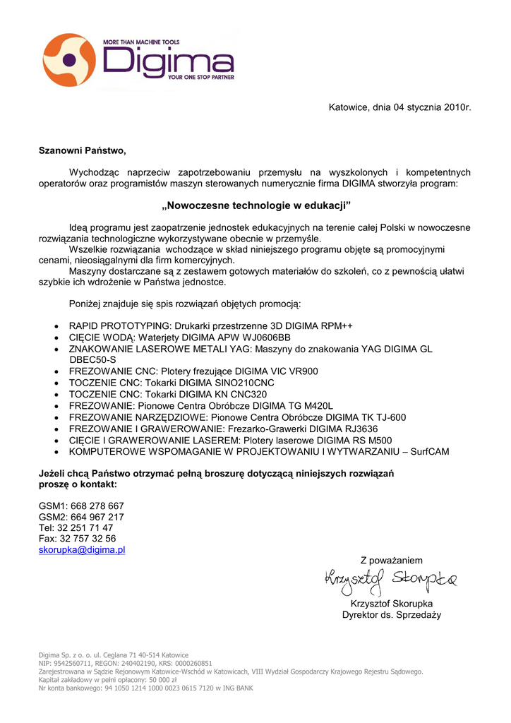 Katowice, dnia 04 stycznia 2010r. Szanowni Państwo, Wychodząc naprzeciw zapotrzebowaniu przemysłu na wyszkolonych i kompetentnych operatorów oraz programistów maszyn sterowanych numerycznie firma DIGIMA stworzyła program: „Nowoczesne technologie w edukacji” Ideą programu jest zaopatrzenie jednostek edukacyjnych na terenie całej Polski w nowoczesne rozwiązania technologiczne wykorzystywane obecnie w przemyśle. Wszelkie rozwiązania wchodzące w skład niniejszego programu objęte są promocyjnymi cenami, nieosiągalnymi dla firm komercyjnych. Maszyny dostarczane są z zestawem gotowych materiałów do szkoleń, co z pewnością ułatwi szybkie ich wdrożenie w Państwa jednostce. Poniżej znajduje się spis rozwiązań objętych promocją: RAPID PROTOTYPING: Drukarki przestrzenne 3D DIGIMA RPM++ CIĘCIE WODĄ: Waterjety DIGIMA APW WJ0606BB ZNAKOWANIE LASEROWE METALI YAG: Maszyny do znakowania YAG DIGIMA GL DBEC50-S FREZOWANIE CNC: Plotery frezujące DIGIMA VIC VR900 TOCZENIE CNC: Tokarki DIGIMA SINO210CNC TOCZENIE CNC: Tokarki DIGIMA KN CNC320 FREZOWANIE: Pionowe Centra Obróbcze DIGIMA TG M420L FREZOWANIE NARZĘDZIOWE: Pionowe Centra Obróbcze DIGIMA TK TJ-600 FREZOWANIE I GRAWEROWANIE: Frezarko-Grawerki DIGIMA RJ3636 CIĘCIE I GRAWEROWANIE LASEREM: Plotery laserowe DIGIMA RS M500 KOMPUTEROWE WSPOMAGANIE W PROJEKTOWANIU I WYTWARZANIU – SurfCAM Jeżeli chcą Państwo otrzymać pełną broszurę dotyczącą niniejszych rozwiązań proszę o kontakt: GSM1: 668 278 667 GSM2: 664 967 217 Tel: 32 251 71 47 Fax: 32 757 32 56 [email protected] Z poważaniem Krzysztof Skorupka Dyrektor ds. Sprzedaży Digima Sp. z o. o. ul. Ceglana 71 40-514 Katowice NIP: 9542560711, REGON: 240402190, KRS: 0000260851 Zarejestrowana w Sądzie Rejonowym Katowice-Wschód w Katowicach, VIII Wydział Gospodarczy Krajowego Rejestru Sądowego. Kapitał zakładowy w pełni opłacony: 50 000 zł Nr konta bankowego: 94 1050 1214 1000 0023 0615 7120 w ING BANK