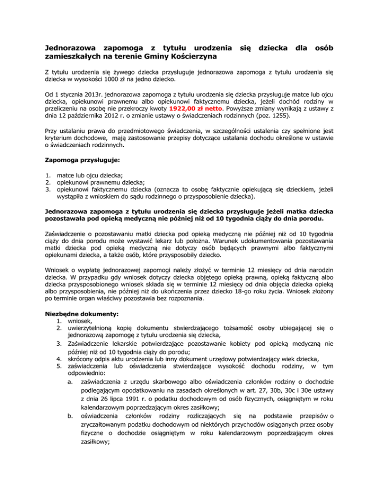 Jednorazowa zapomoga z tytułu urodzenia zamieszkałych na terenie Gminy Kościerzyna się dziecka dla osób Z tytułu urodzenia się żywego dziecka przysługuje jednorazowa zapomoga z tytułu urodzenia się dziecka w wysokości 1000 zł na jedno dziecko. Od 1 stycznia 2013r. jednorazowa zapomoga z tytułu urodzenia się dziecka przysługuje matce lub ojcu dziecka, opiekunowi prawnemu albo opiekunowi faktycznemu dziecka, jeżeli dochód rodziny w przeliczeniu na osobę nie przekroczy kwoty 1922,00 zł netto. Powyższe zmiany wynikają z ustawy z dnia 12 października 2012 r. o zmianie ustawy o świadczeniach rodzinnych (poz. 1255). Przy ustalaniu prawa do przedmiotowego świadczenia, w szczególności ustalenia czy spełnione jest kryterium dochodowe, mają zastosowanie przepisy dotyczące ustalania dochodu określone w ustawie o świadczeniach rodzinnych. Zapomoga przysługuje: 1. matce lub ojcu dziecka; 2. opiekunowi prawnemu dziecka; 3. opiekunowi faktycznemu dziecka (oznacza to osobę faktycznie opiekującą się dzieckiem, jeżeli wystąpiła z wnioskiem do sądu rodzinnego o przysposobienie dziecka). Jednorazowa zapomoga z tytułu urodzenia się dziecka przysługuje jeżeli matka dziecka pozostawała pod opieką medyczną nie później niż od 10 tygodnia ciąży do dnia porodu. Zaświadczenie o pozostawaniu matki dziecka pod opieką medyczną nie później niż od 10 tygodnia ciąży do dnia porodu może wystawić lekarz lub położna. Warunek udokumentowania pozostawania matki dziecka pod opieką medyczną nie dotyczy osób będących prawnymi albo faktycznymi opiekunami dziecka, a także osób, które przysposobiły dziecko. Wniosek o wypłatę jednorazowej zapomogi należy złożyć w terminie 12 miesięcy od dnia narodzin dziecka. W przypadku gdy wniosek dotyczy dziecka objętego opieką prawną, opieką faktyczną albo dziecka przysposobionego wniosek składa się w terminie 12 miesięcy od dnia objęcia dziecka opieką albo przysposobienia, nie później niż do ukończenia przez dziecko 18-go roku życia. Wniosek złożony po terminie organ właściwy pozostawia bez rozpoznania. Niezbędne dokumenty: 1. wniosek, 2. uwierzytelnioną kopię dokumentu stwierdzającego tożsamość osoby ubiegającej się o jednorazową zapomogę z tytułu urodzenia się dziecka, 3. Zaświadczenie lekarskie potwierdzające pozostawanie kobiety pod opieką medyczną nie później niż od 10 tygodnia ciąży do porodu; 4. skrócony odpis aktu urodzenia lub inny dokument urzędowy potwierdzający wiek dziecka, 5. zaświadczenia lub oświadczenia stwierdzające wysokość dochodu rodziny, w tym odpowiednio: a. zaświadczenia z urzędu skarbowego albo oświadczenia członków rodziny o dochodzie podlegającym opodatkowaniu na zasadach określonych w art. 27, 30b, 30c i 30e ustawy z dnia 26 lipca 1991 r. o podatku dochodowym od osób fizycznych, osiągniętym w roku kalendarzowym poprzedzającym okres zasiłkowy; b. oświadczenia członków rodziny rozliczających się na podstawie przepisów o zryczałtowanym podatku dochodowym od niektórych przychodów osiąganych przez osoby fizyczne o dochodzie osiągniętym w roku kalendarzowym poprzedzającym okres zasiłkowy; c. 6. 7. 8. 9. oświadczenia członków rodziny o dochodzie niepodlegającym opodatkowaniu podatkiem dochodowym od osób fizycznych osiągniętym w roku kalendarzowym poprzedzającym okres zasiłkowy; d. zaświadczenia albo oświadczenia członków rodziny zawierające informację o wysokości składek na ubezpieczenie zdrowotne w roku kalendarzowym poprzedzającym okres zasiłkowy; e. zaświadczenie właściwego organu gminy, nakaz płatniczy albo oświadczenie o wielkości gospodarstwa rolnego wyrażonej w hektarach przeliczeniowych ogólnej powierzchni w roku kalendarzowym poprzedzającym okres zasiłkowy; f. umowę dzierżawy - w przypadku oddania części lub całości znajdującego się w posiadaniu rodziny gospodarstwa rolnego w dzierżawę, g. umowę zawartą w formie aktu notarialnego - w przypadku wniesienia gospodarstwa rolnego do użytkowania przez rolniczą spółdzielnię produkcyjną, h. odpis podlegającego wykonaniu orzeczenia sądu zasądzającego alimenty na rzecz osób w rodzinie lub poza rodziną lub odpis protokołu posiedzenia zawierającego treść ugody sądowej, lub odpis zatwierdzonej przez sąd ugody zawartej przed mediatorem, zobowiązujących do alimentów na rzecz osób w rodzinie lub poza rodziną, i. przekazy lub przelewy pieniężne dokumentujące wysokość zapłaconych alimentów, j. w przypadku gdy osoba uprawniona nie otrzymała alimentów albo otrzymała je w wysokości niższej od ustalonej w wyroku sądu, ugodzie sądowej lub ugodzie zawartej przed mediatorem: zaświadczenie organu prowadzącego postępowanie egzekucyjne o całkowitej lub częściowej bezskuteczności egzekucji alimentów, a także o wysokości wyegzekwowanych alimentów, lub informację właściwego sądu lub właściwej instytucji o podjęciu przez osobę uprawnioną czynności związanych z wykonaniem tytułu wykonawczego za granicą albo o niepodjęciu tych czynności, w szczególności w związku z brakiem podstawy prawnej do ich podjęcia lub brakiem możliwości wskazania przez osobę uprawnioną miejsca zamieszkania dłużnika alimentacyjnego za granicą, jeżeli dłużnik zamieszkuje za granicą, k. dokument określający datę utraty dochodu oraz miesięczną wysokość utraconego dochodu, l. dokument określający wysokość dochodu uzyskanego przez członka rodziny oraz liczbę miesięcy, w których dochód był osiągany - w przypadku uzyskania dochodu w roku kalendarzowym poprzedzającym okres zasiłkowy, m. dokument określający wysokość dochodu uzyskanego przez członka rodziny z miesiąca następującego po miesiącu, w którym dochód został osiągnięty - w przypadku uzyskania dochodu po roku kalendarzowym poprzedzającym okres zasiłkowy; kartę pobytu - w przypadku cudzoziemca odpis prawomocnego wyroku s