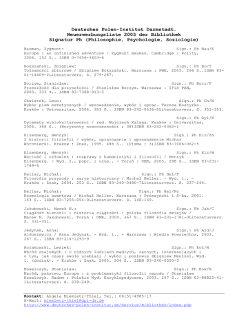 Deutsches Polen-Institut Darmstadt. Neuerwerbungsliste 2005 der Bibliothek Signatur Ph (Philosophie, Psychologie, Soziologie) Bauman, Zygmunt: Sign.: Ph Bau/E Europe : an unfinished adventure / Zygmunt Bauman. Cambridge : Polity, 2004. 152 S.. ISBN 0-7456-3403-6 Bokszański, Zbigniew: Sign.: Ph Bo/T Tożsamości zbiorowe / Zbigniew Bokszański. Warszawa : PWN, 2005. 296 S..ISBN 8301-14409-2Literaturverz. S. 279-287. Borzym, Stanisław: Sign.: Ph Borz/P Przeszłość dla przyszłości / Stanisław Borzym. Warszawa : IFiS PAN, 2003. 333 S.. ISBN 83-7388-013-5 Chwistek, Leon: Sign.: Ph Ch/W Wybór pism estetycznych / wprowadzenie, wybór i oprac. Teresa Kostyrko. Kraków : Universitas, 2004. 353 S.. ISBN 83-242-0536-5Literaturverz. S. 351-353. Sign.: Ph Dyl/K Dylematy wielokulturowości / red. Wojciech Kalaga. Kraków : Universitas, 2004. 366 S.. (Horyzonty nowoczesności ; 38)ISBN 83-242-0362-1 Elzenberg, Henryk: Sign.: Ph Elz/Zh Z historii filozofii / wybór, opracowanie i wprowadzenie Michał Woroniecki. Kraków : Znak, 1995. 488 S.. (Pisma ; 3)ISBN 83-7006-062-5 Elzenberg, Henryk: Sign.: Ph Elz/W Wartość i człowiek : rozprawy z humanistyki i filozofii / Henryk Elzenberg. - Wyd. 2., popr. i uzup.. - Toruń : UMK, 2005. 298 S.. ISBN 83-2311789-6 Heller, Michał: Sign.: Ph Hel/F Filozofia przyrody : zarys historyczny / Michał Heller. - Wyd. 1.. Kraków : Znak, 2004. 253 S.. ISBN 83-240-0480-7Literaturverz. S. 237-244. Heller, Michał: Sign.: Ph Hel/Ko Kosmologia kwantowa / Michał Heller. Warszawa : Prószyński i S-ka, 2001. 153 S.. ISBN 83-7255-054-9Literaturverz. S. 148-149. Jakubowski, Marek N.: Sign.: Ph Jak/C Ciągłość historii i historia ciągłości : polska filozofia dziejów / Marek N. Jakubowski. Toruń : UMK, 2004. 367 S.. ISBN 83-231-1781-0Literaturverz. S. 331-351. Jedynak, Anna: Sign.: Ph Ajd/J Ajdukiewicz / Anna Jedynak. - Wyd. 1.. - Warszawa : Wiedza Powszechna, 2003. 267 S.. ISBN 83-214-1293-9 Kołakowski, Leszek: Sign.: Ph Koł/W Wśród znajomych : o różnych ludziach mądrych, zacnych, interesujących i o tym, jak czasy swoje urabiali / wybór i posłowie Zbigniew Mentzel. Wyd. 1. (dodruk). - Kraków : Znak, 2005. 204 S.. ISBN 83-240-0500-5 Kowalczyk, Stanisław: Sign.: Ph Kow/N Naród, państwo, Europa : z problematyki filozofii narodu / Stanisław Kowalczyk. Radom : Polskie Wyd. Encyklopedyczne, 2003. 257 S.. ISBN 83-88822-411Literaturverz. S. 239-249. Kontakt: Angela Miemietz-Thiel, Tel.: 06151-4985-17 E-Mail: [email protected] http://www.deutsches-polen-institut.de/Service/Bibliothek/index.php Deutsches Polen-Institut Darmstadt. Neuerwerbungsliste 2005 der Bibliothek Signatur Ph (Philosophie, Psychologie, Soziologie) 2 Sign.: Ph Ku/P Kultura i świadomość / pod red. Stanisława Pietraszki. Wrocław : Wyd. Uniw. Wrocławskiego, 1999. 160 S.. (Acta Universitatis Wratislaviensis ; 2141 : Prace Kulturoznawcze ; 7)ISBN 83-229-1903-4 Mackiewicz, Witold: Sign.: Ph Mac/L Ludzie i idee : polska filozofia najnowsza ; zarys problematyki / Witold Mackiewicz. - Wyd. 1.. - Warszawa : Agencja Wyd. Witmark, 2003. 229 S.. ISBN 83911503-2-1 Michalski, Cezary: Sign.: Ph M/Ćw Ćwiczenia z bezstronności / Cezary Michalski. - Wyd. 1.. - Kraków : Arcana, 1999. 173 S.. ISBN 83-86225-92-0 Sign.: Ph O/Mo-2 O naturze i kulturze / pod red. Jana Mozrzymasa. Wrocław : Wyd. Uniw. Wrocławskiego, 2005. 468 S. : Ill., graph. Darst.. (Acta Universitatis Wratislaviensis ; 2789)ISBN 83-229-2642-1 Sign.: Ph O/Mo O nauce i sztuce / pod red. Jana Mozrzymasa. Wrocław : Wyd. Uniw. Wrocławskiego, 2004. 394 S. : Ill., Kt.. (Acta Universitatis Wratislaviensis ; 2669)ISBN 83-229-2519-0 Ossowska, Maria: Sign.: Ph Osso/S Socjologia moralności : zarys zagadnień / Maria Ossowska. - Wyd. 4.. Warszawa : PWN, 2005. 278 S.. ISBN 83-01-14009-7Literaturverz. S. 269-272. Ossowska, Maria: Sign.: Ph Osso/M Moralność mieszczańska / Maria Ossowska. - Wyd. 2.. - Wrocław : Ossolineum, 1985. 301 S.. ISBN 83-04-01877-2 Ossowski, Stanisław: Sign.: Ph Oss/W Wybór pism estetycznych / wprowadzenie, wybór i oprac. Bohdan Dziemidok. Kraków : Universitas, 2004. 150 S.. ISBN 83-242-0544-6Literaturverz. S. 149-150. Pąkciński, Marek: Sign.: Ph Niet/Pą Maski Zaratustry : motywy i wątki filozofii Nietzschego a kryzys nowoczesności / Marek Pąkciński. Warszawa : IBL ; Fundacja AH, 2004. 354 S.. ISBN 83-89348-27-6 Sign.: Ph Sy/N Symetrie, systemy, ewolucja / pod red. Adama Nobisa i Antoniego Ogorzałka. Wrocław : Wyd. Uniw. Wrocławskiego, 1999. 182 S. : Ill., graph. Darst.. (Acta Universitatis Wratislaviensis ; 2119)ISBN 83-229-2519-0 Sztompka, Piotr: Sign.: Ph Szt/So Socjologia wizualna : fotografia jako metoda badawcza / Piotr Sztompka. Warszawa : PWN, 2005. 149 S. : Ill.. ISBN 83-01-14367-3Literaturverz. S. 130138. Tokarska-Bakir, Joanna: Sign.: Ph Tok/O Obraz osobliwy : hermeneutyczna lektura źródeł etnograficznych ; wielkie opowieści / Joanna Tokarska-Bakir. Kraków : Universitas, 2000. 411, [67] S., : Ill., Tab.. ISBN 83-7052-773-6 Toporow, Władimir N.: Sign.: Ph Top/P Przestrzeń i rzecz / przekład Bogusław żyłko. Kraków : Universitas, 2003. 244 S.. (Horyzonty nowoczesności ; 25)ISBN 83-242-0369-9 Kontakt: Angela Miemietz-Thiel, Tel.: 06151-4985-17 E-Mail: [email protected] http://www.deutsches-polen-institut.de/Service/Bibliothek/index.php