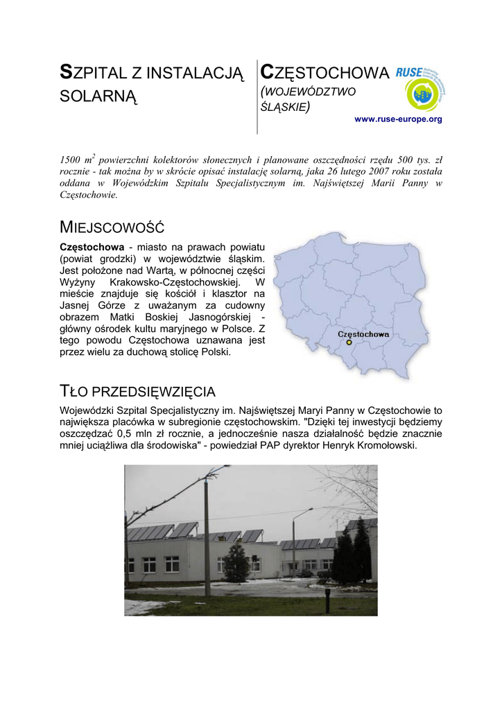 SZPITAL Z INSTALACJĄ CZĘSTOCHOWA SOLARNĄ (WOJEWÓDZTWO ŚLĄSKIE) www.ruse-europe.org 1500 m2 powierzchni kolektorów słonecznych i planowane oszczędności rzędu 500 tys. zł rocznie - tak można by w skrócie opisać instalację solarną, jaka 26 lutego 2007 roku została oddana w Wojewódzkim Szpitalu Specjalistycznym im. Najświętszej Marii Panny w Częstochowie. MIEJSCOWOŚĆ Częstochowa - miasto na prawach powiatu (powiat grodzki) w województwie śląskim. Jest położone nad Wartą, w północnej części Wyżyny Krakowsko-Częstochowskiej. W mieście znajduje się kościół i klasztor na Jasnej Górze z uważanym za cudowny obrazem Matki Boskiej Jasnogórskiej główny ośrodek kultu maryjnego w Polsce. Z tego powodu Częstochowa uznawana jest przez wielu za duchową stolicę Polski. TŁO PRZEDSIĘWZIĘCIA Wojewódzki Szpital Specjalistyczny im. Najświętszej Maryi Panny w Częstochowie to największa placówka w subregionie częstochowskim. "Dzięki tej inwestycji będziemy oszczędzać 0,5 mln zł rocznie, a jednocześnie nasza działalność będzie znacznie mniej uciążliwa dla środowiska" - powiedział PAP dyrektor Henryk Kromołowski. OPIS PRZEDSIĘWZIĘCIA Częstochowski szpital należy do dużych jednostek medycznych. Dysponuje ponad 700 łóżkami w 20 oddziałach, 35 poradniami i 6 zakładami. W tak dużym obiekcie średnie dobowe zużycie ciepłej wody użytkowej plasuje się również na wysokim poziomie i wynosi ok. 53 m3, co w ciągu roku daje wartość 19.710 m3. Aby ogrzać tak znaczną ilość wody, należy dostarczyć energię cieplną o wartości 4088 GJ rocznie. Ta wyprodukowana przez kolektory słoneczne pokryje zapotrzebowanie aż w 51,8%. Kolejne 32,3% zagwarantują ekonomizery spalin. Pozostałe 15,9% potrzebnej mocy zostanie dostarczone przez konwencjonalne źródło ciepła, jakim są działające w kotłowni 4 kotły gazowo-olejowe. Szpital spodziewa się oszczędności na poziomie około 500 tys. zł rocznie i znacznego zmniejszenia zanieczyszczania powietrza atmosferycznego spalinami. Budowę podzielono na dwa etapy. Pierwszy obejmował wykonanie instalacji solarnej składającej się z 598 kolektorów Vitosol 100 s (2,5 m2 każdy) o łącznej powierzchni całkowitej 1495 m2. Konstrukcję rozmieszczono na trzech polach, bezpośrednio na poziomie gruntu, a częściowo na dachach budynków szpitala. Całkowita wydajność tej instalacji wynosi około 1,3 MW. Kolektory wyprodukowała firma Viessmann. W drugim etapie wykonano zabudowę ekonomizerów spalin za działającymi kotłami parowymi gazowo-olejowymi, dzięki czemu możliwe będzie wykorzystanie wtórne ciepła, które wcześniej było marnotrawione. Inwestycję zrealizowało Konsorcjum dwóch firm: PPUH "RAPID" Sp. z o.o. z Białej Podlaskiej oraz ZBI "Wachelka i Łyczba" Sp.j. z Częstochowy. ŹRÓDŁA FINANSOWANIA Wykorzystanie innowacyjnych technologii wymagało od Dyrekcji Szpitala pozyskania środków finansowych z zewnętrznych źródeł, gdyż jednostka nie był w stanie samodzielnie sfinansować tak dużej inwestycji. Łączna wartość inwestycji wyniosła 4.315.144,27 zł, a jej finansowanie zostało rozdzielone według następujących proporcji: • 41,92% - Ekofundusz; • 16,82% - Wojewódzki Fundusz Ochrony Środowiska i Gospodarki Wodnej w Katowicach, w formie bezzwrotnej pożyczki; • 41,26% - środki własne szpitala (w tym pożyczka z WFOŚiGW 96,12%). OCENA I PERSPEKTYWY ROZWOJU Dzięki instalacji kolektorów słonecznych oraz ekonomizerów ( w zależności od warunków atmosferycznych ) szpital będzie mógł nawet w 100% pokryć zapotrzebowanie na energię do przygotowania ciepłej wody, a co za tym idzie obniżyć koszty funkcjonowania obiektu. Ponadto zyska na tym środowisko, gdyż instalacja ograniczy emisję szkodliwych substancji do atmosfery ( w przypadku CO2 będzie to około ok. 175 Mg rocznie ). WIĘCEJ INFORMACJI Urząd Miasta Częstochowy Ul. Śląska 11/13 42-217 Częstochowa Tel.034 370 71 00 [email protected] www.czestochowa.pl Przykład ten został opracowany przez Stowarzyszenie Gmin Polska Sieć „Energie Cites” w ramach projektu RUSE współfinansowanego ze środków Komisji Europejskiej (DG REGIO w ramach wspólnotowego programu “Interreg IIIC West Zone”/Kontrakt RUSE 2W0057N).