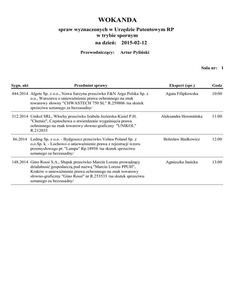 WOKANDA spraw wyznaczonych w Urzędzie Patentowym RP w trybie spornym na dzień: 2015-02-12 Przewodniczący: Artur Pyliński Sala nr: 1 Sygn. akt Przedmiot sprawy 444.2014 Algete Sp. z o.o., Nowa Sarzyna przeciwko F&N Argo Polska Sp. z o.o., Warszawa o unieważnienie prawa ochronnego na znak towarowy słowny "CHWASTECH 750 SL" R.259806 /na skutek sprzeciwu uznanego za bezzasadny/ 312.2014 Unikol SRL, Włochy przeciwko Izabela Jezierska-Kisiel P.H. "Chemiz", Częstochowa o stwierdzenie wygaśnięcia prawa ochronnego na znak towarowy słowno-graficzny "UNIKOL" R.212035 86.2014 Leding Sp. z o.o. - Bydgoszcz przeciwko Voltea Poland Sp. z o.o.Sp. k. - Łochowo o unieważnienie prawa z rejestracji wzoru przemysłowego pt: "Lampa" Rp.18958 /na skutek sprzeciwu uznanego za bezzasadny/ 148.2014 Gino Rossi S.A., Słupsk przeciwko Marcin Lorens prowadzący działalność gospodarczą pod nazwą "Marcin Lorens PPUH", Kraków o unieważnienie prawa ochronnego na znak towarowy słowno-graficzny "Gino Rossi" nr R.253533 /na skutek sprzeciwu uznanego za bezzasadny/ Ekspert (spr.) Godz Agata Filipkowska 10:00 Aleksandra Heromińska 11:00 Bolesław Białkowicz 12:00 Agnieszka Janicka 13:00