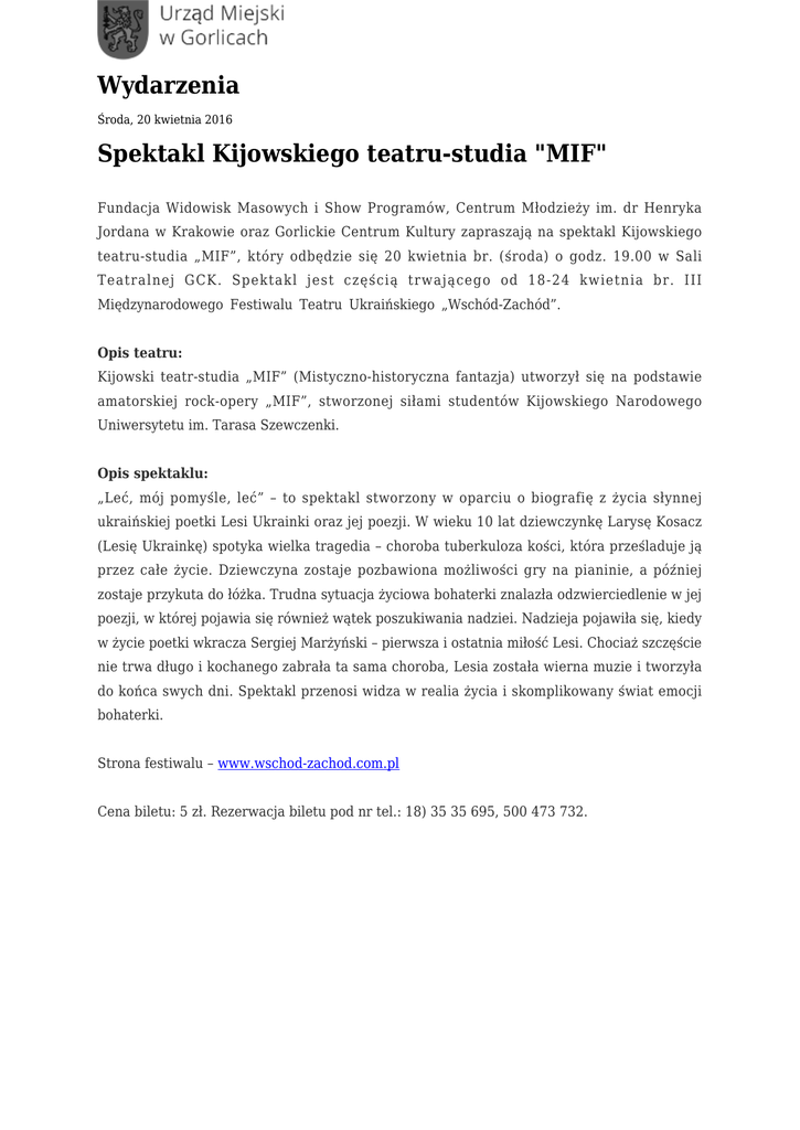 Wydarzenia Środa, 20 kwietnia 2016 Spektakl Kijowskiego teatru-studia "MIF" Fundacja Widowisk Masowych i Show Programów, Centrum Młodzieży im. dr Henryka Jordana w Krakowie oraz Gorlickie Centrum Kultury zapraszają na spektakl Kijowskiego teatru-studia „MIF”, który odbędzie się 20 kwietnia br. (środa) o godz. 19.00 w Sali Teatralnej GCK. Spektakl jest częścią trwającego od 18-24 kwietnia br. III Międzynarodowego Festiwalu Teatru Ukraińskiego „Wschód-Zachód”. Opis teatru: Kijowski teatr-studia „MIF” (Mistyczno-historyczna fantazja) utworzył się na podstawie amatorskiej rock-opery „MIF”, stworzonej siłami studentów Kijowskiego Narodowego Uniwersytetu im. Tarasa Szewczenki. Opis spektaklu: „Leć, mój pomyśle, leć” – to spektakl stworzony w oparciu o biografię z życia słynnej ukraińskiej poetki Lesi Ukrainki oraz jej poezji. W wieku 10 lat dziewczynkę Larysę Kosacz (Lesię Ukrainkę) spotyka wielka tragedia – choroba tuberkuloza kości, która prześladuje ją przez całe życie. Dziewczyna zostaje pozbawiona możliwości gry na pianinie, a później zostaje przykuta do łóżka. Trudna sytuacja życiowa bohaterki znalazła odzwierciedlenie w jej poezji, w której pojawia się również wątek poszukiwania nadziei. Nadzieja pojawiła się, kiedy w życie poetki wkracza Sergiej Marżyński – pierwsza i ostatnia miłość Lesi. Chociaż szczęście nie trwa długo i kochanego zabrała ta sama choroba, Lesia została wierna muzie i tworzyła do końca swych dni. Spektakl przenosi widza w realia życia i skomplikowany świat emocji bohaterki. Strona festiwalu – www.wschod-zachod.com.pl Cena biletu: 5 zł. Rezerwacja biletu pod nr tel.: 18) 35 35 695, 500 473 732.