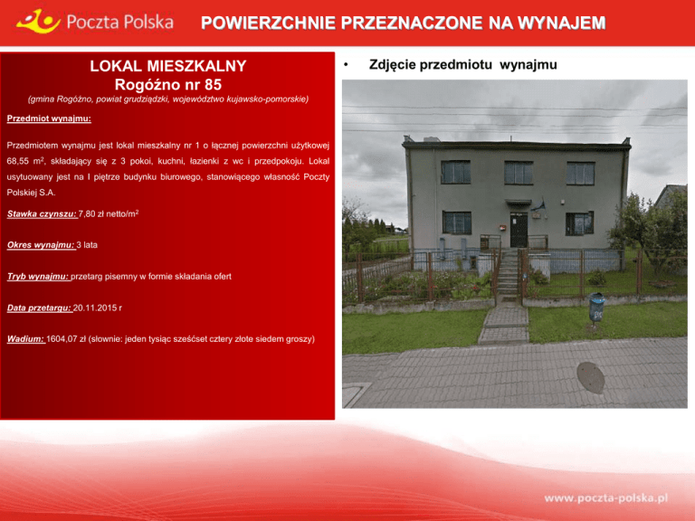 POWIERZCHNIE PRZEZNACZONE NA WYNAJEM LOKAL MIESZKALNY Rogóźno nr 85 (gmina Rogóźno, powiat grudziądzki, województwo kujawsko-pomorskie) Przedmiot wynajmu: Przedmiotem wynajmu jest lokal mieszkalny nr 1 o łącznej powierzchni użytkowej 68,55 m2, składający się z 3 pokoi, kuchni, łazienki z wc i przedpokoju. Lokal usytuowany jest na I piętrze budynku biurowego, stanowiącego własność Poczty Polskiej S.A. Stawka czynszu: 7,80 zł netto/m2 Okres wynajmu: 3 lata Tryb wynajmu: przetarg pisemny w formie składania ofert Data przetargu: 20.11.2015 r Wadium: 1604,07 zł (słownie: jeden tysiąc sześćset cztery złote siedem groszy) • Zdjęcie przedmiotu wynajmu Kliknij i zlokalizuj na mapie Opis przedmiotu wynajmu: Lokal mieszkalny nr 1 usytuowany jest na I piętrze budynku biurowego stanowiącego własność Poczty Polskiej S.A. Składa się z 4 izb o łącznej powierzchni użytkowej 68,55 m², w tym powierzchni pokoi 44,29 m² (1 pokój 11,03 m², 2 pokój 10,86 m², 3 pokój 22,40 m²), kuchni 10,06 m², łazienka z wc 5,85 m², przedpokój 8,35 m². Do lokalu przynależy pomieszczenie w piwnicy o pow. użytkowej 2,71 m². Lokal wyposażony jest w instalacje: elektryczną, centralnego ogrzewania (wspólna kotłownia olejowa), wodno-kanalizacyjną. W pomieszczeniach lokalu zamontowane są grzejniki żeliwne żeberkowe. Stolarka okienna drewniana i PCV, oszklenie pełne. Drzwi wejściowe w stanie dobrym. Podłogi – w pokojach panele, w kuchni terakota, w łazience płytki ceramiczne. Ogólny stan techniczny lokali określić można jako dobry. Niezależnie od czynszu Najemca będzie ponosił opłaty związane z eksploatacją pomieszczeń za centralne ogrzewanie, dostarczenie wody zimnej i odprowadzenie ścieków, wywóz nieczystości stałych, proporcjonalnie do zajmowanej powierzchni. • Pokoje, łazienka i kuchnia Opis nieruchomości: Miejscowość Ulica, nr budynku Powierzchnia budynku, w których zlokalizowany jest przedmiot wynajmu Nr działki ewidencyjnej, obręb Księga wieczysta, Sąd Rejonowy, Nr Wydziału Stan prawny gruntu Rogóźno 85/1 230,02 m2 348/2, obręb Rogóźno TO1U/00011839/1 prowadzoną przez Sąd Rejonowy w Grudziądzu, V Wydział Ksiąg Wieczystych Budynek będący własnością Poczty Polskiej S.A., działka gruntu w użytkowaniu wieczystym. Lokalizacja i dostępność komunikacyjna: Nieruchomość położona jest w m. Rogóźno w powiecie grudziądzkim w województwie kujawsko-pomorskim. Wieś Rogóźno położona jest północnej części powiatu grudziądzkiego. Graniczy od północy z powiatem kwidzyńskim (należącym do województwa pomorskiego), od wschodu z gminą Łasin, od południa z gminą Gruta i od zachodu z gminą Grudziądz. Miejscowość położona jest w odległości 15 km od Grudziądza, 30 km od Kwidzyna i około 80 km od Torunia. Bezpośrednie otoczenie nieruchomości stanowi zabudowa mieszkaniowa jednorodzinna, obiekty handlowe i firmy usługowe. W obrębie nieruchomości znajduje się Urząd Pocztowy. Miejscowość posiada bezpośrednie połączenie z miastem Grudziądz i Kwidzyn poprzez komunikację autobusową i komunikację prywatną (busy). • Mapa sytuacyjna miejscowości Opis nieruchomości: Nieruchomość zabudowana jest budynkiem głównym pocztowym i budynkiem gospodarczym OBWIESZCZENIE O WYNAJMIE LOKALU MIESZKALNEGO Wynajmujący: POCZTA POLSKA S.A. z siedzibą w Warszawie, 00-940 Warszawa, ul. Rodziny Hiszpańskich 8. Prowadzący wybór oferty: Poczta Polska S.A., Pion Infrastruktury, Obszar Operacyjny ds. Nieruchomości w Gdańsku, ul. Targ Rakowy 7/8, 80-940 Gdańsk. Miejsce wyboru oferty: ul. Rynek Staromiejski 15, 87-100 Toruń, pokój nr 125. Przedmiot najmu: Lokal mieszkalny położony w m. Rogóźno 85, o powierzchni użytkowej 68,55 m2, składający się z 3 pokoi, kuchni, łazienki z wc i przedpokoju, do którego przynależy pomieszczenie w piwnicy o pow. użytkowej 2,71 m2. Lokal usytuowany jest na I piętrze budynku biurowego, stanowiącego własność Poczty Polskiej S.A. Charakterystyka nieruchomości: Nieruchomość położona jest w centralnej części miejscowości. Bezpośrednie otoczenie nieruchomości stanowi zabudowa mieszkaniowa jednorodzinna, obiekty handlowe i firmy usługowe. W obrębie nieruchomości znajduje się Urząd Pocztowy. Okres najmu: 3 lata Wywoławcza stawka czynszu netto: 7,80 PLN/ m² (słownie: siedem złotych osiemdziesiąt groszy). Postąpienia: nie dotyczy. Wadium: Warunkiem przystąpienia do przetargu jest wniesienie wadium w wysokości: 1604,07 zł (słownie: jeden tysiąc sześćset cztery złote siedem groszy) Szczegółowe informacje na temat przetargu i warunków najmu zostały zawarte w projekcie umowy najmu, z którymi można się zapoznać w siedzibie Pionu Infrastruktury, Obszar Operacyjny ds. Nieruchomości w Gdańsku, Wydział Zarządzania Nieruchomościami, ul. Targ Rakowy 7/8, 80-940 Gdańsk, I piętro, pokój nr 109, tel. (58) 32-66-107 w godzinach od 8:00 do 14:00. Termin i miejsce składania ofert: 20.11.2015 r. do godz. 11:00. Miejsce: Poczta Polska S.A. Pion Infrastruktury, Dział Administrowania Nieruchomościami i Konserwacji, ul. Rynek Staromiejski 15, 87-100 Toruń. Termin i miejsce otwarcia ofert: 20.11.2015 r. o godz. 11:30. Miejsce: Poczta Polska S.A. Pion Infrastruktury, Dział Administrowania Nieruchomościami i Konserwacji, ul. Rynek Staromiejski 15, 87-100 Toruń, pokój 125. Warunkiem przystąpienia do przetargu jest: 1.Wniesienie wadium przelewem na rachunek bankowy w Banku Pocztowym S.A. w Bydgoszczy nr konta: 85 1320 0019 0099 0718 2000 0025 w terminie do dnia: 19.11.2015 r, przy czym jako termin wpłaty rozumiany jest termin uznania wpłaty na rachunku Poczty Polskiej S.A. z dopiskiem na przelewie w rubryce tytułem: „przetarg lokal mieszkalny Rogóźno 85/1”. 2. Okazanie komisji przetargowej oryginału lub kopii wpłaty wadium. 3. Do dnia składania ofert złożenie przez Oferenta podpisanego formularza ofertowego (druk nr 1) oraz dw