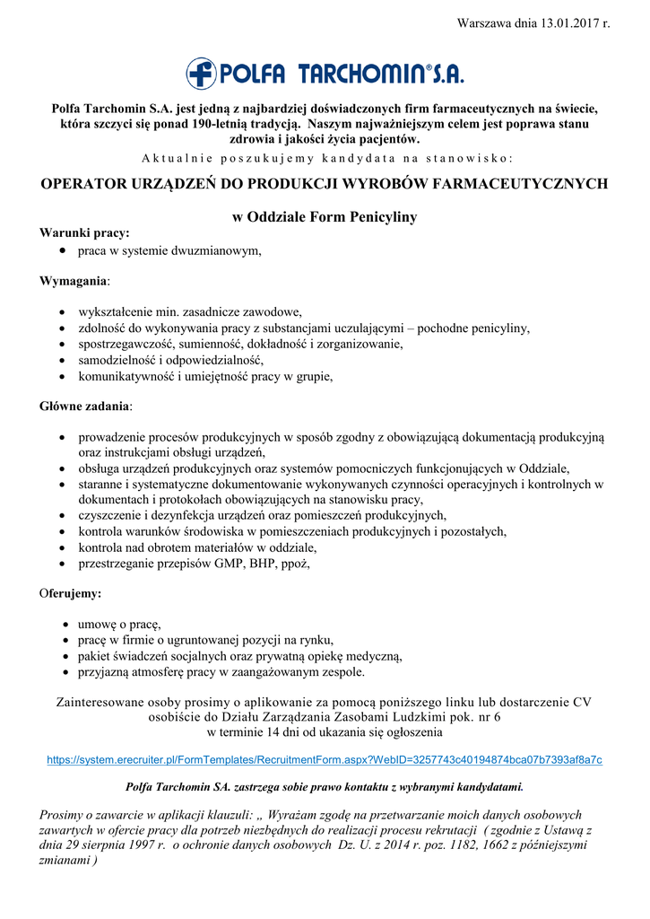 Warszawa dnia 13.01.2017 r. Polfa Tarchomin S.A. jest jedną z najbardziej doświadczonych firm farmaceutycznych na świecie, która szczyci się ponad 190-letnią tradycją. Naszym najważniejszym celem jest poprawa stanu zdrowia i jakości życia pacjentów. Aktualnie poszukujemy kandydata na stanowisko: OPERATOR URZĄDZEŃ DO PRODUKCJI WYROBÓW FARMACEUTYCZNYCH w Oddziale Form Penicyliny Warunki pracy: praca w systemie dwuzmianowym, Wymagania: wykształcenie min. zasadnicze zawodowe, zdolność do wykonywania pracy z substancjami uczulającymi – pochodne penicyliny, spostrzegawczość, sumienność, dokładność i zorganizowanie, samodzielność i odpowiedzialność, komunikatywność i umiejętność pracy w grupie, Główne zadania: prowadzenie procesów produkcyjnych w sposób zgodny z obowiązującą dokumentacją produkcyjną oraz instrukcjami obsługi urządzeń, obsługa urządzeń produkcyjnych oraz systemów pomocniczych funkcjonujących w Oddziale, staranne i systematyczne dokumentowanie wykonywanych czynności operacyjnych i kontrolnych w dokumentach i protokołach obowiązujących na stanowisku pracy, czyszczenie i dezynfekcja urządzeń oraz pomieszczeń produkcyjnych, kontrola warunków środowiska w pomieszczeniach produkcyjnych i pozostałych, kontrola nad obrotem materiałów w oddziale, przestrzeganie przepisów GMP, BHP, ppoż, Oferujemy: umowę o pracę, pracę w firmie o ugruntowanej pozycji na rynku, pakiet świadczeń socjalnych oraz prywatną opiekę medyczną, przyjazną atmosferę pracy w zaangażowanym zespole. Zainteresowane osoby prosimy o aplikowanie za pomocą poniższego linku lub dostarczenie CV osobiście do Działu Zarządzania Zasobami Ludzkimi pok. nr 6 w terminie 14 dni od ukazania się ogłoszenia https://system.erecruiter.pl/FormTemplates/RecruitmentForm.aspx?WebID=3257743c40194874bca07b7393af8a7c Polfa Tarchomin SA. zastrzega sobie prawo kontaktu z wybranymi kandydatami. Prosimy o zawarcie w aplikacji klauzuli: „ Wyrażam zgodę na przetwarzanie moich danych osobowych zawartych w ofercie pracy dla potrzeb niezbędnych do realizacji procesu rekrutacji ( zgodnie z Ustawą z dnia 29 sierpnia 1997 r. o ochronie danych osobowych Dz. U. z 2014 r. poz. 1182, 1662 z późniejszymi zmianami )