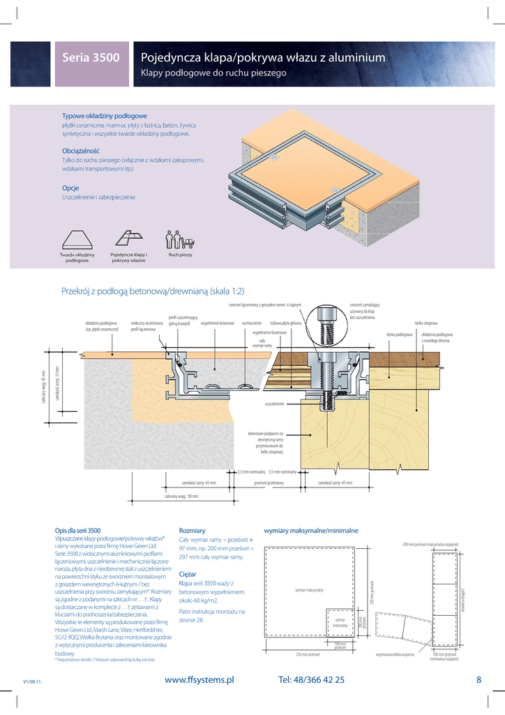 Pojedyncza klapa/pokrywa włazu z aluminium Seria 3500 Klapy podłogowe do ruchu pieszego Typowe okładziny podłogowe p p syntetyczna i wszystkie twarde okładziny podłogowe. Obciążalność T p p wózkami transportowymi itp.) Opcje U p 56789: ;<=79>?@A podłogowe Pojedyncze klapy i pokrywy włazów Ruch pieszy Przekrój z podłogą betonową/drewnianą (skala 1:2) sworzeń zamykający używany do klap bez uszczelnienia sworzeń łączeniowy z gniazdem wewn. 6-kątnym okładzina podłogowa (np. płytki ceramiczne) widoczny aluminiowy profil łączeniowy profil uszczelniający wypełnienie betonowe górną krawędź wzmocnienie belka stropowa stalowa płyta główna wypełnienie tkaninowe deska podłogowa okładzina podłogowa z twardego drewna szerokość ramy: 35 mm zalecany wręg: 45 mm cały wymiar ramy uszczelnienie drewniane podparcie na zewnętrzną ramę przymocowane do belki stropowej 3,5 mm nominalny 3,5 mm nominalny szerokość ramy: 45 mm prześwit przelotowy szerokość ramy: 45 mm zalecany wręg : 90 mm Opis dla serii 3500 Rozmiary W!"#$%$&'( )*&!+ !,-.,/,0(1!,)2+0+ 0.&$304 C p 200 mm prześwit maksymalna rozpiętość 97 mm, np. 200 mm prześwit = 297 mm cały wymiar ramy. betonowym wypełnieniem około 60 kg/m2. rozmiar maksymalny Patrz instrukcja montażu na stronie 28. ozmiar minimalny 100 mm prześwit 250 mm prześwit * Niepotrzebne skreślić. † Wstawić odpowiednią liczbę lub ilość V1/08.11. www.ffsystems.pl dowolna długość 250 mm prześwit Ciężar Kp 100 mm prześwit i ramy wykonane przez firmę Howe Green Ltd Serie 3500 z widocznymi aluminiowymi profilami łączeniowymi, uszczelnienie i mechanicznie łączone naroża, płyta dna z nierdzewnej stali z uszczelnieniem na powierzchni styku ze sworzniem montażowym z gniazdem wewnętrznych 6-kątnym / bez uszczelnienia przy sworzniu zamykającym*. Rozmiary są zgodne z podanymi na szkicach nr …† . Klapy są dostarczane w komplecie z …† zestawami z kluczami do podnoszenia/zabezpieczania. Wszystkie te elementy są produkowane przez firmę Howe Green Ltd, Marsh Lane, Ware, Hertfordshire, SG12 9QQ, Wielka Brytania oraz montowane zgodnie z wytycznymi producenta i zaleceniami kierownika budowy. wymiary maksymalne/minimalne Tel: 48/366 42 25 wyjmowana belka wsporcza 100 mm prześwit minimalna rozpiętość 8