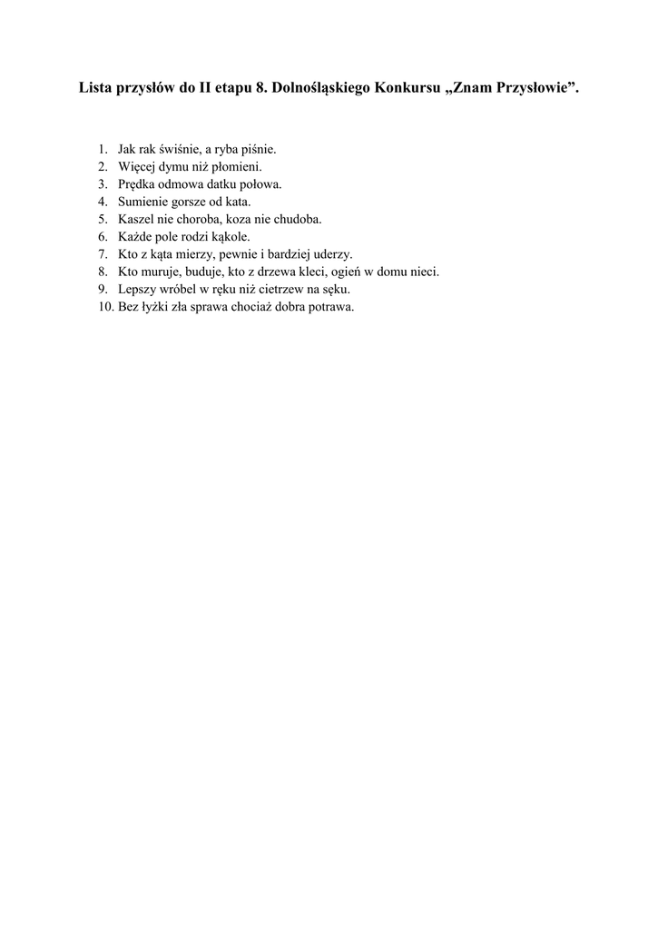 Lista przysłów do II etapu 8. Dolnośląskiego Konkursu „Znam Przysłowie”. 1. Jak rak świśnie, a ryba piśnie. 2. Więcej dymu niż płomieni. 3. Prędka odmowa datku połowa. 4. Sumienie gorsze od kata. 5. Kaszel nie choroba, koza nie chudoba. 6. Każde pole rodzi kąkole. 7. Kto z kąta mierzy, pewnie i bardziej uderzy. 8. Kto muruje, buduje, kto z drzewa kleci, ogień w domu nieci. 9. Lepszy wróbel w ręku niż cietrzew na sęku. 10. Bez łyżki zła sprawa chociaż dobra potrawa.