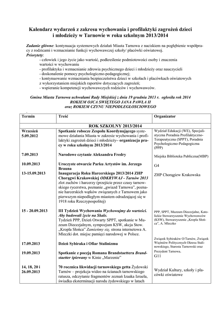 Kalendarz wydarzeń z zakresu wychowania i profilaktyki zagrożeń dzieci i młodzieży w Tarnowie w roku szkolnym 2013/2014 Zadanie główne: kontynuacja systemowych działań Miasta Tarnowa z naciskiem na pogłębienie współpracy z rodzicami i wzmacnianie funkcji wychowawczej szkoły/ placówki oświatowej. Priorytety: - człowiek i jego życie jako wartość, podkreślenie podmiotowości osoby i znaczenia wartości w wychowaniu - profilaktyka i wzmacnianie zdrowia psychicznego dzieci i młodzieży oraz nauczycieli - doskonalenie pomocy psychologiczno-pedagogicznej; - kontynuowanie wzmacniania bezpieczeństwa dzieci w szkołach i placówkach oświatowych z wykorzystaniem miejskich raportów dotyczących zagrożeń; - wspieranie kompetencji wychowawczych rodziców i wychowawców. Gmina Miasta Tarnowa uchwałami Rady Miejskiej z dnia 19 grudnia 2013 r. ogłosiła rok 2014 ROKIEM OJCA SWIĘTEGO JANA PAWŁA II oraz ROKIEM CZYNU NIEPODLEGŁOSCIOWEGO . Termin Treść Organizator ROK SZKOLNY 2013/2014 Wrzesień 5.09.2012 Spotkanie robocze Zespołu Koordynującego systemowe działania Miasta w zakresie wychowania i profilaktyki zagrożeń dzieci i młodzieży– organizacja pracy w roku szkolnym 2013/2014 Wydział Edukacji (WE), Specjalistyczna Poradnia ProfilaktycznoTerapeutyczna (SPPT), Poradnia Psychologiczno-Pedagogiczna (PPP) 7.09.2013 Narodowe czytanie Aleksandra Fredry Miejska Biblioteka Publiczna(MBP) 10.09.2013 Uroczyste otwarcie Parku Artystów im. Jerzego Brauna Inauguracja Roku Harcerskiego 2013/2014 ZHP Chorągwi Krakowskiej ODKRYWAJ - Tarnów 2013 zlot zuchów i harcerzy (przejście przez czasy tarnowskiego rycerstwa, poznanie „gwiazd Tarnowa”, poznanie harcerskich wątków związanych z Tarnowem jako pierwszym niepodległym miastem odradzającej się w 1918 roku Rzeczypospolitej) 13-15.09.2013 15 - 20.09.2013 III Tydzień Wychowania Wychowujmy do wartości. Aby budowali życie na Skale. Tydzień PPP, Dzień Otwarty SPPT, spotkanie w Muzeum Diecezjalnym, sympozjum KSW, akcja Stow. „Kropla Słońca” Zamieńmy się, strona internetowa A. Mleczki dot. miejsc pamięci narodowej w Polsce. 17.09.2013 Dzień Sybiraka i Ofiar Stalinizmu 19.09.2013 Spotkanie z poezją Romana Brandstaettera Brandstaetter śpiewany w Kinie „Marzenie” 14, 18, 20 i 26.09.2013 70 rocznica likwidacji tarnowskiego getta Żydowski Tarnów – projekcja wideo na ścianach tarnowskiego ratusza, odczytanie fragmentów zeznań Izaaka Izraela, świadka eksterminacji narodu żydowskiego w latach G4 ZHP Chorągiew Krakowska PPP, SPPT, Muzeum Diecezjalne, Katolickie Stowarzyszenie Wychowawców (KSW), Stowarzyszenie „Kropla Słońca”, A. Mleczko Związek Sybiraków O/Tarnów, Związek Więźniów Politycznych Okresu Stalinowskiego, Starosta Tarnowski oraz Prezydent Tarnowa. G11 Wydział Kultury, szkoły i placówki oświatowe 1942-1943, symboliczny krąg pamięci. 20.09.2013 27.09.2013 Wernisaż wystawy po XX Ogólnopolskim Plenerze Malarskim Jeżów ‘2013. Małopolska Noc Naukowców – Naukowa Przygoda z Duchami w Szkole Szczepanika, Warsztaty teatralne Tarnowskie Zderzenia Teatralne ZS Plastycznych ZSOiT, Fundacja im. Jana Szczepanika 30.09.2013 Uroczystość przekazania historycznego sztandaru Światowego Związku Żołnierzy AK Koło Tarnów pod opiekę XVI LO w 74. rocznicę powstania Polskiego Państwa Podziemnego oraz Święto Patrona Światowy Związek Żołnierzy AK Koło w Tarnowie, XVI LO 30.09.2013 Uroczystość Święta Patrona Technikum nr 4 im. Tadeusza Tertila ZSMechaniczno-Elektrycznych 30.09.2013 Spektakl Dzień Gniewu wg dramatu Romana Brandstaettera w Pałacyku Strzeleckim 30.09.2013 – 6.10.2013 Obchody Światowego Tygodnia Zwierząt - spotkanie wolontariuszy SCW „Empatia” z przedstawicielami Samorządów Uczniowskich, prelekcje, pokazy, porady weterynaryjne, IX Tarnowska Akcja Charytatywna Przemów ludzkim gestem- zbiórka karmy i datków na leczenie zwierząt, Msza św. z udziałem zwierząt w kościele bernardynów Międzynarodowy Dzień Muzyki - koncert i odsłonięcie pamiątkowej tablicy patrona szkoły Ignacego Jana Paderewskiego Szkolne Centrum Wolontariatu „Empatia” w ZS EkonomicznoOgrodniczych, Fundacja „Zmieńmy świat” 12-13.10.2013 II Ogólnopolski Festiwal Pieśni i Piosenki Religijnej Miłosierdzie Boże wyśpiewać chcę Parafia Miłosierdzia Bożego, UMT, RDN Małopolska i RDN Nowy Sącz, Gość Niedzielny, Duchowy.pl 14 i 30.10.2013 Wybory do Młodzieżowej Rady Miejskiej IV kadencji Ogólnopolskie przedsięwzięcie Pociąg do kariery dla uczniów gimnazjów i szkół ponadgimnazjalnych (doradztwo zawodowe) Pałac Młodzieży (PM), Młodzieżowa Rada Miejska Spotkanie z instytucjami i organizacjami pozarządowymi współpracującymi w ramach działań systemowych Miasta w zakresie wychowania i profilaktyki zagrożeń w PPP WE, PPP, 19.10.2013 „Pozytywny rodzic.pl”- Jak motywować dziecko do nauki – zajęcia warsztatowe dla rodziców i opiekunów Pałac Młodzieży 22.10.2013 Spotkanie na Moście – spotkanie plenerowe dzieci i ich rodziców KANA JUNIOR, KANA PROGRES, prezentacja Mościckiego Ośrodka SzkoleniowoTerapeutycznego MOST Parafia NMP Królowej Polski, Kustosz Sanktuarium bł. Karoliny Kózkówny, Stowarzyszenie „Kanon”, KCEM „KANA” 22.10.2013 r. Uroczyste podsumowanie projektu Życie i twórczość Juliana Tuwima ZSO2 Teatr „Nie Teraz” Październik 1.10.2013 15-20.10.2013 17.10.2013 ZS Muzycznych Wojewódzki Urząd Pracy, PPP 29-31.10.2013 27.10.2013 październik Listopad 5.11.2013 8.11.2013 10.11.2013 II Festiwal Niepodległości Tarnów 2013 (m.in. Wielka Gala Kresowa z Koncertem Bardów w PWSZ i Przegląd Filmowy Imagines Patriae w ramach II Festiwalu Niepodległości; w auli I LO Projekt Festiwal Zawodów w Małopolsce – pilotażowe warsztaty w wybranych gimnazjach w mieście Projekt Korowód Świętych Warsztaty – Propozycje zabaw ruchowych i integracyjnych w edukacji przedszkolnej, wczesnoszkolnej, inspirowane p
