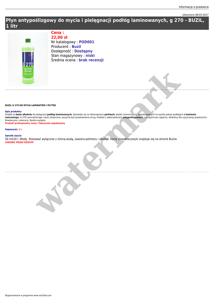Informacje o produkcie Utworzono 08-03-2017 Płyn antypoślizgowy do mycia i pielęgnacji podłóg laminowanych, g 270 - BUZIL, 1 litr Cena : 22,00 zł BUZIL G 270 DO MYCIA LAMINATÓW I PŁYTEK er m ar k Nr katalogowy : POD001 Producent : Buzil Dostępność : Dostępny Stan magazynowy : niski Średnia ocena : brak recenzji Opis produktu: Środek na bazie alkoholu do pielęgnacji podłóg laminowanych. Sprawdza się na lakierowanym parkiecie, płytek ceramicznych, wypolerowanych na wysoki połysk podłogach z kamienia naturalnego. G 270 Laminatreiniger czyści skutecznie, wysycha bez pozostawiania smug. Produkt o właściwościach antypoślizgowych, o przyjemnym zapachu, delikatny dla czyszczonej powierzchni. Rewelacyjny i polecany. Bardzo wydajny Produkt profesjonalny nowy i fabrycznie zapakowany Pojemność: 1 l. Sposób użycia: 50 ml/10 l. Wody. Stosować wyłącznie z zimną wodą, zawiera polimery i alkohol. Karta charakterystyki znajduje się na stronie Buzila w at CHRONIĆ PRZED DZIEĆMI Wygenerowano w programie www.oscGold.com