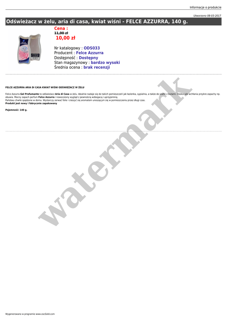 Informacje o produkcie Utworzono 08-03-2017 Odświeżacz w żelu, aria di casa, kwiat wiśni - FELCE AZZURRA, 140 g. Cena : 11,00 zł 10,00 zł Nr katalogowy : ODS033 Producent : Felce Azzurra Dostępność : Dostępny Stan magazynowy : bardzo wysoki Średnia ocena : brak recenzji er m ar k FELCE AZZURRA ARIA DI CASA KWIAT WIŚNI ODŚWIEŻACZ W ŻELU Felce Azzurra Gel Profumante to odświeżacz Aria di Casa w żelu. Idealnie nadaje się do takich pomieszczeń jak łazienka, sypialnia, a także do szafki z butami. Doskonale wchłania przykre zapachy np. obuwia. Mocny zapach perfum Felce Azzurra i nowoczesny wygląd z pewnością wzbogacą i uprzyjemnią Państwu chwile spędzone w domu. Wystarczy zerwać folie i cieszyć się aromatem unoszącym się w pomieszczeniu przez długi czas. Produkt jest nowy i fabrycznie zapakowany w at Pojemność: 140 g. Wygenerowano w programie www.oscGold.com