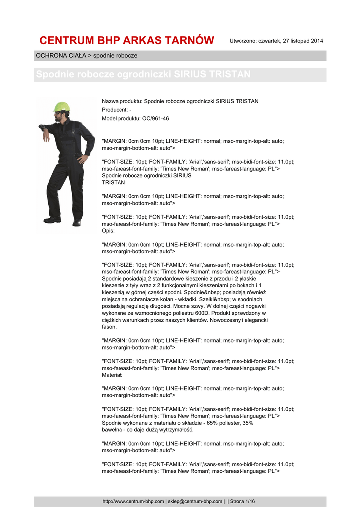 CENTRUM BHP ARKAS TARNÓW Utworzono: czwartek, 27 listopad 2014 OCHRONA CIAŁA > spodnie robocze Spodnie robocze ogrodniczki SIRIUS TRISTAN Nazwa produktu: Spodnie robocze ogrodniczki SIRIUS TRISTAN Producent: Model produktu: OC/961-46 "MARGIN: 0cm 0cm 10pt; LINE-HEIGHT: normal; mso-margin-top-alt: auto; mso-margin-bottom-alt: auto"> "FONT-SIZE: 10pt; FONT-FAMILY: 'Arial','sans-serif'; mso-bidi-font-size: 11.0pt; mso-fareast-font-family: 'Times New Roman'; mso-fareast-language: PL"> Spodnie robocze ogrodniczki SIRIUS TRISTAN "MARGIN: 0cm 0cm 10pt; LINE-HEIGHT: normal; mso-margin-top-alt: auto; mso-margin-bottom-alt: auto"> "FONT-SIZE: 10pt; FONT-FAMILY: 'Arial','sans-serif'; mso-bidi-font-size: 11.0pt; mso-fareast-font-family: 'Times New Roman'; mso-fareast-language: PL"> Opis: "MARGIN: 0cm 0cm 10pt; LINE-HEIGHT: normal; mso-margin-top-alt: auto; mso-margin-bottom-alt: auto"> "FONT-SIZE: 10pt; FONT-FAMILY: 'Arial','sans-serif'; mso-bidi-font-size: 11.0pt; mso-fareast-font-family: 'Times New Roman'; mso-fareast-language: PL"> Spodnie posiadają 2 standardowe kieszenie z przodu i 2 płaskie kieszenie z tyły wraz z 2 funkcjonalnymi kieszeniami po bokach i 1 kieszenią w górnej części spodni. Spodnie posiadają również miejsca na ochraniacze kolan - wkładki. Szelki w spodniach posiadają regulację długości. Mocne szwy. W dolnej części nogawki wykonane ze wzmocnionego poliestru 600D. Produkt sprawdzony w ciężkich warunkach przez naszych klientów. Nowoczesny i elegancki fason. "MARGIN: 0cm 0cm 10pt; LINE-HEIGHT: normal; mso-margin-top-alt: auto; mso-margin-bottom-alt: auto"> "FONT-SIZE: 10pt; FONT-FAMILY: 'Arial','sans-serif'; mso-bidi-font-size: 11.0pt; mso-fareast-font-family: 'Times New Roman'; mso-fareast-language: PL"> Materiał: "MARGIN: 0cm 0cm 10pt; LINE-HEIGHT: normal; mso-margin-top-alt: auto; mso-margin-bottom-alt: auto"> "FONT-SIZE: 10pt; FONT-FAMILY: 'Arial','sans-serif'; mso-bidi-font-size: 11.0pt; mso-fareast-font-family: 'Times New Roman'; mso-fareast-language: PL"> Spodnie wykonane z materiału o składzie - 65% poliester, 35% bawełna - co daje dużą wytrzymałość. "MARGIN: 0cm 0cm 10pt; LINE-HEIGHT: normal; mso-margin-top-alt: auto; mso-margin-bottom-alt: auto"> "FONT-SIZE: 10pt; FONT-FAMILY: 'Arial','sans-serif'; mso-bidi-font-size: 11.0pt; mso-fareast-font-family: 'Times New Roman'; mso-fareast-language: PL"> http://www.centrum-bhp.com | [email protected] | | Strona 1/16 CENTRUM BHP ARKAS TARNÓW Utworzono: czwartek, 27 listopad 2014 OCHRONA CIAŁA > spodnie robocze Spodnie robocze ogrodniczki SIRIUS TRISTAN "FONT-SIZE: 10pt; FONT-FAMILY: 'Arial','sans-serif'; mso-fareast-font-family: 'Times New Roman'; mso-fareast-language: PL"> Wzmocnienia - poliester 600D Gramatura: 270g/m2 "MARGIN: 0cm 0cm 10pt; LINE-HEIGHT: normal; mso-margin-top-alt: auto; mso-margin-bottom-alt: auto"> "FONT-SIZE: 10pt; FONT-FAMILY: 'Arial','sans-serif'; mso-bidi-font-size: 11.0pt; mso-fareast-font-family: 'Times New Roman'; mso-fareast-language: PL"> Kolor: ciemno szary (grafit), czarne elementy z zielonymi wstawkami. "MARGIN: 0cm 0cm 10pt; LINE-HEIGHT: normal; mso-margin-top-alt: auto; mso-margin-bottom-alt: auto"> "FONT-SIZE: 10pt; FONT-FAMILY: 'Arial','sans-serif'; mso-bidi-font-size: 11.0pt; mso-fareast-font-family: 'Times New Roman'; mso-fareast-language: PL"> Rozmiar: Wszystkie ubrania są szyte na wzrost ok 180 cm. Można je swobodnie nosić dla wzrostu od 170 186. "MARGIN: 0cm 0cm 10pt; LINE-HEIGHT: normal; mso-margin-top-alt: auto; mso-margin-bottom-alt: auto"> "BORDER-RIGHT: medium none; BORDER-TOP: medium none; MARGIN: 2.75pt 4.8pt; BORDER-LEFT: medium none; BORDER-BOTTOM: medium none; BORDER-COLLAPSE: collapse; mso-table-layout-alt: fixed; mso-border-alt: solid #548DD4 .5pt; mso-border-themecolor: text2; mso-border-themetint: 153; mso-yfti-tbllook: 1184; mso-table-lspace: 7.05pt; mso-table-rspace: 7.05pt; mso-table-tspace: 5.0pt; mso-table-bspace: 5.0pt; mso-table-anchor-vertical: page; mso-table-anchor-horizontal: margin; mso-table-left: center; mso-table-top: 336.7pt; mso-padding-alt: 0cm 0cm 0cm 0cm; mso-border-insideh: .5pt solid #548DD4; mso-border-insideh-themecolor: text2; mso-border-insideh-themetint: 153; mso-border-insidev: .5pt solid #548DD4; mso-border-insidev-themecolor: text2; mso-border-insidev-themetint: 153" cellspacing="0" cellpadding="0" align="left" border="1"> "HEIGHT: 13.35pt; mso-yfti-irow: 0; mso-yfti-firstrow: yes"> "BORDER-RIGHT: #548dd4 1pt solid; PADDING-RIGHT: 0cm; BORDER-TOP: #548dd4 1pt solid; PADDING-LEFT: 0cm; BACKGROUND: #b8cce4; PADDING-BOTTOM: 0cm; BORDER-LEFT: #548dd4 1pt solid; WIDTH: 68pt; PADDING-TOP: 0cm; BORDER-BOTTOM: #548dd4 1pt solid; HEIGHT: 13.35pt; mso-border-alt: solid #548DD4 .5pt; mso-border-themecolor: text2; mso-border-themetint: 153; mso-background-themecolor: accent1; mso-background-themetint: 102" width="91"> "MARGIN: 0cm 0cm 0pt; LINE-HEIGHT: normal; mso-element: frame; mso-element-frame-hspace: 7.05pt; mso-element-frame-vspace: 5.0pt; http://www.centrum-bhp.com | [email protected] | | Strona 2/16 CENTRUM BHP ARKAS TARNÓW Utworzono: czwartek, 27 listopad 2014 OCHRONA CIAŁA > spodnie robocze Spodnie robocze ogrodniczki SIRIUS TRISTAN mso-element-wrap: around; mso-element-anchor-vertical: page; mso-element-anchor-horizontal: margin; mso-element-left: center; mso-element-top: 336.7pt; mso-height-rule: exactly"> "FONT-SIZE: 10pt; COLOR: black; FONT-FAMILY: 'Arial','sans-serif'; mso-fareast-font-family: 'Times New Roman'; mso-fareast-language: PL"> ROZMIAR: "BORDER-RIGHT: #548dd4 1pt solid; PADDING-RIGHT: 0cm; BORDER-TOP: #548dd4 1pt solid; PADDING-LEFT: 0cm; BACKGROUND: #b8cce4; PADDING-BOTTOM: 0cm; BORDER-LEFT: #d0e3d3; WIDTH: 37.35pt; PADDING-TOP: 0cm; BORDER-BOTTOM: #548dd4 1pt solid; HEIGHT: 13.35pt; mso-border-alt: solid #548DD4 .5pt; mso-border-themecolor: text2; mso-border-themetint: 153; mso-background-themecolor: accent1; mso-background-themetint: 102; mso-border-left-alt: solid #548DD4 .5pt; mso-border-lef