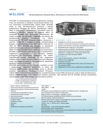SERIA M M’ELODIE Ultrakompaktowa Wysokiej Mocy Wyrównana Liniowo Kolumna Głośnikowa M’ELODIE to ultrakompaktowa kolumna głośnikowa wysokiej mocy, do stosowania w układach wyrównanych liniowo. Jest ona najmniejszą przedstawicielką rodziny MILO. M’elodie niesie ze sobą charakterystyczne brzmienie i łatwość podwieszania dostępną dla kolumn głośnikowych rodziny MILO w połączeniu z niespotykanym stosunkiem mocy do wielkości i obudową mniejszą od kolumny MICA. W rezultacie, M’elodie jest doskonałym rozwiązaniem dla małych teatrów , sal balowych i klubowych, jak również dla zewnętrznych realizacji teatralnych, czy imprez korporacyjnych. M’elodie wytwarza ciśnienie akustyczne o WŁAŚCIWOŚCI i ZALETY • Wyjątkowy stosunek mocy do wielkości wartości 131dB SPL z wyjątkowo płaską charakterystyką • Szerokie i równomierne pokrycie w płaszczyźnie poziomej fazową i częstotliwościową w szerokim paśmie roboczym od • Bardzo małe wymiary utrzymują małą widoczność zestawu 70Hz do 18kHz. M’elodie jest dostępna w specjalnych • Bezproblemowa integracja z serią MICA wykończeniach dopasowanych do estetyki pomieszczenia. • Zawiesia systemu QuickFly i GuideALinks upraszczające Niskie i średnie częstotliwości w zakresie pasma przenoszenia podwieszanie bądź zestawianie naziemne systemu M’elodie są wytwarzane przez dwa, 8 calowe przetworniki z oddzielnie i w połączeniu z kolumnami MICA i/lub magnesami neodymowymi z 1,5 calowymi cewkami zestawem sub‐nisko tonowym 600HP pracującymi w dwu‐drożnej konfiguracji. Dla niskich ZASTOSOWANIA częstotliwości pracują równolegle w celu zwiększenia • Imprezy korporacyjne, „eventy”, sale balowe ciśnienia akustycznego, natomiast jeden z nich jest odłączany • Miejsca kultu religijnego, przed częstotliwością podziału dla zapewnienia optymalnej • Produkcje teatralne zgodności w obszarze podziału. • Podwieszane dogłośnienie frontu sceny, lub samej sceny M’ELODIE wykorzystuje ten sam 3 calowy, z wylotem 1,2 cala dla systemów MICA • Dogłośnienie frontu sceny, nagłośnienie podbalkonowe i neodymowym magnesem przetwornik co MICA, dla uzyskania wygładzonego i poszerzonego pasma w zakresie wysokich częstotliwości, będącego znakiem firmowym rodziny MILO. Przetwornik jest zamontowany na opatentowanym ustroju REM, łączącym go z tubą o stałej charakterystyce , niskich zniekształceniach i 100 stopniowym pokryciu poziomym. Jako element serii M, M’elodie posiada standardowo zainstalowany moduł RMS, zdalnego monitorowania systemu. Zakres roboczy częstotliwości Pasmo przenoszenia na otwartej przestrzeni Maksymalny poziom ciśnienia akustycznego Pokrycie Przetworniki nisko/średnio‐tonowe Przetworniki wysoko‐tonowe Moc wzmacniacza Automatyczny wybór napięcia zasilania Przyłącza audio Przyłącza zasilania Wymiary Waga Wyposażenia dodatkowe QUICKFLY 70Hz‐18kHz* 76Hz‐16kHz +‐ 4dB 131dB 100 stopni w poziomie(pionowe zależne od wielkości grona i konfiguracji) dwa wysokiej mocy 8 calowe, neodymowe jeden 3 calowy , ciśnieniowy, z wylotem 1,2cala 1275W(trzy kanały, 2x500W,1x275W) 2550W mocy szczytowej 85V AC‐134V AC, 166V AC‐264V AC żeńskie wejście XLR z męskim zrównoleglonym wyjściem XLR lub VEAM PowerCon z pętlą równoległą lub VEAM 725mm szer. x 233mm wys. x 324mm głęb. 28,12 kg MG‐M’elodie rama wielozadaniowa główna MCF‐M’elodie rama transportowa, MTF‐MICA/M’elodie połączeniowa rama przejściowa do kolumn MICA lub 600HP MUB‐M’elodie uchwyt montażowy *Zalecany , maksymalny zakres roboczy częstotliwości. Pasmo rzeczywiste zależne od warunków instalacji i akustyki pomieszczenia . ul. Graniczna 17, 05‐092 Łomianki – tel. 022‐751‐8487 – www.polsound.pl