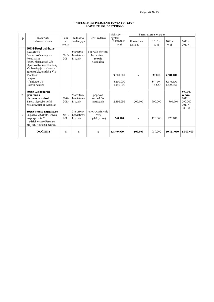 Załącznik Nr 13 WIELOLETNI PROGRAM INWESTYCYJNY POWIATU PRUDNICKIEGO Lp 1 2 3 Rozdział / Nazwa zadania 60014-Drogi publiczne powiatowe Prudnik-WieszczynaPokrzywna Przeb. histor.drogi Gór Opawskich i Zlatohorskiej Vrchowiny jako element europejskiego szlaku Via Montana” w tym: - fundusze UE - środki własne 70005 Gospodarka gruntami i nieruchomościami Zakup nieruchomości zabudowanej ul. Młyńska 80195 Pozost. działalność „Opolska e Szkoła, szkołą ku przyszłości” – udział własny Partnera projektu / dotacja celowa/ OGÓŁEM Termi n realiz. Jednostka realizująca Starostwo 2010- Powiatowe 2011 Prudnik Cel i zadania Nakłady ogółem 2009-2013 w zł Finansowanie w latach Poniesione nakłady 2010 r. w zł 2011 r. w zł 99.000 9.501.000 84.150 14.850 8.075.850 1.425.150 poprawa systemu komunikacji rejonie pogranicza 9.600.000 - 8.160.000 1.440.000 Starostwo 2009- Powiatowe 2013 Prudnik poprawa warunków nauczania 2.500.000 500.000 700.000 500.000 Starostwo 2010- Powiatowe 2011 Prudnik unowocześnienie bazy dydaktycznej 240.000 - 120.000 120.000 500.000 919.000 10.121.000 x x 2012r. 2013r. x 12.340.000 800.000 w tym: 2012r.500.000 2013r.300.000 1.000.000