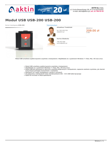 Moduł USB USB-200 USB-200 Numer katalogowy:USB-200 Twój konsultant Arkadiusz Trzebiński tel. 503 030 555 [email protected] NOWOŚĆ W OFERCIE 209.00 zł 209.00 zł z VAT Karina Gładecka 796 603 606 [email protected] Moduł USB umożliwia szybkie łączenie czujników z komputerem. Współdziała on z systemami Windows 7 i Vista, Mac, XO oraz Linux. Moduł USB umożliwia szybkie łączenie czujników z komputerem Współdziała on z systemami Windows 7 i Vista, Mac, XO oraz Linux. Moduł USB jest pierwszym w łańcuchu czujników połączonych z komputerem, zapewnia zasilanie czytników, jak również komunikacje pomiędzy komputerem i czytnikiem Możliwość aż 4 wyjść analogowych i ponad 5 cyfrowych Do połączenia z komputerem służy standaryzowane USC - mini USB kabla łączącego Kabel ten wchodzi w skład opakowania Strona 1 / 1 Powered by TCPDF (www.tcpdf.org)