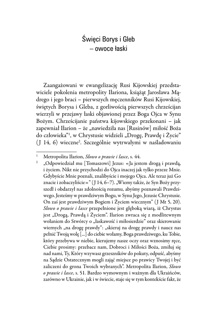 Święci Borys i Gleb – owoce łaski Zaangażowani w ewangelizację Rusi Kijowskiej przedstawiciele pokolenia metropolity Iłariona, książąt Jarosława Mądrego i jego braci – pierwszych męczenników Rusi Kijowskiej, świętych Borysa i Gleba, z gorliwością pierwszych chrześcijan wierzyli w przejawy łaski objawionej przez Boga Ojca w Synu Bożym. Chrześcijanie państwa kijowskiego przekonani – jak zapewniał Iłarion – że „nawiedziła nas [Rusinów] miłość Boża do człowieka”1, w Chrystusie widzieli „Drogę, Prawdę i Życie” ( J 14, 6) wieczne2. Szczególnie wytrwałymi w naśladowaniu 1 2 Metropolita Iłarion, Słowo o prawie i łasce, s. 44. „Odpowiedział mu [Tomaszowi] Jezus: «Ja jestem drogą i prawdą, i życiem. Nikt nie przychodzi do Ojca inaczej jak tylko przeze Mnie. Gdybyście Mnie poznali, znalibyście i mojego Ojca. Ale teraz już Go znacie i zobaczyliście»” ( J 14, 6–7). „Wiemy także, że Syn Boży przyszedł i obdarzył nas zdolnością rozumu, abyśmy poznawali Prawdziwego. Jesteśmy w prawdziwym Bogu, w Synu Jego, Jezusie Chrystusie. On zaś jest prawdziwym Bogiem i Życiem wiecznym” ( J Mt 5, 20). Słowo o prawie i łasce przepełnione jest głęboką wiarą, iż Chrystus jest „Drogą, Prawdą i Życiem”. Iłarion zwraca się z modlitewnym wołaniem do Stwórcy o „łaskawość i miłosierdzie” oraz skierowanie wiernych „na drogę prawdy”: „skieruj na drogę prawdy i naucz nas pełnić Twoją wolę [...] do ciebie wołamy, Boga prawdziwego, ku Tobie, który przebywa w niebie, kierujemy nasze oczy oraz wznosimy ręce, Ciebie prosimy: przebacz nam, Dobroci i Miłości Boża, zmiłuj się nad nami, Ty, Który wzywasz grzeszników do pokuty, odpuść, abyśmy na Sądzie Ostatecznym mogli zająć miejsce po prawicy Twojej i być zaliczeni do grona Twoich wybranych”. Metropolita Iłarion, Słowo o prawie i łasce, s. 51. Bardzo wymownym i ważnym dla Ukraińców, zarówno w Ukrainie, jak i w świecie, staje się w tym kontekście fakt, że 42 Święci Borys i Gleb – owoce łaski Chrystusa prowadzącego do Domu Ojca okazali się w tym okresie (na początku 1000 roku) synowie św. Włodzimierza Chrzciciela – bracia książęta Borys i Gleb. Zaatakowani przez brata uzurpatora, księcia Światopełka, nie podnoszą ręki w obronie swojego życia, upodobniając się do cierpiącego Chrystusa. Jako dobrowolni męczennicy – „strastnoterpci” (cierpiący mękę), dobrowolnie przyjmują śmierć z rąk brata i w swej przepełnionej bratnią miłością przedśmiertnej modlitwie, wolni od oporu i zemsty, proszą Boga o przebaczenie ich zabójcy. Można sądzić, że na rozpoczynający się około roku 1050 rozwój kultu obu braci (zabitych w roku 1015, po śmierci ojca Włodzimierza), miało wpływ wygłoszone w tym czasie, tj. ok. 1045–1050 roku Słowo o prawie i łasce, w którym metropolita Iłarion w następujący sposób mówi o znaczeniu nauczania miłości do Boga i bliźniego, soborów, monasterów, oraz o roli duchowieństwa, mnichów i uczonych w Piśmie Świętym: „Już bowiem nie budujemy pogańskich świątyń dla biesów, lecz Chrystusowe cerkwie wznosimy: już nie zabijamy się nawzajem biesom na ofiarę, lecz Chrystus za nas jest zabijany i dzielony dla Jana Pawła II, mającego głęboką wiedzę o dziejach chrześcijaństwa Europy Wschodniej, a zwłaszcza Ukrainy, słowa: „Chrystus – Drogą, Prawdą i Życiem” stały się myślą przewodnią pielgrzymki papieskiej na Ukrainę w 2001 roku. Z radością i wdzięcznością odebrane zostały skierowane zwłaszcza do Ukraińców słowa papieża: „Wydaje mi się, że oczyma serca rzeczywiście widzę, jak po tej waszej błogosławionej ziemi rozchodzi się nowe światło. Jest to światło, jakim promieniuje odnowione potwierdzenie wyboru dokonanego dalekiego roku 988, kiedy Chrystus został przyjęty przez naród ukraiński jako «Droga, Prawda i Życie»”. Por. Przemówienie powitalne na międzynarodowym lotnisku Boryspol Kijów – 23 czerwca 2001 roku, [w:] W. Mokry, Apostolskie Słowo Jana Pawła II na Ukrainie w 2001 roku, Kraków 2002, s. 300. Por też na ten temat W. Mokry, Chrystus – „Drogą, Prawdą i Życiem”. Myśl przewodnia apostolskiej pielgrzymki na Ukrainę oraz Chrystus – Drogą, Prawdą i Życiem w duszy narodu ukraińskiego w latach 988–2001, tamże, s. 7–39. Święci Borys i Gleb – owoce łaski 43 na ofiarę Bogu Ojcu; już nie skazujemy się na zatratę wiekuistą, spożywając krew ofiarną, lecz zbawienie zyskujemy pijąc przeczystą Krew Chrystusową”3. Zawarte w Słowie... wezwanie do życia zgodnego z ideą chrześcijańskiej miłości do Boga Ojca, braci w Chrystusie i do obowiązku zachowywania przykazania „nie zabijaj” nabiera szczególnej wymowy w kontekście Pochwały Włodzimierza Chrzciciela – ojca wychowanych na prawdziwych chrześcijan Borysa i Gleba, których dosięgła bratobójcza ręka kainowa trzeciego syna, Światopełka. W Pochwale, stanowiącej odrębną część Słowa..., Włodzimierz Chrzciciel sławiony jest jako ten, który „wybrał Chrystusa kierując się jedynie tą dobrą i przenikliwą myślą, że jest tylko jeden Bóg, Stwórca wszystkiego [...] który posłał na ziemię dla naszego zbawienia Syna swego umiłowanego i pomny na to wszystko zanurzyłeś się [zwrot do Włodzimierza] w świętą wodę chrzcielną”4. Wychowani na żywotach świętych5, szczególnie umiłowani przez swego ojca Włodzimierza synowie Borys i Gleb (niewymienieni personalnie w Słowie Iłariona) przedstawieni zostali przez mnicha Nestora w Powieści lat minionych pod datą ich śmierci 1015 i pod datą 1072 – roku ich kanonizacji. W zredagowanej przez Nestora na początku XII wieku (w oparciu o „zwody” z drugiej połowy XI wieku) przedśmiert3 4 5 Metropolita Iłarion, Słowo o prawie i łasce, s. 44. Tamże, s. 47. „W odróżnieniu od innych synów Borys i Gleb pozostają w dom
