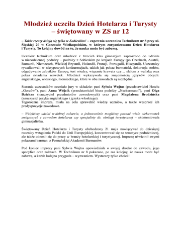 Młodzież uczciła Dzień Hotelarza i Turysty – świętowany w ZS nr 12 – Takie rzeczy dzieją się tylko w Sobieskim! – zapewnia uczennica Technikum nr 8 przy ul. Śląskiej 20 w Gorzowie Wielkopolskim, w którym zorganizowano Dzień Hotelarza i Turysty. To kolejny dowód na to, że nauka może być zabawą. Uczniów technikum oraz młodzież z trzecich klas gimnazjum zaproszono do udziału w niecodziennej podróży – podróży z Sobieskim po krajach Europy (po Czechach, Austrii, Rumunii, Niemczech, Wielkiej Brytanii, Holandii, Francji, Portugalii, Hiszpanii). Uczestnicy rywalizowali w nietypowych konkurencjach, takich jak pokaz barmański, dekoracja stołów, odgadywanie zabytków Europy, test wiedzy, wiązanie krawata czy… slalom z walizką oraz pokaz składania serwetek. Młodzież wykazywała się znajomością języków obcych: angielskiego, włoskiego, niemieckiego, które w obu zawodach są niezbędne. Starania uczestników oceniało jury w składzie: pani Sylwia Wojtas (przedstawiciel Hotelu „Gorzów”), pani Anna Wójcik (przedstawiciel biura podróży „Neckermann”), pani Olga Dziekan (nauczyciel przedmiotów zawodowych) oraz pani Magdalena Brodzińska (nauczyciel języka angielskiego i języka włoskiego). Tegoroczna impreza, miała na celu sprawdzić wiedzę uczniów, a także wesprzeć ich predyspozycje zawodowe. – Wzięliśmy udział w dobrej zabawie, a jednocześnie mogliśmy poznać wiele ciekawostek związanych z zawodem hotelarza czy specjalisty ds. obsługi turystycznej – skomentowała gimnazjalistka. Świętowany Dzień Hotelarza i Turysty obchodzony 21 maja nawiązywał do dziesiątej rocznicy wstąpienia Polski do Unii Europejskiej, koncentrował się na tematyce podróżniczej, ale także odnosił się do pracy w branży hotelarskiej i turystycznej. Imprezę uświetnił swymi pokazami barman z Poznańskiej Akademii Barmanów. Pod koniec imprezy pani Sylwia Wojtas opowiedziała o swojej drodze do zawodu, jego specyfice oraz zaletach. W Technikum nr 8 pokazano, po raz kolejny, że nauka może być zabawą, a każda kolejna przygoda – wyzwaniem. Wystarczy tylko chcieć!