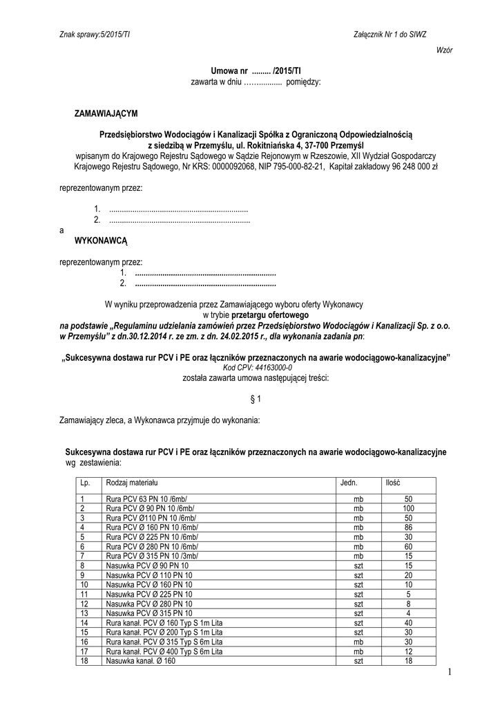 Znak sprawy:5/2015/TI Załącznik Nr 1 do SIWZ Wzór Umowa nr ......... /2015/TI zawarta w dniu ……........... pomiędzy: ZAMAWIAJĄCYM Przedsiębiorstwo Wodociągów i Kanalizacji Spółka z Ograniczoną Odpowiedzialnością z siedzibą w Przemyślu, ul. Rokitniańska 4, 37-700 Przemyśl wpisanym do Krajowego Rejestru Sądowego w Sądzie Rejonowym w Rzeszowie, XII Wydział Gospodarczy Krajowego Rejestru Sądowego, Nr KRS: 0000092068, NIP 795-000-82-21, Kapitał zakładowy 96 248 000 zł reprezentowanym przez: 1. .................................................................. 2. ................................................................... a WYKONAWCĄ reprezentowanym przez: 1. ................................................................... 2. ................................................................... W wyniku przeprowadzenia przez Zamawiającego wyboru oferty Wykonawcy w trybie przetargu ofertowego na podstawie „Regulaminu udzielania zamówień przez Przedsiębiorstwo Wodociągów i Kanalizacji Sp. z o.o. w Przemyślu” z dn.30.12.2014 r. ze zm. z dn. 24.02.2015 r., dla wykonania zadania pn: „Sukcesywna dostawa rur PCV i PE oraz łączników przeznaczonych na awarie wodociągowo-kanalizacyjne” Kod CPV: 44163000-0 została zawarta umowa następującej treści: §1 Zamawiający zleca, a Wykonawca przyjmuje do wykonania: Sukcesywna dostawa rur PCV i PE oraz łączników przeznaczonych na awarie wodociągowo-kanalizacyjne wg zestawienia: Lp. Rodzaj materiału 1 2 3 4 5 6 7 8 9 10 11 12 13 14 15 16 17 18 Rura PCV 63 PN 10 /6mb/ Rura PCV Ø 90 PN 10 /6mb/ Rura PCV Ø110 PN 10 /6mb/ Rura PCV Ø 160 PN 10 /6mb/ Rura PCV Ø 225 PN 10 /6mb/ Rura PCV Ø 280 PN 10 /6mb/ Rura PCV Ø 315 PN 10 /3mb/ Nasuwka PCV Ø 90 PN 10 Nasuwka PCV Ø 110 PN 10 Nasuwka PCV Ø 160 PN 10 Nasuwka PCV Ø 225 PN 10 Nasuwka PCV Ø 280 PN 10 Nasuwka PCV Ø 315 PN 10 Rura kanał. PCV Ø 160 Typ S 1m Lita Rura kanał. PCV Ø 200 Typ S 1m Lita Rura kanał. PCV Ø 315 Typ S 6m Lita Rura kanał. PCV Ø 400 Typ S 6m Lita Nasuwka kanał. Ø 160 Jedn. mb mb mb mb mb mb mb szt szt szt szt szt szt szt szt mb mb szt Ilość 50 100 50 86 30 60 15 15 20 10 5 8 4 40 30 30 12 18 1 Znak sprawy:5/2015/TI 19 20 21 22 23 24 25 26 27 28 29 30 31 32 33 34 35 36 37 38 39 40 41 42 43 44 45 46 47 48 49 50 51 52 53 54 55 56 57 58 59 60 61 62 63 64 65 66 67 68 69 70 71 72 73 74 75 76 77 78 79 80 81 82 Nasuwka kanał. Ø 200 Nasuwka kanał. Ø 315 Rury PE HD SDR 11 PN 16 Ø 32 Rury PE HD SDR 11 PN 16 Ø 40 Rury PE HD SDR 11 PN 16 Ø 50 Rury PE HD SDR 11 PN 16 Ø 63 Rury PE HD SDR 11 PE 100 Ø 90 /12m/ Rury PE HD SDR 11 PE 100 Ø 110 /12m/ Rura PE HD SDR 11 PE 100 Ø 160 /12m/ Rury PE HD SDR 11 PE 100 Ø 200 /12m/ Rura kan. PVC Ø 110 typ S 1m Kolano kan. PVC Ø 110 < 15 Kolano kan. PVC Ø 160 < 15 Rura PE 100 Ø 32 SDR 11 PN 16 jednor. TS Kolano kan. PVC Ø 200 < 15 Kolano kan. PVC Ø 315 < 90 Trójnik kan. PVC Ø 160x160 < 90 Trójnik kan. PVC Ø 200x200 < 90 Trójnik kan. PVC Ø 315x315 < 90 Redukcja kan. PVC 200x160 Redukcja kan. PVC 160x110 Przejście szczelne PVC Ø 200 Przejście szczelne PVC Ø 160 Przejście szczelne PVC Ø 315 Rura kan. PVC Ø 160 Typ S 2m Lita Rura kan. PVC Ø 160 Typ S Lita /6mb/ Rura kan. PVC Ø 200 Typ S 2m Lita Rura kan. PVC Ø 200 Typ S Lita /0,5mb/ Rura kan. PVC Ø 315 Typ S Lita /3mb/ Rura kan. PVC Ø 400 Typ S Lita /3mb/ Łuk PVC PN 10 Ø 90 < 90 Łuk PVC PN 10 Ø 110 < 90 Łuk PVC PN 10 Ø 160 < 90 Łuk PVC PN 10 Ø 250 < 90 Kolano kan. PVC Ø 250 < 45 Kolano kan. PVC Ø 250 < 30 Kolano kan. PVC Ø 250 < 67 Nasuwka kan. Ø 250 Kolano kan. PVC Ø 110 < 30 Kolano kan. PVC Ø 110 < 45 Kolano kan. PVC Ø 110 < 67 Kolano kan. PVC Ø 110 < 90 Kolano kan. PVC Ø 160 < 30 Kolano kan. PVC Ø 160 < 45 Kolano kan. PVC Ø 160 < 67 Kolano kan. PVC Ø 160 < 90 Kolano kan. PVC Ø 200 < 30 Kolano kan. PVC Ø 200 < 45 Kolano kan. PVC Ø 200 < 67 Kolano kan. PVC Ø 200 < 90 Kolano kan. PVC Ø 315 < 15 Kolano kan. PVC Ø 315 < 30 Kolano kan. PVC Ø 315 < 45 Kolano kan. PVC Ø 315 < 67 Rura kan. PVC Ø 250 typ S 3mb Lita Rura kan. Ø 160 typ S 0,5mb Lita Przejście szczelne Ø 400 Mufa elektrooporowa Ø 90 PE 100 SDR 11 Mufa elektrooporowa Ø 110 PE 100 SDR 11 Mufa elektrooporowa Ø 160 PE 100 SDR 11 Tuleja kołn. PE 100 DN 90 SDR 11 Tuleja kołn. PE 100 DN 110 SDR 11 Kineta zbiorcza DN 400/200 PVC lub PP Kineta zbiorcza DN 400/160 PVC lub PP Załącznik Nr 1 do SIWZ szt szt mb mb mb mb mb mb mb mb szt szt szt mb szt szt szt szt szt szt szt szt szt szt mb mb mb szt mb mb szt szt szt szt szt szt szt szt szt szt szt szt szt. szt. szt. szt. szt. szt. szt. szt. szt. szt. szt. szt. mb szt. szt. szt. szt. szt. szt. szt. szt. szt. 20 6 600 600 150 200 300 430 24 24 16 16 16 500 10 2 5 4 4 15 10 20 20 6 30 12 10 25 15 6 2 2 2 1 2 2 2 2 5 5 5 5 5 15 15 15 10 10 15 15 1 1 1 1 9 10 1 5 5 5 10 10 5 5 2 Znak sprawy:5/2015/TI 83 84 85 86 Załącznik Nr 1 do SIWZ Rura wznosząca gładka PVC DN 400 lita Właz teleskopowy 315 D-40T przykręcany Właz teleskopowy 315 D-15T Manszeta gumowa na rurę gładką 400/315 mb szt. szt. szt. 30 10 10 12 Materiały powinny spełniać aktualnie obowiązujące normy. Rury PVC i łączniki PE muszą pochodzić od jednego producenta. §2 Integralną częścią umowy jest oferta złożona w trybie przetargu ofertowego – realizowanego zgodnie z Regulaminem Udzielania Zamówień przez PWIK Sp. z o. o. z dnia 30.12.2014 r. ze zm. z dn. 24.02.2015 r.,(RUZ). §3 1. Termin realizacji przedmiotu zamówienia: sukcesywnie w ciągu roku (tj. przez okres 12 miesięcy licząc od daty podpisania umowy) §4 1. Wykonawca przyjmuje zadania objęte niniejszą umową na podanych warunkach: 1.1. Wykonanie przedmiotu zamówienia zgodnie z Ofertą oraz SIWZ. 1.2. Wykonawca musi dostarczyć zamówione materiały własnym transportem i na własny koszt , do 1 dnia od daty otrzymania szczegółowego zamówienia do PWiK Sp. z o.o. w Przemyślu, (loco: ZUW - Magazyn, przy ul. Rosłońskiego lub Dział Sieci