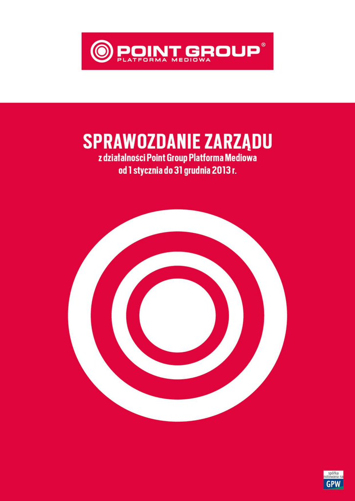 1 Sprawozdanie Zarządu z działalności Platformy Mediowej Point Group Spółka Akcyjna w 2013 roku Spis treści 1. WPROWADZENIE ................................................................................................................................................................................ 4 1.1 PODSTAWOWE INFORMACJE O SPÓŁCE PLATFORMA MEDIOWA POINT GROUP S.A. ....................................................................................... 4 1.2 HISTORIA POWSTANIA I ROZWOJU PMPG S.A....................................................................................................................................... 4 1.3 POSIADANE AKCJE I UDZIAŁY ........................................................................................................................................................... 5 2. OPIS DZIAŁALNOŚCI SPÓŁKI ................................................................................................................................................................... 6 2.1 INFORMACJE O PODSTAWOWYCH PRODUKTACH, TOWARACH LUB USŁUGACH ............................................................................................. 6 2.2 RYNKI ZBYTU I ISTOTNI ODBIORCY ..................................................................................................................................................... 7 3. ISTOTNE WYDARZENIA I DOKONANIA W OKRESIE SPRAWOZDAWCZYM ............................................................................................................ 8 3.1 najważniejsze zdarzenia ........................................................................................................................................................ 8 3.2 NAJWAŻNIEJSZE ZDARZENIA PO DNIU BILANSOWYM…………………………………………………………………………………………...………….………..………10 3.3 UMOWY ZNACZĄCE ZAWARTE PRZEZ EMITENTA W OKRESIE SPRAWOZDAWCZYM……………………………………………………………...……...……….....…10 3.4 UMOWY ZNACZĄCE ZAWARTE PRZEZ EMITENTA PO OKRESIE SPRAWOZDAWCZYM…………………..………………………………………………….……….….…12 3.5 ZMIANY W PODSTAWOWYCH ZASADACH ZARZĄDZANIA PRZEDSIĘBIORSTWEM EMITENTA I JEGO GRUPĄ KAPITAŁOWĄ ......................................... 13 4. PREZENTACJA SYTUACJI FINANSOWEJ EMITENTA ...................................................................................................................................... 13 4.1 ZASADY SPORZĄDZENIA SPRAWOZDANIA FINANSOWEGO...................................................................................................................... 13 4.2 WYNIKI FINANSOWE ................................................................................................................................................................... 14 4.3 ZDARZENIA I CZYNNIKI NIETYPOWE LUB O CHARAKTERZE JEDNORAZOWYM ............................................................................................... 14 4.4 STANOWISKO ODNOŚNIE OPUBLIKOWANYCH SKONSOLIDOWANYCH PROGNOZ WYNIKÓW FINANSOWYCH ........................................................ 14 4.5 CHARAKTERYSTYKA STRUKTURY AKTYWÓW I PASYWÓW BILANSU ........................................................................................................... 14 4.6 UMOWY KREDYTÓW I POŻYCZEK .................................................................................................................................................... 16 4.7 OTRZYMANE ORAZ UDZIELONE GWARANCJE I PORĘCZENIA .................................................................................................................... 17 4.7.1 OTRZYMANE ORAZ UDZIELONE GWARANCJE I PORĘCZENIA PO OKRESIE SPRAWOZDAWCZYM……………………………….……………………………….…17 4.8 INFORMACJE O ISTOTNYCH TRANSAKCJACH Z PODMIOTAMI POWIĄZANYMI............................................................................................... 18 4.9 WSKAŹNIKI FINANSOWE ............................................................................................................................................................... 19 5. CZYNNIKI ROZWOJU ORAZ OPIS RYZYK I ZAGROŻEŃ .................................................................................................................................. 21 5.1 CZYNNIKI OGÓLNOGOSPODARCZE................................................................................................................................................... 21 5.2 CZYNNIKI BRANŻOWE .................................................................................................................................................................. 21 5.3 POKONYWANIE RYZYK I ZAGROŻEŃ ................................................................................................................................................. 22 6. PERSPEKTYWY ROZWOJU EMITENTA ..................................................................................................................................................... 25 6.1 KIERUNKI ROZWOJU .................................................................................................................................................................... 25 6.2 OCENA MOŻLIWOŚCI REALIZACJI ZAMIERZEŃ INWESTYCYJNYCH .............................................................................................................. 26 7. ŁAD KORPORACYJNY ......................................................................................................................................................................... 26 7.1 WSKAZANIE ZASAD ŁADU KORPORACYJNEGO, KTÓRYM PODLEGA EMITENT................................................................................................ 26 7.2 WSKAZANIE ZASAD ŁADU KORPORACYJNEGO, KTÓRE NIE 
