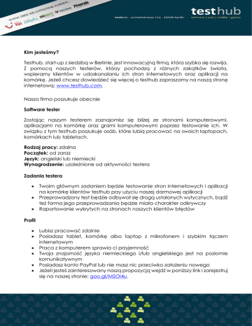 Kim jesteśmy? Testhub, start-up z siedzibą w Berlinie, jest innowacyjną firmą, która szybko się rozwija. Z pomocą naszych testerów, którzy pochodzą z różnych zakątków świata, wspieramy klientów w udoskonalaniu ich stron internetowych oraz aplikacji na komórkę. Jeżeli chcesz dowiedzieć się więcej o testhub zapraszamy na naszą stronę internetową: www.testhub.com. Nasza firma poszukuje obecnie Software tester Zostając naszym testerem zaznajomisz się bliżej ze stronami komputerowymi, aplikacjami na komórkę oraz grami komputerowymi poprzez testowanie ich. W związku z tym testhub poszukuje osób, które lubią pracować na swoich laptopach, komórkach lub tabletach. Rodzaj pracy: zdalna Początek: od zaraz Język: angielski lub niemiecki Wynagrodzenie: uzależnione od aktywności testera Zadania testera    Twoim głównym zadaniem będzie testowanie stron internetowych i aplikacji na komórkę klientów testhub przy użyciu naszej darmowej aplikacji Przeprowadzony test będzie odbywał się drogą ustalonych wytycznych, bądź też forma jego przeprowadzania będzie miała charakter odkrywczy Raportowanie wykrytych na stronach naszych klientów błędów Profil       Lubisz pracować zdalnie Posiadasz tablet, komórkę albo laptop z mikrofonem i szybkim łączem internetowym Praca z komputerem sprawia ci przyjemność Twoja znajomość języka niemieckiego i/lub angielskiego jest na poziomie komunikatywnym Posiadasz konto PayPal lub nie masz nic przeciwko założeniu nowego Jeżeli jesteś zainteresowany naszą propozycją wejdź w poniższy link i zarejestruj się na naszej stronie: goo.gl/MSOI4u.