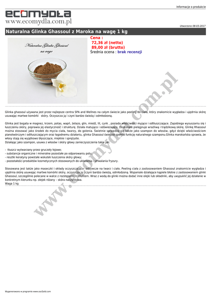 Informacje o produkcie Utworzono 08-03-2017 Naturalna Glinka Ghassoul z Maroka na wagę 1 kg Cena : 72,36 zł (netto) 89,00 zł (brutto) co m .p l Średnia ocena : brak recenzji Glinka ghassoul używana jest przez najlepsze centra SPA and Wellnes na całym świecie jako peeling do ciała, który znakomicie wygładza i ujędrnia skórę usuwając martwe komórki skóry. Oczyszcza ją i czyni bardzo świeżą i odmłodzoną. m yd la . Glinka jest bogata w magnez, krzem, potas, wapń, żelazo, glin, miedź, lit, cynk , posiada właściwości myjące i odtłuszczające. Zapobiega wysuszaniu się i łuszczeniu skóry, poprawia jej elastyczność i strukturę. Działa matująco i odświeżająco. Doskonale pielęgnuje wrażliwą i trądzikową skórę. Glinkę Rhassoul można stosować jako środek do mycia ciała, twarzy, do golenia. Świetnie sprawdza się także jako szampon do włosów, gdyż dzięki właściwościom pianotwórczym i odtłuszczającym oraz łagodnemu działaniu, glinka Ghassoul świetnie spełnia funkcję naturalnego szamponu.Glinka marokańska sprawia, że włosy stają się wyjątkowo błyszczące, miękkie i sprężyste. Działając jako szampon, usuwa z włosów i skóry głowy zanieczyszczenia takie jak: co - tłuszcz wytwarzany przez gruczoły łojowe; - substancje organiczne i mineralne pozostałe po odparowaniu potu; - resztki keratyny powstałe wskutek łuszczenia skóry głowy; - pozostałości produktów kosmetycznych stosowanych do układania i utrwalania fryzury. w w w .e Stosowana jest także jako maseczki i okłady oczyszczająco- odżywcze na twarz i ciało. Peeling ciała z zastosowaniem Ghassoul znakomicie wygładza i ujędrnia skórę usuwając martwe komórki skóry, oczyszcza ją i czyni bardzo świeżą, odmłodzoną. Wspaniale działające kąpiele błotne z zastosowaniem glinki Ghassoul, szczególnie polecane w walce z rozstępami i cellulitem. Wraz z wodą do glinki można dodać inne olejki lub składniki, aby uwypuklić jej działanie w konkretnym kierunku np. olejek różany – skóra naczynkowa. Waga 1 kg Wygenerowano w programie www.oscGold.com