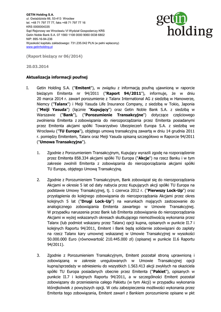 r. pomiędzy Emitentem, Talanx oraz Meiji Yasuda opisaną szczegółowo w Raporcie 94/2011