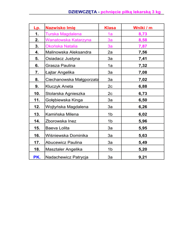 DZIEWCZĘTA - pchnięcie piłką lekarską 3 kg Lp. Nazwisko Imię Klasa Wniki / m 1. 2. Turska Magdalena Wanatowska Katarzyna 1a 3a 8,73 8,58 3. 4. Okońska Natalia Malinowska Aleksandra 3a 2a 7,87 7,56 5. Osiadacz Justyna 3a 7,41 6. Grasza Paulina 1a 7,32 7. Łajtar Angelika 3a 7,08 8. Ciechanowska Małgporzata 3a 7,02 9. Kluczyk Aneta 2c 6,88 10. Stolarska Agnieszka 2c 6,73 11. Gołębiewska Kinga 3a 6,50 12. Wojtyńska Magdalena 3a 6,26 13. Kamińska Milena 1b 6,02 14. Zborowska Inez 1b 5,96 15. Baeva Lolita 3a 5,95 16. Wiśniewska Dominika 3a 5,63 17. Abucewicz Paulina 3a 5,49 18. Masztaler Angelika 1b 5,20 PK. Nadachewicz Patrycja 3a 9,21