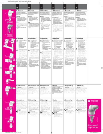 18502248 flexventTop_mont-instr_pms • VOOR A B GB F D 1. Algemeen 1. General 1. Généralités 1. Allgemeines 1. Generelt 1. Allmänt Deze set bevat een Flexvent Top / Super (A), een optionele ventielhuls (B) en instructies (C). This package includes a Flexvent Top / Super (A), optional shut-off valve (B) and instructions (C). Ce kit comprend un Flexvent Top / Super (A), une vanne d’isolement optionnelle (B) et des instructions (C). Denne pakken inneholder Flexvent Top / Super (A), en valgfri lukkeventil (B) og instruksjoner (C). Toepassing • Een Flexvent Top / Super kan worden gebruikt in verwarmingsen koelsystemen met additieven op glycolbasis (max. 50%). Application • A Flexvent Top / Super can be used in heating and chilled systems with additives of glycol (max. 50%). Denna förpackning innehåller en Flexvent Top / Super (A), en avstängningsventil (B) som extratillbehör och instruktioner (C). Veiligheid • Installeer de Flexvent Top / Super in een vorstvrije locatie en op een plek die goed toegankelijk is voor onderhoud • Isoleer de Flexvent Top / Super niet. Application • Un Flexvent Top / Super peut être utilisé dans un système de chauffage et de refroidissement avec des additifs à base de glycol (max. 50%). Im Lieferumfang enthalten sind der Flexvent Top/Super-Entlüfter (A), ein optionales Absperrventil (B) und die Anleitung (C). Safety • Install the Flexvent Top / Super in a frost-free location and in a well accessible place for maintenance. • Do not insulate the Flexvent Top / Super. 2. Installatie 2. Installation Sécurité • Installer the Flexvent Top / Super dans un endroit à l’abri du gel et aisément accessible pour l’entretien. • Ne pas isoler le Flexvent Top / Super. 185.02.248 Flamco NL C N Anwendungsbereich • Flexvent Top/Super-Entlüfter können in Heizungs- und Kühlwassersystemen verwendet werden und sind für Frostschutzadditive auf Glykolbasis (maximaler Anteil 50 %) geeignet. S Anvendelse • Flexvent Top / Super kan brukes i et varme- eller kjølesystem med tilsettingsstoffer på basis av glykol (maks. 50%). Användning • En Flexvent Top / Super kan användas i värme- och kylsystem, med tillsats av glykol (max. 50 %). Sikkerhet • Installer Flexvent Top / Super på et frostfritt sted som er lett Sicherheit tilgjengelig for vedlikehold. • Bauen Sie den Flexvent Top/Super- • Ikke isoler Flexvent Top / Super. Entlüfter an einer frostsicheren Stelle so ein, dass er für Wartungsarbeiten gut zugänglich ist. • Den Flexvent Top/Super-Entlüfter nicht isolieren! Säkerhet • Installera Flexvent Top / Super på en frostfri plats och lätt åtkomlig för underhåll. • Isolera inte Flexvent Top / Super. 2. Installation 2. Installation Flexvent® Top/Super A A D Safety requirements during installation Max. system pressure 10 bar. Min. system pressure 0,2 bar. Max. system supply temperature 120 °C. Min. system temperature -10 °C (with glycol). Laat de installatie uitsluitend door gekwalificeerd personeel uitvoeren. Houd u aan de lokale regelgeving en richtlijnen. Spoel de installatie voldoende door, alvorens de Flexvent Top / Super te installeren. 1. Installeer de Flexvent Top / Super (A) verticaal op het hoogste punt van het systeem. 2. Gebruik afdichttape (D) op de Flexvent Top / Super (A) of op de ventielhuls (B), indien beschikbaar. 3. De uitgang van de Flexvent Super is voorzien van een 22 mm aansluiting voor een afvoerleiding (G). Must be fitted by a competent engineer. Building regulations and local bylaws must be obeyed. Flush the system sufficiently before the installation of the Flexvent Top / Super. 1. Install the Flexvent Top / Super (A) vertical on the highest point of the system. 2. Use sealant material (D) between the connection and the Flexvent Top / Super (A) or on the valve (B), if available. 3. The outlet of the Flexvent Super has a 22 millimetre connection for a drainage pipe (G). 3. Onderhoud en service 3. Maintenance and service 3. Maintenance et service Onderwerp de ontluchter regelmatig aan een visuele controle (minimaal 1 x per jaar). De Flexvent Top / Super kan worden afgesloten door de schroef in de uitgang rechtsom te draaien. Regularly inspect the air release valve visually (at least once a year). The Flexvent Top / Super can be closed by turning the screw in the outlet to the right. Procédez régulièrement à une inspection visuelle du purgeur (au minimum 1 x par an). Le Flexvent Top / Super peut être fermé en tournant la vis dans la sortie vers la droite. Unterziehen Sie den Entlüfter regelmäßig einer visuellen Kontrolle (mindestens 1 x im Jahr). Der Flexvent Top / Super kann abgeschlossen werden, indem Sie die Schraube im Ausgang nach rechts drehen. 4. Demonteren 4. Dismantling 4. Démontage 1. Uitsluitend onderhoud plegen als het systeem afgekoeld is. 2. Maak (alleen bij types zonder ventielhuls) de leiding drukloos. 3. Verwijder de Flexvent Top / Super (A) van de ventielhuls (B), of verwijder de Flexvent Top / Super (A) van het systeem. 1. Carry out maintenance only when system is cold. 2. Release (only by types without a shut off valve) the pressure in the piping. 3. Remove the Flexvent Top / Super (A) from the valve (B), or remove the Flexvent Top / Super (A) from the system. 1. N’effectuer l’entretien que quand le système est froid. 2. Relâcher la pression dans la tuyauterie (uniquement sur les types sans vanne). 3. Dévisser le Flexvent Top / Super (A) de la vanne (B), ou dévisser le Flexvent Top / Super (A) du système. A D 2. Installation Veiligheidseisen tijdens de installatie Max. systeemdruk 10 bar. Min. systeemdruk 0,2 bar. Max. systeemtoevoertemperatuur 120 °C. Min. systeemtemperatuur -10 °C (met glycol). Exigences de sécurité pendant l’installation Pression de système maxi 10 bars. Pression de système mini 0,2 bar. Température de départ maxi du système 120 °C. Température mini du système -10 °C (avec glycol). Seul du personnel compétent doit procéd