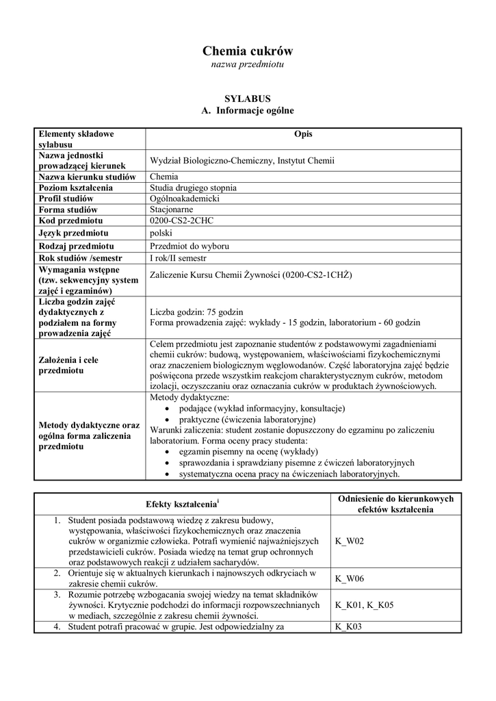 Chemia cukrów nazwa przedmiotu SYLABUS A. Informacje ogólne Elementy składowe sylabusu Nazwa jednostki prowadzącej kierunek Nazwa kierunku studiów Poziom kształcenia Profil studiów Forma studiów Kod przedmiotu Język przedmiotu Rodzaj przedmiotu Rok studiów /semestr Wymagania wstępne (tzw. sekwencyjny system zajęć i egzaminów) Liczba godzin zajęć dydaktycznych z podziałem na formy prowadzenia zajęć Założenia i cele przedmiotu Metody dydaktyczne oraz ogólna forma zaliczenia przedmiotu Opis Wydział Biologiczno-Chemiczny, Instytut Chemii Chemia Studia drugiego stopnia Ogólnoakademicki Stacjonarne 0200-CS2-2CHC polski Przedmiot do wyboru I rok/II semestr Zaliczenie Kursu Chemii Żywności (0200-CS2-1CHŻ) Liczba godzin: 75 godzin Forma prowadzenia zajęć: wykłady - 15 godzin, laboratorium - 60 godzin Celem przedmiotu jest zapoznanie studentów z podstawowymi zagadnieniami chemii cukrów: budową, występowaniem, właściwościami fizykochemicznymi oraz znaczeniem biologicznym węglowodanów. Część laboratoryjna zajęć będzie poświęcona przede wszystkim reakcjom charakterystycznym cukrów, metodom izolacji, oczyszczaniu oraz oznaczania cukrów w produktach żywnościowych. Metody dydaktyczne: podające (wykład informacyjny, konsultacje) praktyczne (ćwiczenia laboratoryjne) Warunki zaliczenia: student zostanie dopuszczony do egzaminu po zaliczeniu laboratorium. Forma oceny pracy studenta: egzamin pisemny na ocenę (wykłady) sprawozdania i sprawdziany pisemne z ćwiczeń laboratoryjnych systematyczna ocena pracy na ćwiczeniach laboratoryjnych. Efekty kształceniai 1. Student posiada podstawową wiedzę z zakresu budowy, występowania, właściwości fizykochemicznych oraz znaczenia cukrów w organizmie człowieka. Potrafi wymienić najważniejszych przedstawicieli cukrów. Posiada wiedzę na temat grup ochronnych oraz podstawowych reakcji z udziałem sacharydów. 2. Orientuje się w aktualnych kierunkach i najnowszych odkryciach w zakresie chemii cukrów. 3. Rozumie potrzebę wzbogacania swojej wiedzy na temat składników żywności. Krytycznie podchodzi do informacji rozpowszechnianych w mediach, szczególnie z zakresu chemii żywności. 4. Student potrafi pracować w grupie. Jest odpowiedzialny za Odniesienie do kierunkowych efektów kształcenia K_W02 K_W06 K_K01, K_K05 K_K03 bezpieczeństwo pracy własnej i innych. 5. Planuje i wykonuje ćwiczenia laboratoryjne z zachowaniem podstawowych zasad BHP. Potrafi przedstawić i wyjaśnić wyniki przeprowadzonych eksperymentów. Punkty ECTS Bilans nakładu pracy studentaii Wskaźniki ilościowe Data opracowania: K_W07, K_U01, K_U07 5 Ogólny nakład pracy studenta: 125 godz. w tym: udział w zajęciach: 60 godz.; przygotowanie się do zajęć, zaliczeń i egzaminu: 40,6 godz.; udział w konsultacjach, zaliczeniach, egzaminie: 9,4 godz. Punkty Nakład pracy studenta związany z zajęciami iii: Liczba godzin ECTS wymagającymi bezpośredniego udziału 84,4 3,4 nauczyciela 110,0 4,4 o charakterze praktycznym 24.02.2015 Koordynator przedmiotu: Dr hab. Stanisław Witkowski, prof. UwB SYLABUS B. Informacje szczegółowe Elementy składowe sylabusu Opis Nazwa przedmiotu Kod przedmiotu Nazwa kierunku Nazwa jednostki prowadzącej kierunek Język przedmiotu Rok studiów/ semestr Chemia cukrów 0200-CS2-2CHC Chemia Wydział Biologiczno-Chemiczny, Instytut Chemii polski I rok/II semestr Liczba godzin zajęć dydaktycznych oraz forma prowadzenia zajęć Prowadzący Treści merytoryczne przedmiotu Liczba godzin: 15 godz. Forma prowadzenia zajęć: wykład Dr hab. Stanisław Witkowski, prof. UwB 1. Węglowodany, budowa, podział. Reakcje charakterystyczne. Monosacharydy. Ustalanie budowy. Budowa przestrzenna cukrów. Konformacje cukrów. Efekt anomeryczny. 2. Nomenklatura cukrów. Reakcje chemiczne cukrów w środowisku kwaśnym i alkalicznym. Grupy ochronne w chemii cukrów. 3. Glikozydy. Budowa i właściwości. Synteza glikozydów. Mechanizm i stereochemia reakcji glikozydowania. Najważniejsze metody syntezy wiązania glikozydowego. 4. N-glikozydy, S-glikozydy, C-glikozydy. 5. Oligosacharydy. Budowa i właściwości chemiczne. Najważniejsi przedstawiciele oligosacharydów: sacharoza, laktoza, maltoza, celobioza, rafinoza, cyklodekstryny. 6. Polisacharydy. Budowa i właściwości najważniejszych polisacharydów: skrobia, glikogen, celuloza. 7. Cukry nienasycone. Kwasy glikuronowe. Aminocukry. Deoksycukry. Alditole i cyklitole. Student posiada podstawową wiedzę z zakresu budowy, występowania, właściwości fizykochemicznych oraz znaczenia cukrów w organizmie człowieka. Potrafi wymienić najważniejszych przedstawicieli cukrów. Posiada wiedzę na temat grup ochronnych oraz podstawowych reakcji z udziałem sacharydów. Rozumie potrzebę wzbogacania swojej wiedzy na temat składników żywności. Krytycznie podchodzi do informacji rozpowszechnianych w mediach, szczególnie z zakresu chemii żywności. Efekty kształcenia wraz ze sposobem ich weryfikacji Forma i warunki zaliczenia przedmiotu Wykaz literatury podstawowej i uzupełniającej Efekty kształcenia będą sprawdzane na podstawie oceny z egzaminu pisemnego. Warunkiem dopuszczenia do egzaminu jest zaliczenie laboratorium (wykonanie wszystkich ćwiczeń, przedstawienie sprawozdań, zaliczenie sprawdzianu pisemnego). Obecność na wykładach nie jest warunkiem koniecznym do przystąpienia do egzaminu. Zaliczenie przedmiotu: egzamin pisemny na ocenę. 1. A. Wiśniewski, J. Madaj - Podstawy chemii cukrów Wydawnictwo Agra-Enviro Lab., Poznań-Gdańsk 1997 2. D. E. Levy, P. Fügedi Eds - The Organic Chemistry of Sugars - CRC Press, Boca Raton 2006 3. G.-J. Boons, Ed. - Carbohydrate Chemistry 4. T. H. Lindhorst - Essentials of Carbohydrate Chemistry and Biochemistry - Willey-VCH Verlag 2007 5. D. Horton Ed. - Advances in Carbohydrate Chemistry and Biochemistry - The American University, Washington, DC, USA 6. M. L. Wolfrom, R. L Whistler - Methods in Carbohydrate Chem