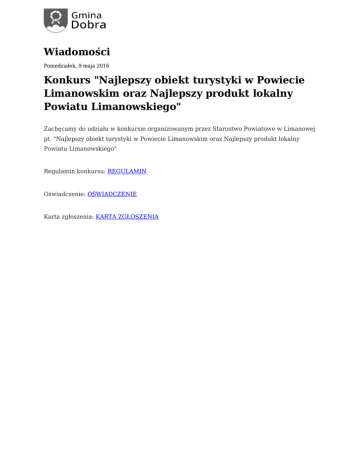 Wiadomości Poniedziałek, 9 maja 2016 Konkurs "Najlepszy obiekt turystyki w Powiecie Limanowskim oraz Najlepszy produkt lokalny Powiatu Limanowskiego" Zachęcamy do udziału w konkursie organizowanym przez Starostwo Powiatowe w Limanowej pt. "Najlepszy obiekt turystyki w Powiecie Limanowskim oraz Najlepszy produkt lokalny Powiatu Limanowskiego" Regulamin konkursu: REGULAMIN Oświadczenie: OŚWIADCZENIE Karta zgłoszenia: KARTA ZGŁOSZENIA