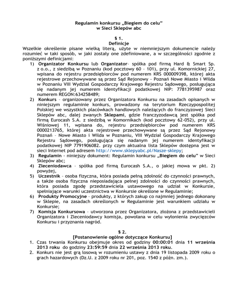 Regulamin konkursu „Biegiem do celu” w Sieci Sklepów abc § 1. Definicje Wszelkie określenie pisane wielką literą, użyte w niemniejszym dokumencie należy rozumieć w taki sposób, w jaki zostały one zdefiniowane, a w szczególności zgodnie z poniższymi definicjami: 1) Organizator Konkursu lub Organizator– spółka pod firmą Hard & Smart Sp. z o.o., z siedzibą w Poznaniu (kod pocztowy 60 – 101), przy ul. Komornickiej 27, wpisana do rejestru przedsiębiorców pod numerem KRS 000009398, której akta rejestrowe przechowywane są przez Sąd Rejonowy - Poznań Nowe Miasto i Wilda w Poznaniu VIII Wydział Gospodarczy Krajowego Rejestru Sądowego, posługująca się nadanym jej numerem identyfikacji podatkowej NIP: 7781395987 oraz numerem REGON:634258489; 2) Konkurs – organizowany przez Organizatora Konkursu na zasadach opisanych w niniejszym regulaminie konkurs, prowadzony na terytorium Rzeczypospolitej Polskiej we wszystkich placówkach handlowych należących do franczyzowej Sieci Sklepów abc, dalej zwanych Sklepami, gdzie franczyzodawcą jest spółka pod firmą Eurocash S.A. z siedzibą w Komornikach (kod pocztowy 62-052), przy ul. Wiśniowej 11, wpisana do, rejestru przedsiębiorców pod numerem KRS 0000213765, której akta rejestrowe przechowywane są przez Sąd Rejonowy Poznań – Nowe Miasto i Wilda w Poznaniu, VIII Wydział Gospodarczy Krajowego Rejestru Sądowego, posługująca się nadanym jej numerem identyfikacji podatkowej NIP 7791906082. przy czym aktualna lista Sklepów dostępna jest w sieci Internet pod adresem http://www.sklepyabc.pl/Nasze-sklepy; 3) Regulamin - niniejszy dokument: Regulamin konkursu „Biegiem do celu” w Sieci Sklepów abc; 4) Zleceniodawca – spółka pod firmą Eurocash S.A., o jakiej mowa w pkt. 2) powyżej, 5) Uczestnik – osoba fizyczna, która posiada pełną zdolność do czynności prawnych, a także osoba fizyczna nieposiadająca pełnej zdolności do czynności prawnych, która posiada zgodę przedstawiciela ustawowego na udział w Konkursie, spełniające warunki uczestnictwa w Konkursie określone w Regulaminie; 6) Produkty Promocyjne – produkty, z których zakup co najmniej jednego dokonany w Sklepie, na zasadach określonych w Regulaminie jest warunkiem udziału w Konkursie; 7) Komisja Konkursowa – utworzona przez Organizatora, złożona z przedstawicieli Organizatora i Zleceniodawcy komisja, powołana w celu wyłonienia zwycięzców Konkursu i przyznania nagród. § 2. [Postanowienie ogólne dotyczące Konkursu] 1. Czas trwania Konkursu obejmuje okres od godziny 00:00:01 dnia 11 września 2013 roku do godziny 23:59:59 dnia 22 września 2013 roku. 2. Konkurs nie jest grą losową w rozumieniu ustawy z dnia 19 listopada 2009 roku o grach hazardowych (Dz.U. z 2009 roku nr 201, poz. 1540 z późn. zm.). § 3. [Warunki udziału w Konkursie] 1. W Konkursie nie mogą uczestniczyć pracownicy ani współpracownicy Zleceniodawcy ani osoby prowadzące Sklepy oraz ich pracownicy i w współpracownicy, a także te osoby, które są lub będą w czasie trwania Promocji w I (słownie: pierwszej) lub II (słownie: drugiej) grupie podatkowej w rozumieniu przepisów ustawy z dnia 28 lipca 1983 roku o podatku od spadków i darowizn (t.j. Dz. U. 2009 r., Nr 93, poz. 768, z późn. zm.) wobec współpracowników lub pracowników Zleceniodawcy lub Organizatora, osób prowadzących Sklepy lub ich pracowników lub współpracowników. 2. Warunkiem uczestnictwa w Konkursie, jest dokonanie przez Uczestnika w jednym ze Sklepów, w okresie od 12 września 2013 roku do 22 września 2013 roku, potwierdzonego paragonem fiskalnym lub fakturą VAT, zwanymi dalej łącznie i każdy z osobna Dowodem Zakupu, zakupu dowolnie wybranych Produktów Promocyjnych wymienionych w postanowieniach § 4 ust. 1 Regulaminu, o minimalnej łącznej wartości 10,00 (słownie: dziesięć 00/100) złotych, stwierdzonej jednym Dowodem Zakupu oraz wykonanie Zadania Konkursowego, na zasadach opisanych w postanowieniach § 4 ust. 3 i kolejne Regulaminu. 3. Każdy Uczestnik może wziąć udział w Konkursie wielokrotnie, dokonując wielu zakupów Produktów Promocyjnych o minimalnej wartości 10,00 (słownie: dziesięć 00/100) złotych, przy czym każdy zakup musi zostać stwierdzony odrębnym Dowodem Zakupu, i wielokrotnie wykonując Zadanie Konkursowe, jednakże zgodnie z zasadą, że na jedno Zadanie Konkursowe winien przypadać jeden Dowód Zakupu. 1. 2. 3. 4. 5. 6. § 4. [Produkty Promocyjne, Zadanie Konkursowe] Produktami Promocyjnymi są następujące produkty: 1) Wszystkie produkty z gazetki reklamowej ukazującej się w Sieci Sklepów abc w terminie 12.09.2013 – 22.09.2013r. Dowód Zakupu stanowi jedyne potwierdzenie dokonania przez Uczestnika zakupu Produktów Promocyjnych i musi zostać zachowany przez Uczestnika w celu przedstawienia go Organizatorowi celem weryfikacji spełnienia przez Uczestnika warunków udziału w Konkursie, co stanowi warunek konieczny odbioru przez Uczestnika nagrody, w przypadku jego wygranej w Konkursie. Zadanie Konkursowe polega na wysłaniu wiadomości sms z jak najbardziej pomysłową (kreatywną) odpowiedzią na pytanie konkursowe: „Jak radzisz sobie w wymagających sytuacjach?”. Zadanie Konkursowe należy wykonać w terminie od godziny 00:00:01 dnia 12 września 2013 roku do godziny 23:59:59 dnia 22 września 2013 roku, przesyłając w tym terminie wiadomość sms w formacie abc.nr Dowodu Zakupu. kreatywna odpowiedź na pytanie konkursowe, na nr telefonu 70120, koszt wiadomości sms wynosi 0,62 zł (sześćdziesiąt dwa grosze) brutto. Wiadomości sms wysłane przed lub po wskazanym w postanowieniach ust. 3 powyżej terminie lub niezawierające chociażby jednego z elementów, o jakich mowa w postanowieniach ust. 3 powyżej lub niezgodne z formatem wiadomości sms określonym w ustępie poprzedzającym, nie będą brane przez Organizatora pod uwagę, a ich przesłanie nie będzie oznaczało wykonania Zadania Konkursowego.