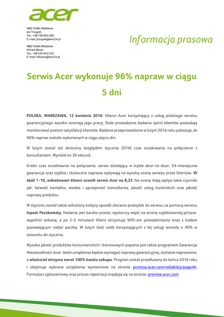 WĘC Public Relations Jan Trzupek Tel.: +48 730 954 282 E-mail: [email protected] Informacja prasowa WĘC Public Relations Miriam Baran Tel.: +48 535 954 232 E-mail: [email protected] Serwis Acer wykonuje 96% napraw w ciągu 5 dni POLSKA, WARSZAWA, 12 kwietnia 2016: Klienci Acer korzystający z usług polskiego serwisu gwarancyjnego wysoko oceniają jego pracę. Stale prowadzone badania opinii klientów pozwalają monitorować poziom satysfakcji klientów. Badanie przeprowadzone w lutym 2016 roku pokazuje, że 96% napraw zostało wykonanych w ciągu pięciu dni. W lutym został też skrócony (względem stycznia 2016) czas oczekiwania na połączenie z konsultantem. Wyniósł on 30 sekund. Krótki czas oczekiwania na połączenie, serwis działający w trybie door-to-door, 24-miesięczna gwarancja oraz szybka i skuteczna naprawa wpływają na wysoką ocenę serwisu przez klientów. W skali 1-10, ankietowani klienci ocenili serwis Acer na 8,23. Na ocenę mają wpływ takie czynniki jak: łatwość kontaktu, wiedza i uprzejmość konsultanta, jakość usług kurierskich oraz jakość naprawy produktu. W styczniu został także wdrożony kolejny sposób zlecania przesyłek do serwisu za pomocą serwisu Inpost Paczkomaty. Nadanie jest bardzo proste, wystarczy wejść na stronę szybkiezwroty.pl/acer, wypełnić ankietę, a po 3-5 minutach Klient otrzymuje SMS-em powiadomienie wraz z kodem pozwalającym nadać paczkę. W lutym ilość osób korzystających z tej usługi wzrosła o 40% w stosunku do stycznia. Wysoka jakość produktów konsumenckich i biznesowych poparta jest także programem Gwarancja Niezawodności Acer. Jeżeli urządzenie będzie wymagać naprawy gwarancyjnej, zostanie naprawione, a właściciel otrzyma zwrot 100% kosztu zakupu. Program został przedłużony do końca 2016 roku i obejmuje wybrane urządzenia wymienione na stronie promise.acer.com/reliability/page4h. Formularz zgłoszeniowy oraz proces rejestracji znajdują się na stronie: promise.acer.com O firmie Acer Założona w roku 1976 firma Acer prowadzi działalność w dziedzinie technologii informatycznych i komunikacyjnych oraz związanych z nimi usług. Swoją uwagę koncentruje na pracach badawczorozwojowych, projektowaniu, marketingu oraz sprzedaży innowacyjnych produktów ułatwiających życie, a także na zapewnianiu pomocy technicznej. Oferta produktów Acer obejmuje komputery PC, monitory, projektory, serwery, tablety i smartfony, a także akcesoria. Firma opracowuje również rozwiązania chmurowe, łącząc Internet przedmiotów. Acer zatrudnia 7000 pracowników i zajmuje 4. miejsce na świecie w ogólnym segmencie komputerów osobistych (IDC 2014). W roku 2014 przychody firmy wyniosły 10,39 miliarda USD. Więcej informacji na stronie www.acer.com. ©2016 Acer. Wszelkie prawa zastrzeżone. Acer oraz logo Acer są zarejestrowanymi znakami towarowymi Acer Inc. Pozostałe znaki towarowe, zarejestrowane znaki towarowe i znaki usługowe, zarówno widoczne, jak i niewidoczne, stanowią własność swoich właścicieli.