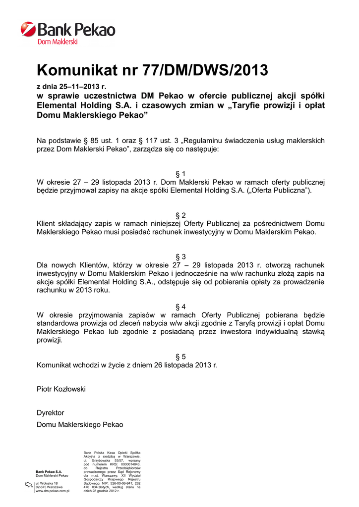 Komunikat nr 77/DM/DWS/2013 z dnia 25–11–2013 r. w sprawie uczestnictwa DM Pekao w ofercie publicznej akcji spółki Elemental Holding S.A. i czasowych zmian w „Taryfie prowizji i opłat Domu Maklerskiego Pekao” Na podstawie § 85 ust. 1 oraz § 117 ust. 3 „Regulaminu świadczenia usług maklerskich przez Dom Maklerski Pekao”, zarządza się co następuje: §1 W okresie 27 – 29 listopada 2013 r. Dom Maklerski Pekao w ramach oferty publicznej będzie przyjmował zapisy na akcje spółki Elemental Holding S.A. („Oferta Publiczna”). §2 Klient składający zapis w ramach niniejszej Oferty Publicznej za pośrednictwem Domu Maklerskiego Pekao musi posiadać rachunek inwestycyjny w Domu Maklerskim Pekao. §3 Dla nowych Klientów, którzy w okresie 27 – 29 listopada 2013 r. otworzą rachunek inwestycyjny w Domu Maklerskim Pekao i jednocześnie na w/w rachunku złożą zapis na akcje spółki Elemental Holding S.A., odstępuje się od pobierania opłaty za prowadzenie rachunku w 2013 roku. §4 W okresie przyjmowania zapisów w ramach Oferty Publicznej pobierana będzie standardowa prowizja od zleceń nabycia w/w akcji zgodnie z Taryfą prowizji i opłat Domu Maklerskiego Pekao lub zgodnie z posiadaną przez inwestora indywidualną stawką prowizji. §5 Komunikat wchodzi w życie z dniem 26 listopada 2013 r. Piotr Kozłowski Dyrektor Domu Maklerskiego Pekao Bank Pekao S.A. Dom Maklerski Pekao ul. Wołoska 18 02-675 Warszawa www.dm.pekao.com.pl Bank Polska Kasa Opieki Spółka Akcyjna z siedzibą w Warszawie, ul. Grzybowska 53/57, wpisany pod numerem KRS: 0000014843, do Rejestru Przedsiębiorców prowadzonego przez Sąd Rejonowy dla m.st. Warszawy, XII Wydział Gospodarczy Krajowego Rejestru Sądowego; NIP: 526-00-06-841; 262 470 034 złotych, według stanu na dzień 28 grudnia 2012 r. Zastrzeżenie prawne: Niniejszy materiał nie jest przeznaczony do rozpowszechniania na terytorium albo do Stanów Zjednoczonych Ameryki, ani w innych państwach, w których rozpowszechnianie informacji zawartych w niniejszym materiale może podlegać ograniczeniom lub być zakazane przez prawo. Niniejszy dokument ma charakter wyłącznie promocyjny i nie stanowi prospektu w rozumieniu przepisów prawnych, za pośrednictwem których dokonano implementacji Dyrektywy 2003/71/WE z późn. zm. (Dyrektywa ta łącznie z przepisami prawa, za pośrednictwem których nastąpiła jej implementacja w danym Państwie Członkowskim oraz z innymi właściwymi przepisami prawa, zwana dalej „Dyrektywą Prospektową”) i nie stanowi oferty sprzedaży ani zaproszenia do nabycia papierów wartościowych. Prospekt, który został sporządzony zgodnie z postanowieniami Dyrektywy Prospektowej i zatwierdzony przez Komisję Nadzoru Finansowego w dniu 20 listopada 2013 r. („Prospekt”), jest jedynym prawnie wiążącym dokumentem ofertowym zawierającym informacje o Elemental Holding S.A. („Spółka”) i oferowanych papierach wartościowych Spółki, a także o ich dopuszczeniu i wprowadzeniu do obrotu na rynku regulowanym prowadzonym przez Giełdę Papierów Wartościowych w Warszawie S.A. Prospekt jest dostępny na stronie internetowej Spółki (www.elemental-holding.pl) oraz na stronie internetowej (www.dibre.pl). Bank Pekao S.A. Dom Maklerski Pekao ul. Wołoska 18 02-675 Warszawa www.dm.pekao.com.pl Bank Polska Kasa Opieki Spółka Akcyjna z siedzibą w Warszawie, ul. Grzybowska 53/57, wpisany pod numerem KRS: 0000014843, do Rejestru Przedsiębiorców prowadzonego przez Sąd Rejonowy dla m.st. Warszawy, XII Wydział Gospodarczy Krajowego Rejestru Sądowego; NIP: 526-00-06-841; 262 470 034 złotych, według stanu na dzień 28 grudnia 2012 r.