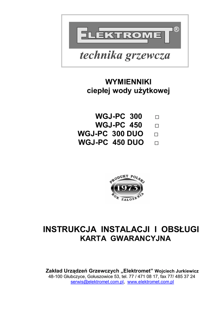 WYMIENNIKI ciepłej wody użytkowej WGJ-PC 300 WGJ-PC 450 WGJ-PC 300 DUO WGJ-PC 450 DUO □ □ □ □ INSTRUKCJA INSTALACJI I OBSŁUGI KARTA GWARANCYJNA Zakład Urządzeń Grzewczych „Elektromet” Wojciech Jurkiewicz 48-100 Głubczyce, Gołuszowice 53, tel. 77 / 471 08 17, fax 77/ 485 37 24 [email protected], www.elektromet.com.pl 1. Budowa i przeznaczenie Wymienniki typu WGJ-PC i WGJ-PC DUO jako ciśnieniowe podgrzewacze akumulacyjne, przeznaczone są do podgrzewania i przechowywania ciepłej wody użytkowej na potrzeby mieszkań, domów jedno- i wielorodzinnych, obiektów użyteczności publicznej, obiektów przemysłowych i innych we współpracy z niskotemperaturowymi wodnymi kotłami c.o., a przede wszystkim z pompą ciepła. Wymienniki WGJ-PC 300 i 450 wyposażone są w wężownicę spiralną o dużej powierzchni wymiany i pojemności, dzięki czemu następuje szybka wymiana ciepła i szybkie podgrzanie wody użytkowej. Natomiast wymienniki WGJ-PC 300 DUO i WGJ-PC 450 DUO wyposażone są w dwie wężownice o dużej powierzchni wymiany i pojemności z możliwością podłączenia do dwóch różnych źródeł wody grzewczej. Zbiorniki ciśnieniowe w tych wymiennikach wykonane są z blachy stalowej pokrytej wewnątrz warstwą specjalnej, wysokotemperaturowej emalii ceramicznej, która tworząc szklistą powłokę chroni je przed korozją i zapewnia czystą, zdrową wodę. Dodatkowym zabezpieczeniem antykorozyjnym zbiorników jest anoda magnezowa, która dzięki różnicy potencjałów elektrochemicznych stali i magnezu w wodzie generuje prąd ochronny dla zbiornika. Izolacja termiczna wykonana jest pianki polistyrenowej na stałe połączonej ze ściankami zbiornika. Zewnętrzna obudowa wymienników wykonana jest z tworzywa sztucznego typu skay. Wymienniki przystosowane są do zamontowania grzałki elektrycznej na korku 1½”, w tym szczególnie produkowanej przez ZUG ELEKTROMET grzałki typu EJK z izolowanymi elementami grzejnymi (Tab.2), które nie pobierają prądu ochronnego jaki generuje anoda magnezowa dla ochrony antykorozyjnej zbiornika. Zwiększa to trwałość zbiornika oraz żywotność anody magnezowej. Budowę i wymiary wymienników przedstawiono na Rys.1 - 4, a ich wymiary przyłączeniowe i parametry techniczne w Tab. 1 i 2. 2 Wersja 01/14 WGJ-PC Rys. 1. Budowa i wymiary wymienników WGJ-PC 300 3 Wersja 01/14 WGJ-PC Rys. 2 Budowa i wymiary wymiennika WGJ- PC 450 4 Wersja 01/14 WGJ-PC Tab. 1 Parametry techniczne wymienników WGJ-PC 300 i 450 WGJ-PC 300 WGJ-PC 450 3 300 400 2 4,7 5,5 Typ Pojemność zbiornika dm Powierzchnia wymiany ciepła m Pojemność wężownic Czas grzania 10- 65ºC Czas grzania 10- 55ºC 25 kW 12,5 kW 25 kW 12,5 kW 3 dm min min min min Parametry pracy zbiornika Parametry czynnika grzewczego Rodzaj zbiornika Rodzaj obudowy zewnętrznej 24,5 30,5 65 80 140 160 50 60 100 120 Maks. ciśn i temp. rob. pr = 0,6 MPa tr = 80°C Maks. ciśn i temp. rob. pr = 0,6 MPa tr = 100°C stalowy pokryty wewnątrz emalią ceramiczną pokrycie typu skay Izolacja termiczna z pianki polistyrenowej mm 70 100 Masa ogrzewacza w obudowie typu skay kg ok. 210 ok. 270 1880 2000 650 1840 2010 810 CW 1” 1 1/4” ZW/ZS 1” 1 1/4” Zasilanie ciepłą wodą grzewczą WE 1 1/4” 1 1/2” Powrót zimnej wody grzewczej WY 1 1/4” 1 1/2” Króciec termometru RT 1/2” 1/2” Króciec cyrkulacji RC 3/4” 1” Rurka kapilary zamknięta RK 3/8” 1/2” Króciec grzałki elektrycznej MG 1 1/2” 1 1/2” Wyczystka W 133/166/195 133/166/195 Spust Anoda magnezowa ZS 3/4” korek 2” ø40 x 430 korek 2” ø40 x 200 1 1/42” korek 2” ø40 x 500 korek 2” ø40 x 240 Wymiary mm mm mm Wysokość Max. wysokość przy przechyleniu Średnica Ciepła woda użytkowa Zimna woda użytkowa / spust górna dolna AN 5 Wersja 01/14 WGJ-PC Rys. 3. Budowa i wymiary wymienników WGJ-PC 300 DUO 6 Wersja 01/14 WGJ-PC Rys. 4. Budowa i wymiary wymienników WGJ-PC 450 DUO 7 Wersja 01/14 WGJ-PC Tab. 2 Parametry techniczne wymienników WGJ-PC 300 i 450 Typ Pojemność zbiornika dm m Powierzchnia wymiany ciepła Pojemność wężownic Czas grzania 10- 65ºC Czas grzania 10- 55ºC 3 25 kW 12,5 kW 25 kW 12,5 kW WGJ-PC 300 DUO WGJ-PC 450 DUO 300 400 3,1 + 1,35 3,55 + 1,5 17,0 + 7,3 19,4 + 8,1 2 3 dm min min min min Parametry pracy zbiornika Parametry czynnika grzewczego Rodzaj zbiornika Rodzaj obudowy zewnętrznej 65 80 140 160 50 60 100 120 Maksymalne ciśnienie i temperatura robocza pr = 0,6 MPa tr = 80°C Maksymalne ciśnienie i temperatura robocza pr = 1,6 MPa tr = 105°C stalowy pokryty wewnątrz emalią ceramiczną pokrycie typu skay Izolacja termiczna - pianka polistyrenowa mm 70 100 Masa ogrzewacza w obudowie typu skay kg ok. 200 ok. 250 1880 2000 650 1840 2010 805 Wysokość Max. wysokość przy przechyleniu Średnica Wymiary mm mm mm Ciepła woda użytkowa CW 1” 1 1/4” ZW/ZS 1” 1 1/4” WEG 1 1/4” 1 1/2” WYG 1 1/4” 1 1/2” WED 1 1/4” 1 1/2” WYD 1 1/4” 1 1/2” RT 1/2” 1/2” Króciec cyrkulacji RC 3/4” 1” Rurka kapilary zamknięta RK 3/8” 3/8” Króciec grzałki elektrycznej MG 1 1/2” 1 1/2” W 133/166/195 133/166/195 ZS górna AN dolna 3/4” korek 2” ø40 x 430 korek 2” ø40 x 200 1 1/4” korek 2” ø40 x 500 korek 2” ø40 x 240 Zimna woda użytkowa / spust Zasilanie ciepłą wodą grzewcząwężownica górna Powrót zimnej wody grzewczej wężownica górna Zasilanie ciepłą wodą grzewczą wężownica dolna Powrót zimnej wody grzewczej wężownica dolna Króciec termometru Wyczystka Spust Anoda magnezowa 8 Wersja 01/14 WGJ-PC 2. Zabezpieczenia i warunki bezpiecznego użytkowania wymienników. Wymienniki wolno eksploatować tylko ze sprawnym zaworem bezpieczeństwa o ciśnieniu otwarcia 0,6 MPa zainstalowanym na dopływie zimnej wody użytkowej. Zawór ten chroni urządzenie przed nadmiernym ciśnieniem w sieci wodociągowej lub nadmiernym wzrostem ciśnienia w wyniku nagrzania się wody znajdującej się w zbiorniku. Nawet w czasie normalnej pracy 