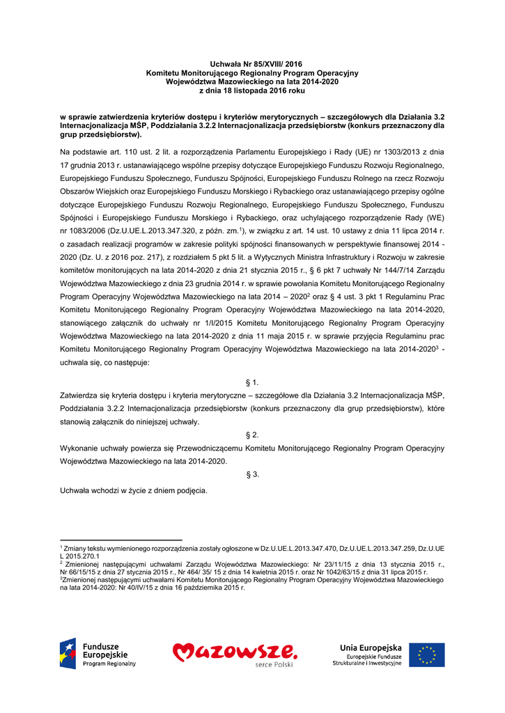Uchwała Nr 85/XVIII/ 2016 Komitetu Monitorującego Regionalny Program Operacyjny Województwa Mazowieckiego na lata 2014-2020 z dnia 18 listopada 2016 roku w sprawie zatwierdzenia kryteriów dostępu i kryteriów merytorycznych – szczegółowych dla Działania 3.2 Internacjonalizacja MŚP, Poddziałania 3.2.2 Internacjonalizacja przedsiębiorstw (konkurs przeznaczony dla grup przedsiębiorstw). Na podstawie art. 110 ust. 2 lit. a rozporządzenia Parlamentu Europejskiego i Rady (UE) nr 1303/2013 z dnia 17 grudnia 2013 r. ustanawiającego wspólne przepisy dotyczące Europejskiego Funduszu Rozwoju Regionalnego, Europejskiego Funduszu Społecznego, Funduszu Spójności, Europejskiego Funduszu Rolnego na rzecz Rozwoju Obszarów Wiejskich oraz Europejskiego Funduszu Morskiego i Rybackiego oraz ustanawiającego przepisy ogólne dotyczące Europejskiego Funduszu Rozwoju Regionalnego, Europejskiego Funduszu Społecznego, Funduszu Spójności i Europejskiego Funduszu Morskiego i Rybackiego, oraz uchylającego rozporządzenie Rady (WE) nr 1083/2006 (Dz.U.UE.L.2013.347.320, z późn. zm.1), w związku z art. 14 ust. 10 ustawy z dnia 11 lipca 2014 r. o zasadach realizacji programów w zakresie polityki spójności finansowanych w perspektywie finansowej 2014 2020 (Dz. U. z 2016 poz. 217), z rozdziałem 5 pkt 5 lit. a Wytycznych Ministra Infrastruktury i Rozwoju w zakresie komitetów monitorujących na lata 2014-2020 z dnia 21 stycznia 2015 r., § 6 pkt 7 uchwały Nr 144/7/14 Zarządu Województwa Mazowieckiego z dnia 23 grudnia 2014 r. w sprawie powołania Komitetu Monitorującego Regionalny Program Operacyjny Województwa Mazowieckiego na lata 2014 – 20202 oraz § 4 ust. 3 pkt 1 Regulaminu Prac Komitetu Monitorującego Regionalny Program Operacyjny Województwa Mazowieckiego na lata 2014-2020, stanowiącego załącznik do uchwały nr 1/I/2015 Komitetu Monitorującego Regionalny Program Operacyjny Województwa Mazowieckiego na lata 2014-2020 z dnia 11 maja 2015 r. w sprawie przyjęcia Regulaminu prac Komitetu Monitorującego Regionalny Program Operacyjny Województwa Mazowieckiego na lata 2014-20203 uchwala się, co następuje: § 1. Zatwierdza się kryteria dostępu i kryteria merytoryczne – szczegółowe dla Działania 3.2 Internacjonalizacja MŚP, Poddziałania 3.2.2 Internacjonalizacja przedsiębiorstw (konkurs przeznaczony dla grup przedsiębiorstw), które stanowią załącznik do niniejszej uchwały. § 2. Wykonanie uchwały powierza się Przewodniczącemu Komitetu Monitorującego Regionalny Program Operacyjny Województwa Mazowieckiego na lata 2014-2020. § 3. Uchwała wchodzi w życie z dniem podjęcia. Zmiany tekstu wymienionego rozporządzenia zostały ogłoszone w Dz.U.UE.L.2013.347.470, Dz.U.UE.L.2013.347.259, Dz.U.UE L 2015.270.1 2 Zmienionej następującymi uchwałami Zarządu Województwa Mazowieckiego: Nr 23/11/15 z dnia 13 stycznia 2015 r., Nr 66/15/15 z dnia 27 stycznia 2015 r., Nr 464/ 35/ 15 z dnia 14 kwietnia 2015 r. oraz Nr 1042/63/15 z dnia 31 lipca 2015 r. 3 Zmienionej następującymi uchwałami Komitetu Monitorującego Regionalny Program Operacyjny Województwa Mazowieckiego na lata 2014-2020: Nr 40/IV/15 z dnia 16 października 2015 r. 1
