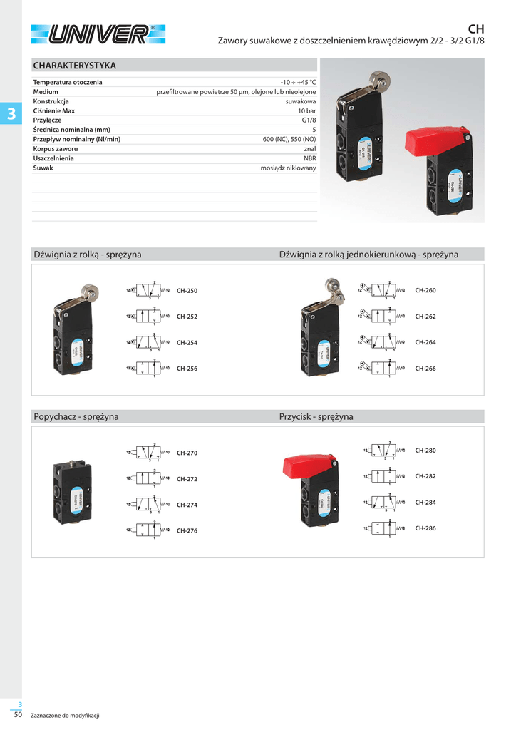CH Zawory suwakowe z doszczelnieniem krawędziowym 2/2 - 3/2 G1/8 CHARAKTERYSTYKA 3 Temperatura otoczenia Medium Konstrukcja Ciśnienie Max Przyłącze Średnica nominalna (mm) Przepływ nominalny (Nl/min) Korpus zaworu Uszczelnienia Suwak -10 ÷ +45 °C przefiltrowane powietrze 50 μm, olejone lub nieolejone suwakowa 10 bar G1/8 5 600 (NC), 550 (NO) znal NBR mosiądz niklowany Dźwignia z rolką - sprężyna Dźwignia z rolką jednokierunkową - sprężyna CH-250 CH-260 CH-252 CH-262 CH-254 CH-264 CH-256 CH-266 Popychacz - sprężyna 3 50 Zaznaczone do modyfikacji Przycisk - sprężyna CH-270 CH-280 CH-272 CH-282 CH-274 CH-284 CH-276 CH-286