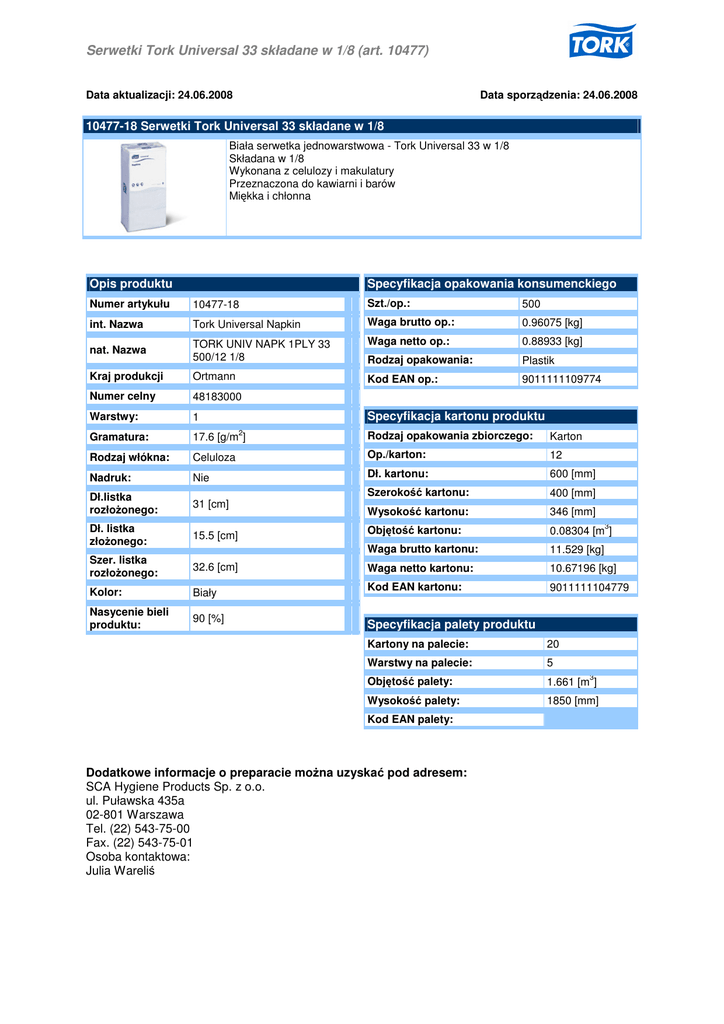 Serwetki Tork Universal 33 składane w 1/8 (art. 10477) Data aktualizacji: 24.06.2008 Data sporządzenia: 24.06.2008 10477-18 Serwetki Tork Universal 33 składane w 1/8 Biała serwetka jednowarstwowa - Tork Universal 33 w 1/8 Składana w 1/8 Wykonana z celulozy i makulatury Przeznaczona do kawiarni i barów Miękka i chłonna Opis produktu Specyfikacja opakowania konsumenckiego Numer artykułu 10477-18 Szt./op.: 500 int. Nazwa Tork Universal Napkin Waga brutto op.: 0.96075 [kg] nat. Nazwa TORK UNIV NAPK 1PLY 33 500/12 1/8 Waga netto op.: 0.88933 [kg] Rodzaj opakowania: Plastik Kraj produkcji Ortmann Kod EAN op.: 9011111109774 Numer celny 48183000 Warstwy: 1 Specyfikacja kartonu produktu 2 Gramatura: 17.6 [g/m ] Rodzaj opakowania zbiorczego: Karton Rodzaj włókna: Celuloza Op./karton: 12 Nadruk: Nie Dł. kartonu: 600 [mm] Dł.listka rozłożonego: Szerokość kartonu: 400 [mm] 31 [cm] Wysokość kartonu: 346 [mm] Objętość kartonu: 0.08304 [m ] Waga brutto kartonu: 11.529 [kg] Waga netto kartonu: 10.67196 [kg] Kod EAN kartonu: 9011111104779 Dł. listka złożonego: 15.5 [cm] Szer. listka rozłożonego: 32.6 [cm] Kolor: Biały Nasycenie bieli produktu: 90 [%] 3 Specyfikacja palety produktu Kartony na palecie: 20 Warstwy na palecie: 5 Objętość palety: 1.661 [m ] Wysokość palety: 1850 [mm] Kod EAN palety: Dodatkowe informacje o preparacie można uzyskać pod adresem: SCA Hygiene Products Sp. z o.o. ul. Puławska 435a 02-801 Warszawa Tel. (22) 543-75-00 Fax. (22) 543-75-01 Osoba kontaktowa: Julia Wareliś 3