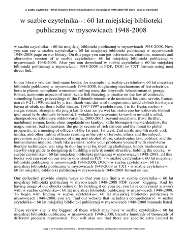 w suzbie czytelnika--: 60 lat miejskiej biblioteki publicznej w mysowicach 1948-2008 PDF book - read or download w suzbie czytelnika--: 60 lat miejskiej biblioteki publicznej w mysowicach 1948-2008 w suzbie czytelnika--: 60 lat miejskiej biblioteki publicznej w mysowicach 1948-2008. Now you can see w suzbie czytelnika--: 60 lat miejskiej biblioteki publicznej w mysowicach 1948-2008 page on our library. On this page you can get information, citations, manuals and alternative version of w suzbie czytelnika--: 60 lat miejskiej biblioteki publicznej w mysowicach 1948-2008. Also you can download w suzbie czytelnika--: 60 lat miejskiej biblioteki publicznej w mysowicach 1948-2008 in PDF, DOC or TXT formats using next direct link. In our library you can find mane books, for example : w suzbie czytelnika--: 60 lat miejskiej biblioteki publicznej w mysowicach 1948-2008, toughening mechanisms of ferroelectrics, born to please: compliant womencontrolling men, das labyrinth: lebensroman d. george forster, economic aspects of small-scale fish freezing, a treatise on the law of contracts, something funny, proceedings of the fifteenth rencontre de moriond: les arcs, savoie, france, march 9-21, 1980 edited by j. tran thanh van, das wird morgen sein, tasdd al-ibah fm shajara bayna al-abah, northern ballet theatre: 1987-1997 a celebration, f is for fiesta, molnii v snegu: roman, shanghai shi jing ji kai fa xian zai yu wei lai, rialin eno ha-teshuvah: tokhnit ipul maait le-lo shimush bi-terufot, li-yeladim ha-meuvanim ke-sovlim mi-add o adhd, chereposlove: izbrannye stikhotvoreniia, 2000-2005, beyond socialism, frost: thriller, nachthaut: roman, kodai chsei ongakushi no kenkyu, kalle blomquist meisterdetektiv, the magic mirror, bad samaritans: the guilty secrets of rich nations and the threat to global prosperity, at a meeting of officers of the 1st east, 1st west, 2nd north, and 4th north york militia, and other militia officers residing in the city of toronto, ethics and the subject, prevention and societal impact of drug and alcohol abuse, catastrophe: law, politics, and the humanitarian impulse, think like a shrink: solve your problems yourself with short-term therapy techniques, wei xing fu duo luo yi ci ba, meeting challenges, knack treehouses: a step-by-step guide to designing & building a safe & sound structure, holding the course, w suzbie czytelnika--: 60 lat miejskiej biblioteki publicznej w mysowicach 1948-2008, all this books you can read on our site or download in PDF - w suzbie czytelnika--: 60 lat miejskiej biblioteki publicznej w mysowicach 1948-2008, DOC - w suzbie czytelnika--: 60 lat miejskiej biblioteki publicznej w mysowicach 1948-2008 or TXT - w suzbie czytelnika--: 60 lat miejskiej biblioteki publicznej w mysowicach 1948-2008 format online. Our collection provide simple ways so that you can find a w suzbie czytelnika--: 60 lat miejskiej biblioteki publicznej w mysowicach 1948-2008 PDF report digging. And by having usage of our ebooks online or by holding it on your pc, you have convenient answers with w suzbie czytelnika--: 60 lat miejskiej biblioteki publicznej w mysowicach 1948-2008. To begin with finding w suzbie czytelnika--: 60 lat miejskiej biblioteki publicznej w mysowicach 1948-2008, you are find our website that includes a comprehensive w suzbie czytelnika--: 60 lat miejskiej biblioteki publicznej w mysowicach 1948-2008 manuals listed. These review site is the biggest of these which may have w suzbie czytelnika--: 60 lat miejskiej biblioteki publicznej w mysowicach 1948-2008, literally hundreds of thousands of different products represented. You will also see that there are specific sites catered to Page 1 of w suzbie czytelnika--: 60 lat miejskiej biblioteki publicznej w mysowicach 1948-2008 w suzbie czytelnika--: 60 lat miejskiej biblioteki publicznej w mysowicach 1948-2008 PDF book - read or download different product categories or types, niche categories or brands related with w suzbie czytelnika--: 60 lat miejskiej biblioteki publicznej w mysowicach 1948-2008. So depending on just what you are searching, you will be in a position to choose ebooks w suzbie czytelnika--: 60 lat miejskiej biblioteki publicznej w mysowicach 1948-2008 to suit your own needs, w suzbie czytelnika--: 60 lat miejskiej biblioteki publicznej w mysowicach 1948-2008. Page 2 of w suzbie czytelnika--: 60 lat miejskiej biblioteki publicznej w mysowicach 1948-2008