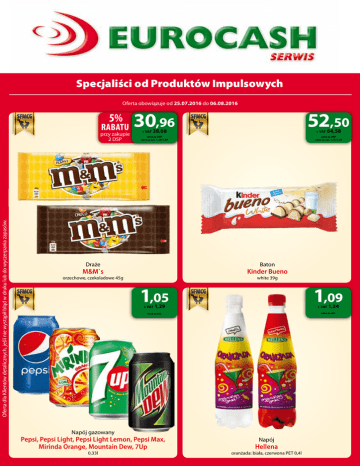 Specjaliści od Produktów Impulsowych Oferta obowiązuje od 25.07.2016 do 06.08.2016 5% RABATU Oferta dla Klientów detalicznych, jeśli nie wystąpił błąd w druku lub do wyczerpania zapasów. przy zakupie 2 DSP 30 00,96 00 52,50 cena za DSP cenaza zaszt. szt.1,29/1,59 0,00/000 cena cena za DSP cena za szt. 1,75/2,15 + +VAT VAT38,08 000 Draże + VAT Baton M&M`s Kinder Bueno orzechowe, czekoladowe 45g white 39g 1,05 1,09 cena za szt. cena za szt. + VAT 1,29 + VAT Napój gazowany Pepsi, Pepsi Light, Pepsi Light Lemon, Pepsi Max, Mirinda Orange, Mountain Dew, 7Up 0,33l 64,58 Napój Hellena oranżada: biała, czerwona PET 0,4l 1,34 Specjaliści od Produktów Impulsowych Oferta obowiązuje od 25.07.2016 do 06.08.2016 35,64 22,80 cena za DSP cena za szt. 0,99/1,22 cena za DSP cena za szt. 0,95/1,17 + VAT 43,84 Baton + VAT Baton Kit Kat Karmelove chunky, chunky white, peanut butter 40-42g słodko-słony, orzechowy 40g 22,68 26,24 cena za DSP cena za szt. 0,63/0,77 cena za DSP cena za szt. 0,82/1,01 + VAT 27,90 + VAT 32,28 Wafle Wafle Mega Grześki Grześki kakaowe w czekoladzie deserowej, toffi w czekoladzie mlecznej, orzechowe w czekoladzie mlecznej, kakaowe w mlecznej czekoladzie 48g w czekoladzie, toffi w czekoladzie 36g 7,49 7,99 cena za szt. cena za szt. + VAT 9,21 + VAT Czekolada Czekolada mleczna, caramel, schoko&keks, triolade, oreo 280-300g z całymi orzechami, toffee wholenuts 300g Milka 28,04 Milka 9,83 Specjaliści od Produktów Impulsowych Oferta obowiązuje od 25.07.2016 do 06.08.2016 1,99 55,99 cena za sztukę cena za szt. 2,59 1,69 cena za szt. cena za szt. + VAT 2,45 + VAT 68,87 Czekolada Goplana klasyczna gorzka, oryginalna mleczna 90g + VAT 3,19 Ciastka Holenderskie SAN półsłodkie 168g 2,49 15,48 cena za szt. cena za DSP cena za szt. 1,29/1,59 + VAT Holenderskie SAN w czekoladzie 188g 2,08 Herbatniki Hit kokosowe, czekoladowe, waniliowe, orzechowe, karmelowe, borówkowe, creme brulee 220g Herbatniki + VAT 3,06 + VAT Ciastka Chipicao biscuit 50g 19,04 Specjaliści od Produktów Impulsowych Oferta obowiązuje od 25.07.2016 do 06.08.2016 10% RABATU przy zakupie 20 sztuk 00 1,1900 4,99 cena za DSP cena za szt. cena za szt. 0,00/000 cena za szt. ++VAT VAT 1,46 000 + VAT Rogalik Bombonierka jabłko z cynamonem, kakao, owoce leśne 80g 125g 7 Day’s Borseto Toffifee 20,99 7,59 cena za szt. cena za szt. + VAT 25,82 + VAT 9,34 TY ABA E L A R E CI KOW STAWI T A D OD O D J PR Z E A Bombonierka PY T Alpejskie Mleczko Bombonierka Merci waniliowe, czekoladowe, caramel, happy cow 330-350g 400g 1,99 19,99 cena za szt. cena za szt. + VAT 2,45 + VAT Żelki Guma rozpuszczalna świnki owocowe, ptak owocowy-cola 100g tuba A50 Angry Birds 6,14 Maoam 24,59 Specjaliści od Produktów Impulsowych Oferta obowiązuje od 25.07.2016 do 06.08.2016 0,65 2,39 cena za szt. cena za szt. + VAT 0,80 Paluszki 2,94 Krakersy Aksam Beskidzkie Lajkonik Super z solą, serowo-cebulowe 60-70g 180g 1,99 1,39 cena za szt. cena za szt. + VAT 2,45 + VAT 1,46 Zupa Rurki smakowe do mleka Knorr Nudle Quick Milk ser w ziołach, amore pomidore, gulasznikoff, diabolo pomidoro 61-65g mix 30g 5% RABATU przy zakupie 3 zgrzewek Napój energetyczny Black Energy Drink 250ml + VAT 00 1,29 00 0,99 cena za DSP cena za szt. cena za szt. 0,00/000 cena za szt. ++ VAT VAT 1,59 000 + VAT Woda Kropla Beskidu niegazowana, gazowana 0,5l 1,22 Specjaliści od Produktów Impulsowych Oferta obowiązuje od 25.07.2016 do 06.08.2016 1,05 + VAT 0,94 biała, czerwona 0,25l 1,29 + VAT cena za szt. 1,16 cena za szt. 1,19 czerwona 0,275l + VAT 1,46 cena za szt. Napój Woda niegazowana Hellena Kropla Beskidu oranżada: biała, czerwona puszka 0,25l; oranżada czerwona szkło 0,275l cytrynowa, jabłkowa, truskawkowa 0,5l 0,89 3,25 cena za szt. cena za szt. + VAT 0,93 + VAT 3,41 Napój Tymbark Napój jabłko-mięta, wiśnia-jabłko, pomarańcza-brzoskwinia, malina-mięta, jabłko-brzoskwinia, cytryna-mięta, jabłko-arbuz 0,25l Tymbark jabłko: antonówka, champion, jonagold 1l 1,15 2,99 cena za szt. cena za szt. + VAT 1,41 + VAT 3,68 Napój gazowany Coca Cola, Coca Cola Zero, Cherry Coke, Sprite, Fanta Orange 0,33l Napój gazowany Coca-Cola, Coca-Cola Zero, Sprite, Fanta Orange 1,5l Dane historyczne wskazują, że te produkty rotują najszybciej i pomagają zwiększyć zysk! Orbit Spearmint GUMA ORBIT SPEARMINT DRAŻETKI x10 Winterfresh® Original GUMA WINTERFRESH DRAŻETKI x10 Orbit Peppermint GUMA ORBIT PEPPERMINT DRAŻETKI X10 Airwaves® Cassis GUMA AIRWAVES CASSIS +VIT.C DRAŻE X10 Orbit Spearmint GUMA ORBIT SPEARMINT SASZETKA DRAŻETKI X25 Orbit White Fresh Mint GUMA ORBIT WHITE FRESH MINT DRAŻETKI X10 Orbit Apple GUMA ORBIT APPLE DRAŻETKI X10 Orbit for Kids Classic GUMA ORBIT KINDER CLASSIC 5 LISTKÓW Skittles Fruits (torebka 38 g) CUK.SKITTLES FRUITS 38G 35,70 + VAT 38,56 cena za DSP cena za szt. 1,19/1,29 35,70 + VAT 38,56 cena za DSP cena za szt. 1,19/1,29 35,70 + VAT 38,56 cena za DSP cena za szt. 1,19/1,29 39,00 + VAT 42,12 cena za DSP cena za szt. 1,30/1,40 40,70 + VAT 43,96 cena za DSP cena za szt. 1,85/2,00 35,70 + VAT 38,56 cena za DSP cena za szt. 1,19/1,29 35,70 + VAT 38,56 cena za DSP cena za szt. 1,19/1,29 14,60 + VAT 15,77 cena za DSP cena za szt. 0,73/0,79 15,68 + VAT 19,29 cena za DSP cena za szt. 1,12/1,38 Asortyment Wrigley Orbit® Spearmint GUMA ORBIT SPEARMINT SASZETKA DRAŻE X25 Orbit® Spearmint GUMA ORBIT SPEARMINT DRAŻE x10 Winterfresh® Original GUMA WINTERFRESH DRAŻE x10 Orbit Peppermint GUMA ORBIT PEPPERMINT DRAŻE X10 Airwaves® Cassis GUMA AIRWAVES CASSIS +VIT.C DRAŻE X10 Orbit White Spearmint GUMA ORBIT WHITE SPEARMINT DRAŻE X10 Orbit Peppermint GUMA ORBIT PEPPERMINT SASZETKA DRAŻE X25 Orbit White Freshmint G.ORBIT*WHITE FR.MIN.SASZETKA DRAŻE X25 Airwaves Cassis GUMA AIRWAVES CASSIS SASZETKA DRAŻE X21 Orbit Strongmint GUMA ORBIT STRONGMINT 5 LISTKÓW Orbit Strawberry GUMA ORBIT WILD STRAWBERRY DRAŻE X10 Airwaves Menthol – Eucalyptus GUMA AIRWAVES MENTHOL-EUCAL.DRAŻE X10 Orbit Bubblemint GUMA ORBIT BUBBL